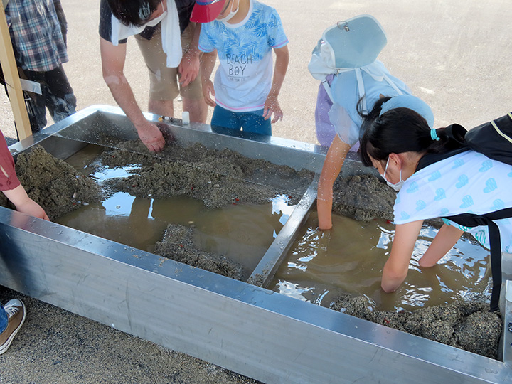 屋外では、砂の中から苗木産の小さな水晶をさがす「ストーンハンティング(水晶さがし)」、砂と水の中からきれいな石をさがす「ジェムストーンさがし」、プロの道具を使ってみかげ石を割る「石割体験」を開催しました。