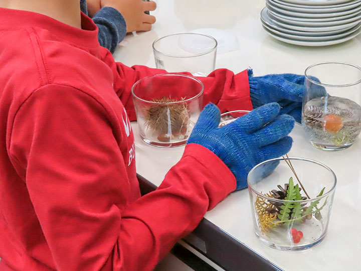 今回は、秋の森の素敵をさがして、心や体に「ふーにゅう」し(とりこみ)、森の木の実などをジェルに「ふーにゅう」(封入)した作品(ハーバリウム)をつくりました。
