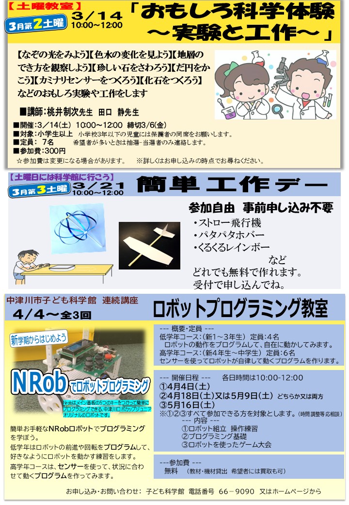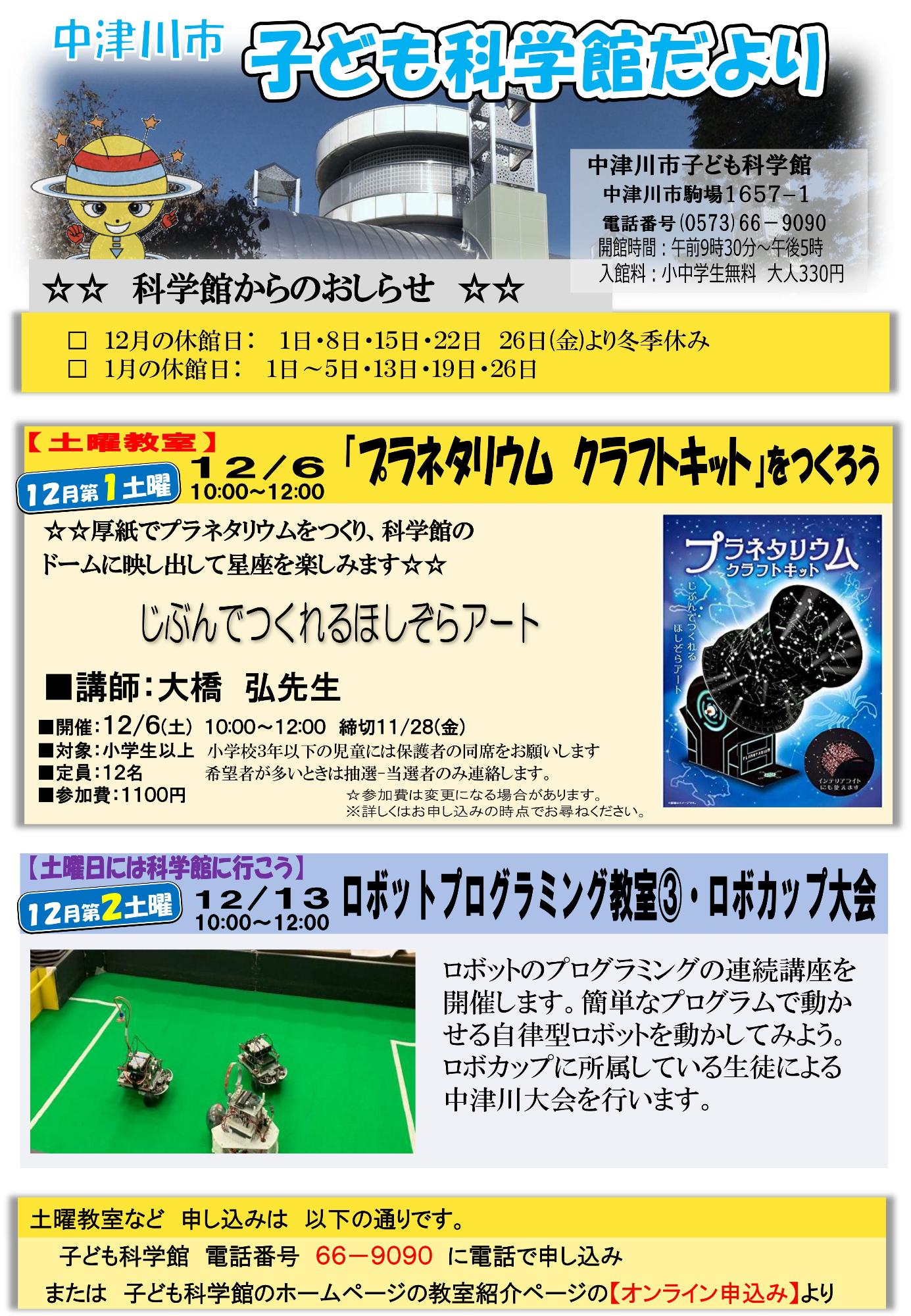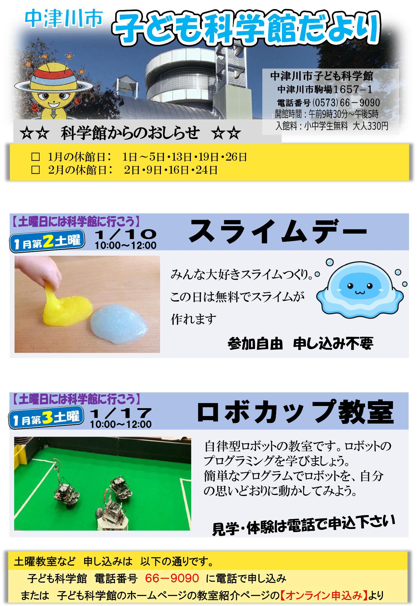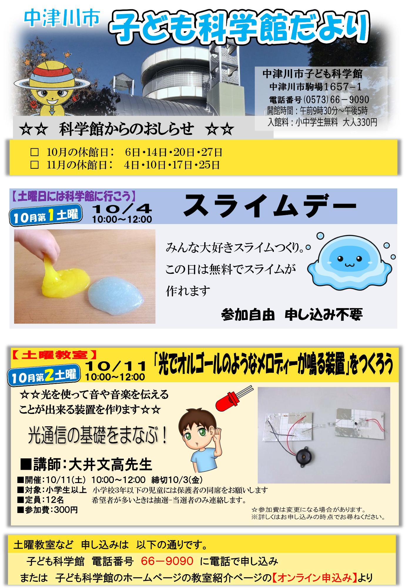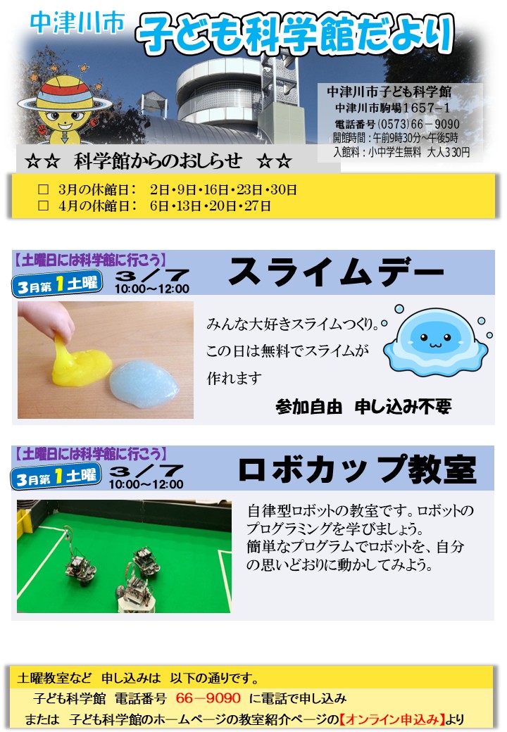子ども科学館だより 子ども科学館だより 中津川市子ども科学館 〒508-0011 岐阜県中津川市駒場1657-1電話番号0573-66-9090ファックス0573-66-9171メールによるお問い合わせ