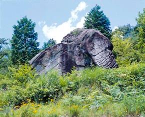 長い年月の風雨によってできたユニークなその形は今にもパオ~と鳴きそうな象のようです。石の里蛭川にはこの「象岩」をはじめ、見る人を楽しませる岩が点在しています。恵那峡大橋を蛭川方面に渡って最初の交差点を右へ、ひるかわゴルフ場方面に50メートルほど進んだ左手にあります。