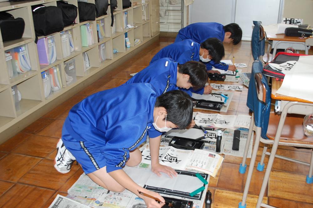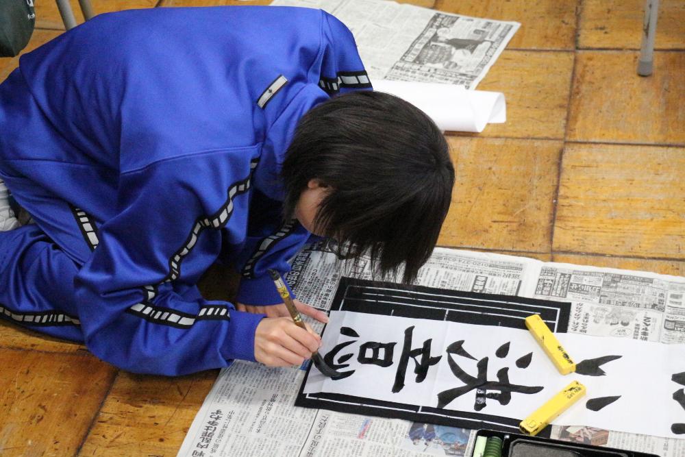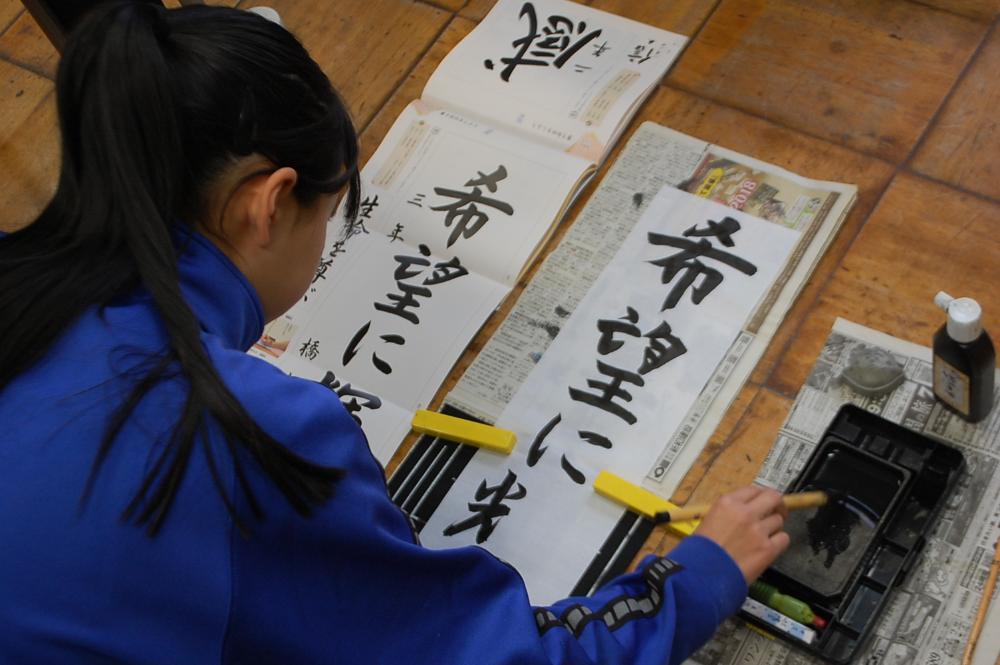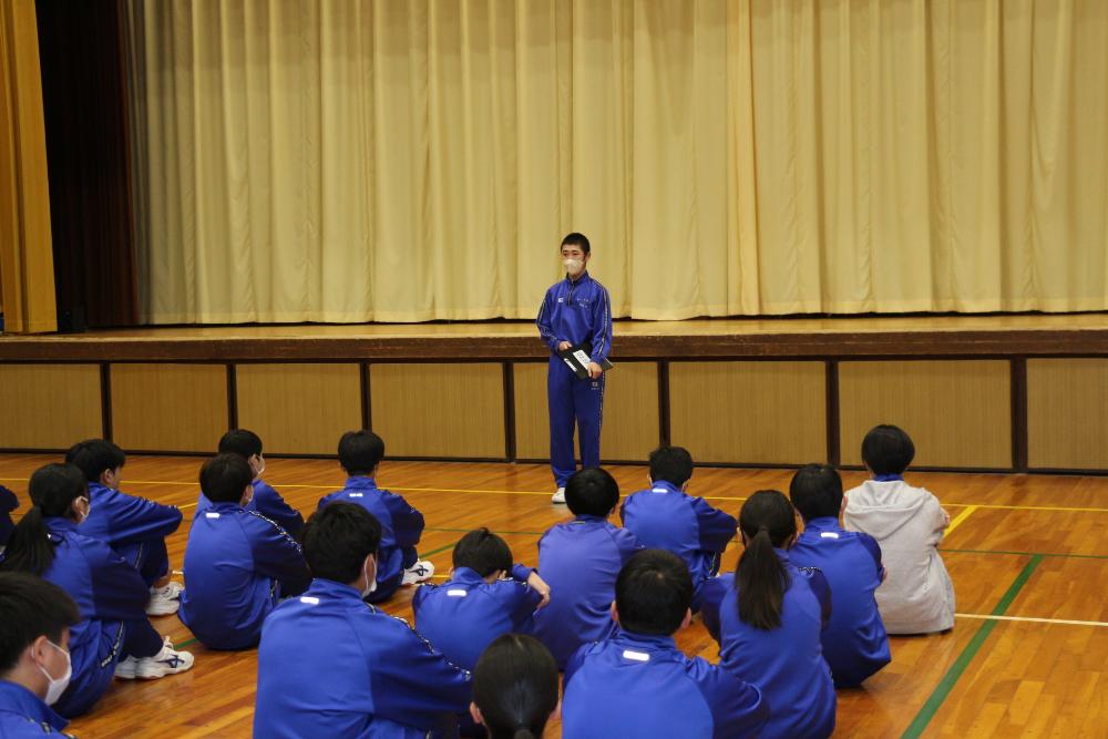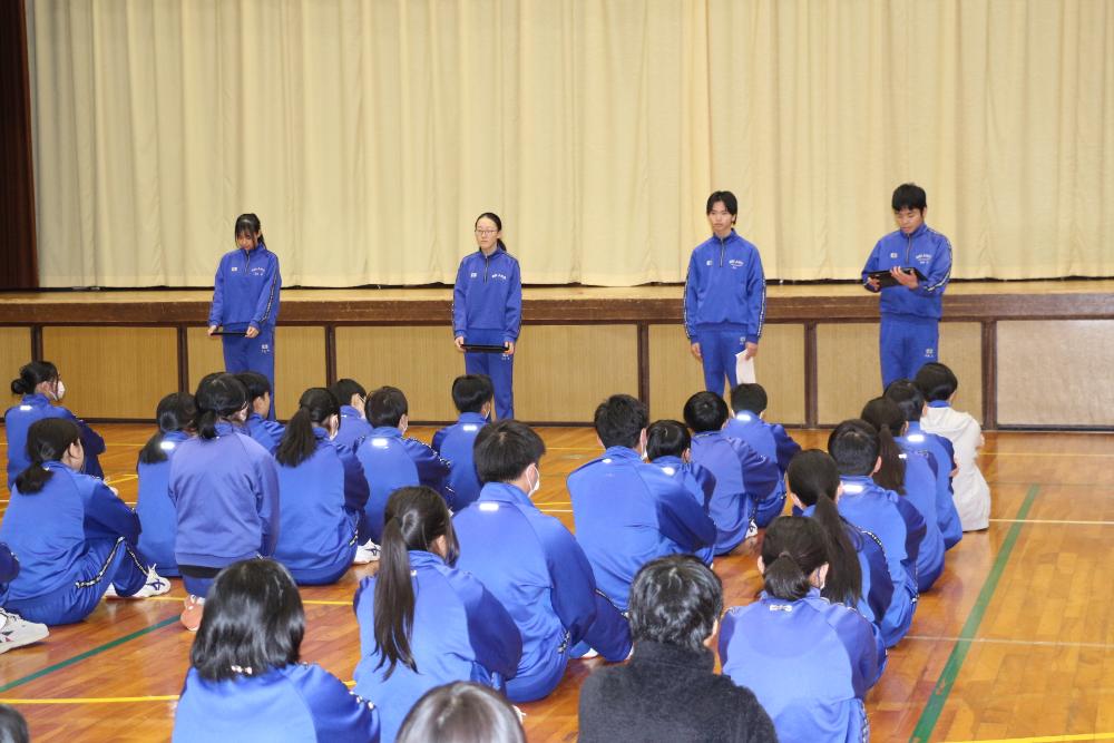 書き初め大会 更新日:2026年01月08日 令和8年が始まりました。第5期全校朝会では、生徒会長と各委員長からこれまでの活動の振り返りと今後の取組について話がありました。真剣な眼差しで話しを聞く姿勢からは、新年のスタートに賭ける気持ちが伝わってきました。集会後は、学年ごとに冬休みの思い出や新年の抱負を語り、最後に書き初め大会を実施しました。 生徒会長の話 各委員長の話