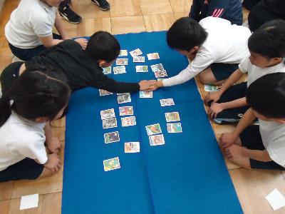 3年生では、集中して読み句を聞き、瞬時に札をとっていました。また、判定が微妙な時は、じゃんけんで誰が札をもらえるのかを決めていました。