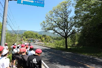 蛭川めぐり高学年 更新日:2025年05月08日 蛭川めぐりの一番長いコースを歩くのは56年生です。田原神社→一ノ瀬ヒトツバタゴ→みはらし台運動公園→学校のルートで歩きましt。途中でカモシカにも出会いました。蛭川にはとてもすてきな場所がたくさんあります。車で行けばあっという間ですが、歩いてみるといろいろな発見があります。 蛭川にもよいところがたくさんあるね 暑いけれど、がんばります。仲間と声を掛け合います。 田原神社の境内を散策します。この神社は大きな岩の上に建っています。 橋の上を通っていた時、カモシカに出会いました。