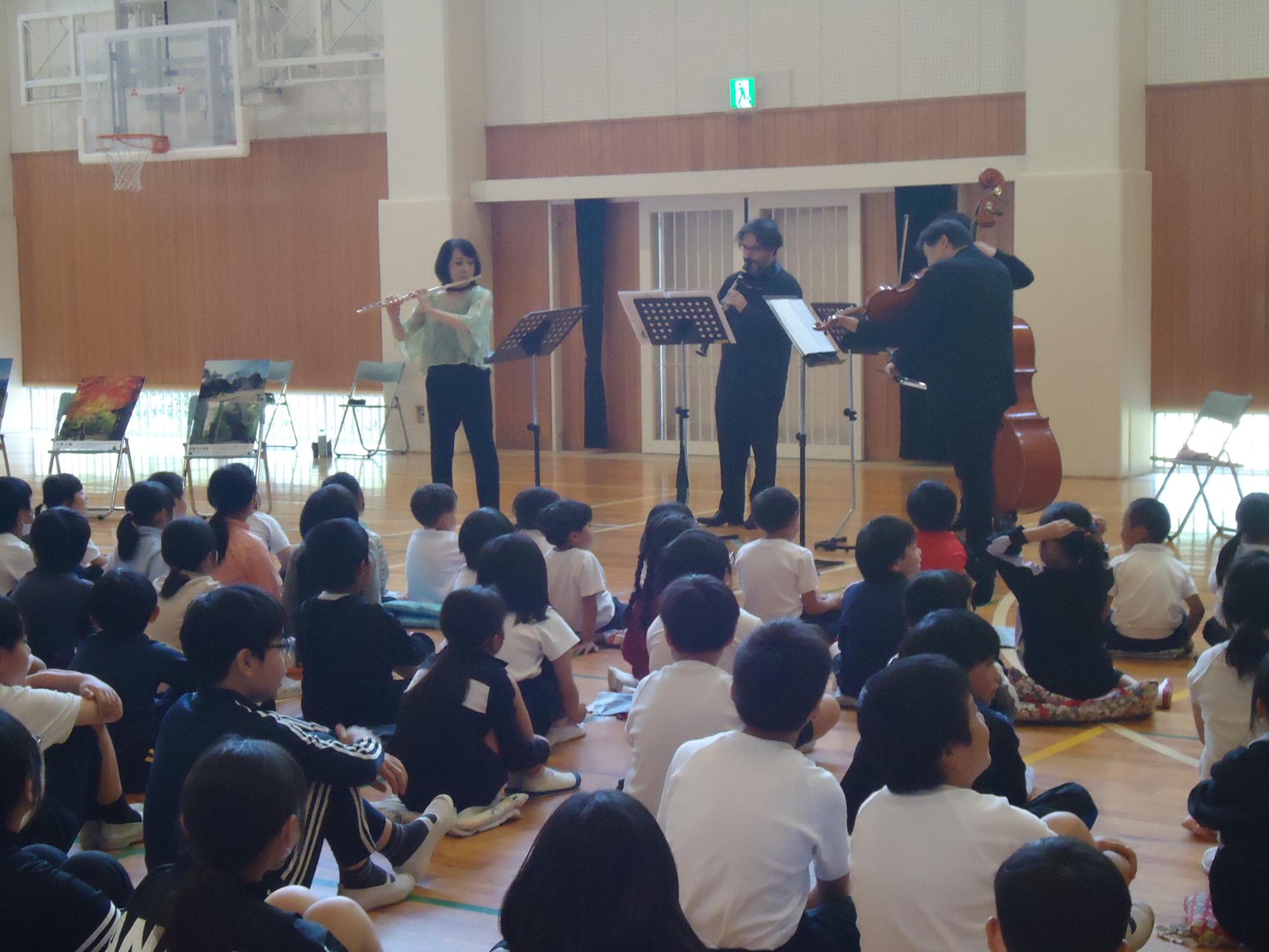 新日本フィルハーモニー楽団の『ビオラ奏者 吉鶴さん』とお仲間奏者の方をお招きして、音楽鑑賞会を行いました。フルートとコントラバスとクラリネットとビオラのカルテットです。