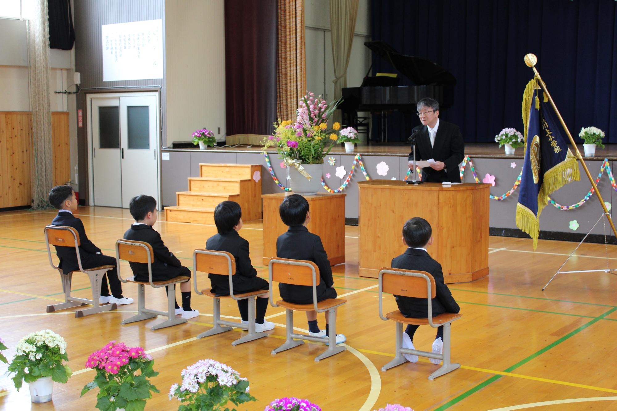 令和7年度入学式 更新日:2025年04月14日 4月8日に令和7年度の入学式を行いました。今年度は5名の元気な男の子が入学しました。5人の新入生は、元気よく体育館に入場すると校歌や学校長の話をとても姿勢よく聞くことができました。また、担任が名前を呼ぶと元気よく返事をすることができました。 5人の新入生からは、「小学校でがんばるぞ」という意欲を感じました。小学校生活に早く慣れて、楽しい小学校生活をおくってほしいと思います。