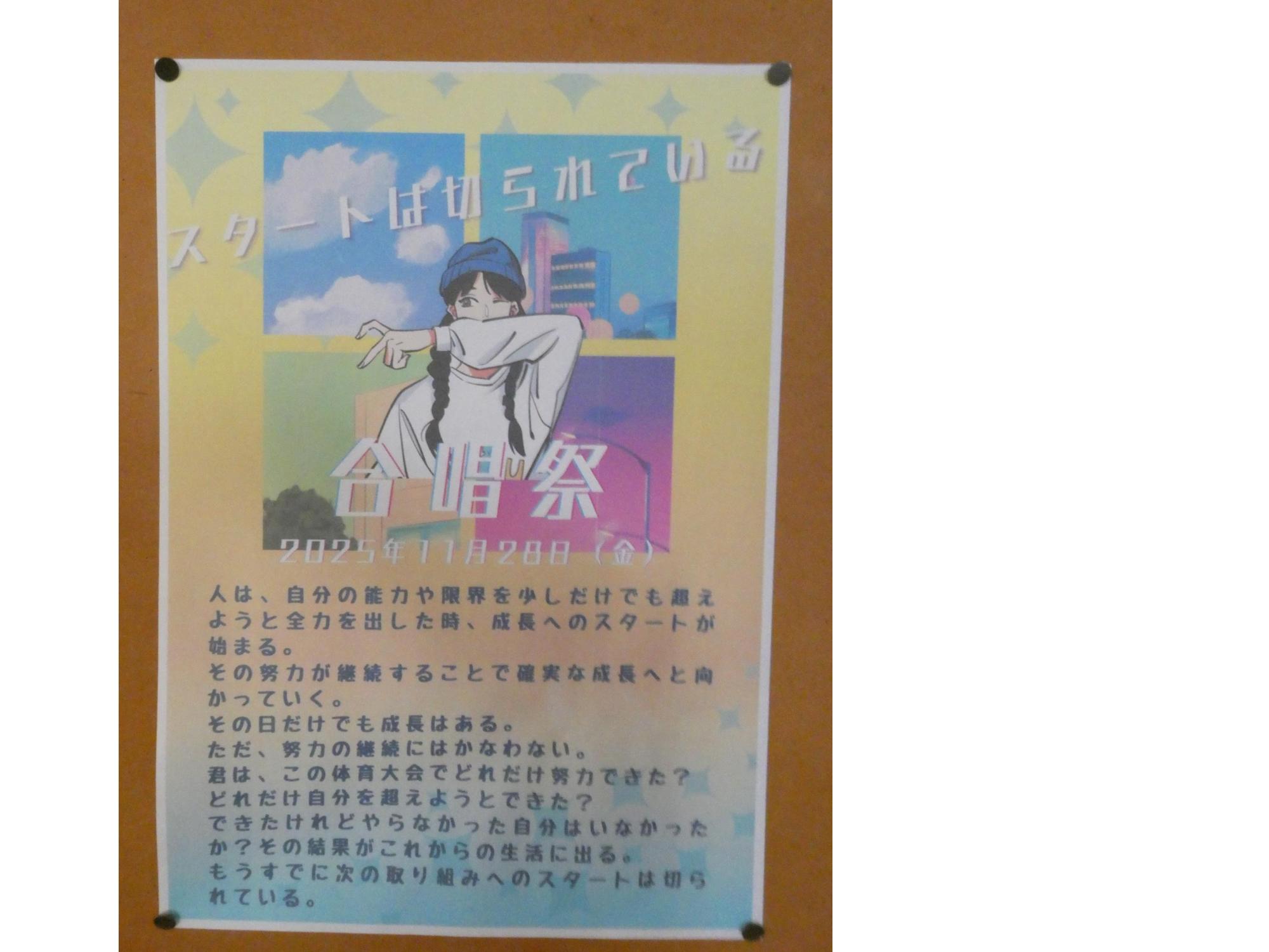 1年生の教室の廊下には、スクール・サポートの山際さんが作ってくれた合唱祭に向けたポスターが掲示されています。私が言ったこと、書いた言葉などを引用して、素敵なポスターを作ってくれました。2・3年生のポスターには、去年の合唱祭の写真。1年生のは写真じゃなくこんな感じ。
