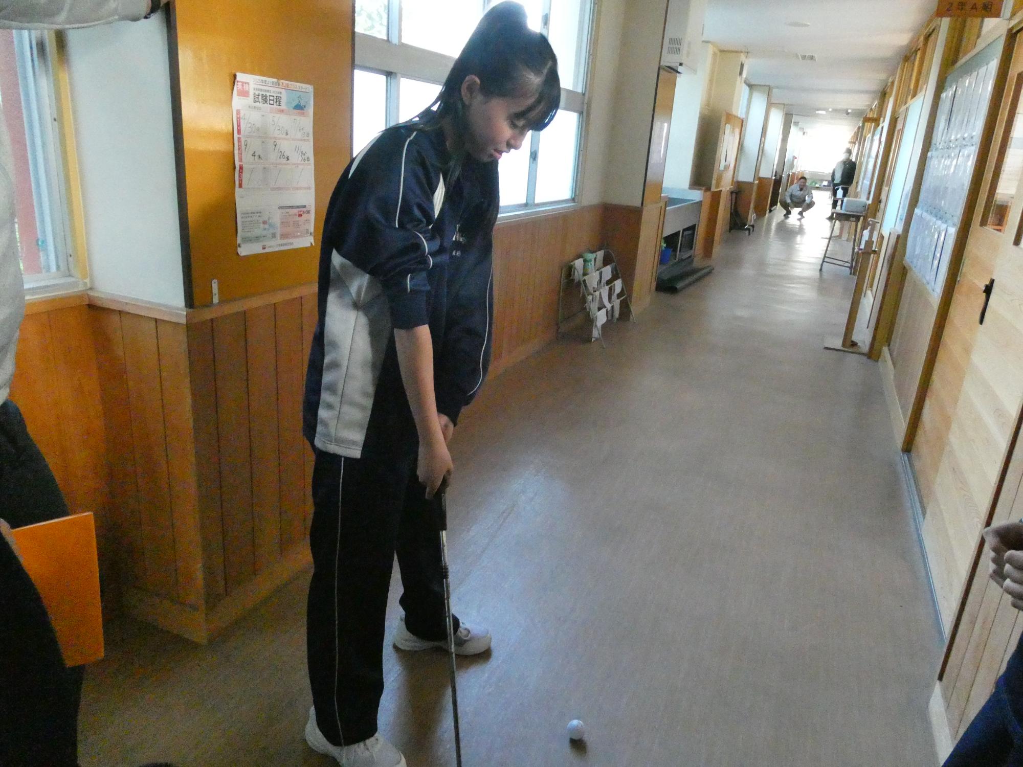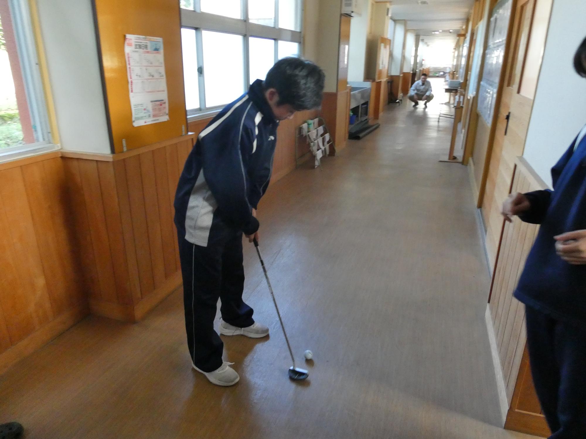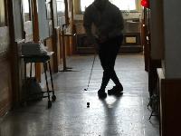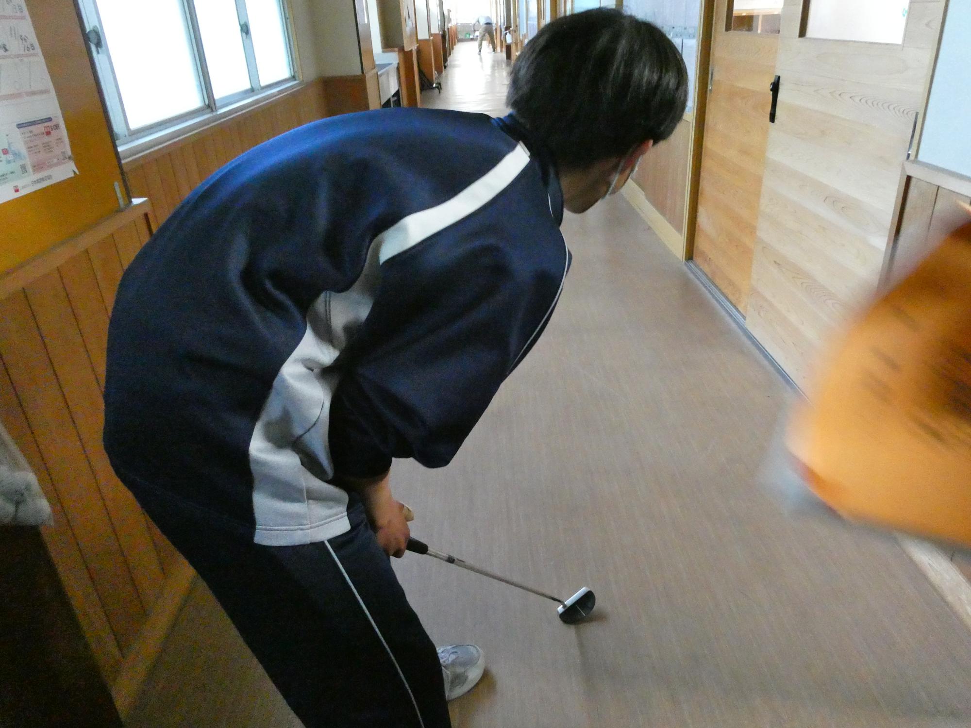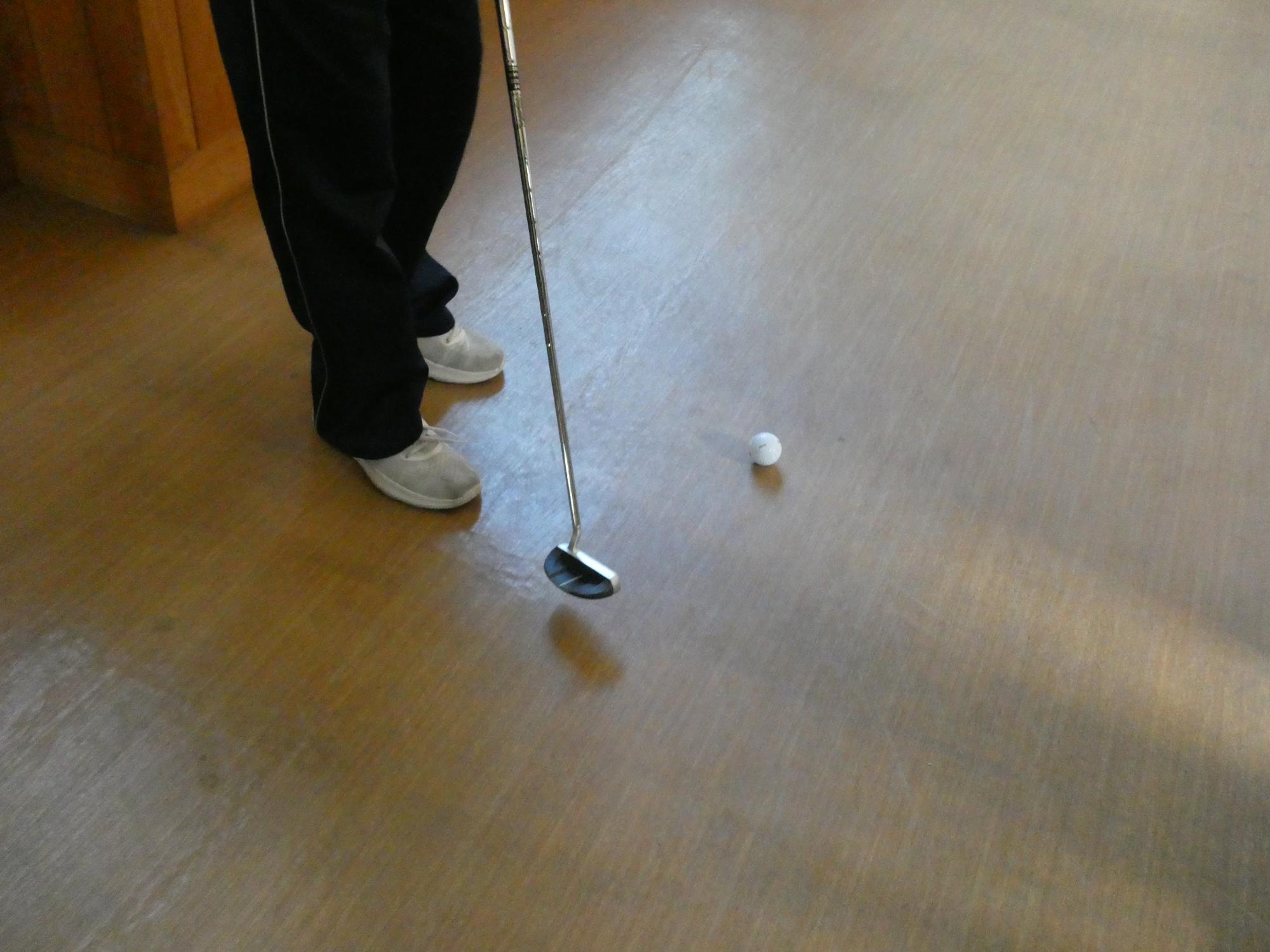 廊下が長すぎるので、2/3のところからパターで打って、壁や障害物にぶつかることなく、突き当りまでとどければゴール