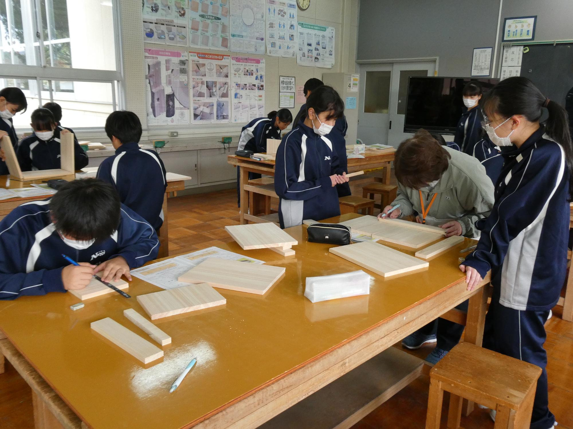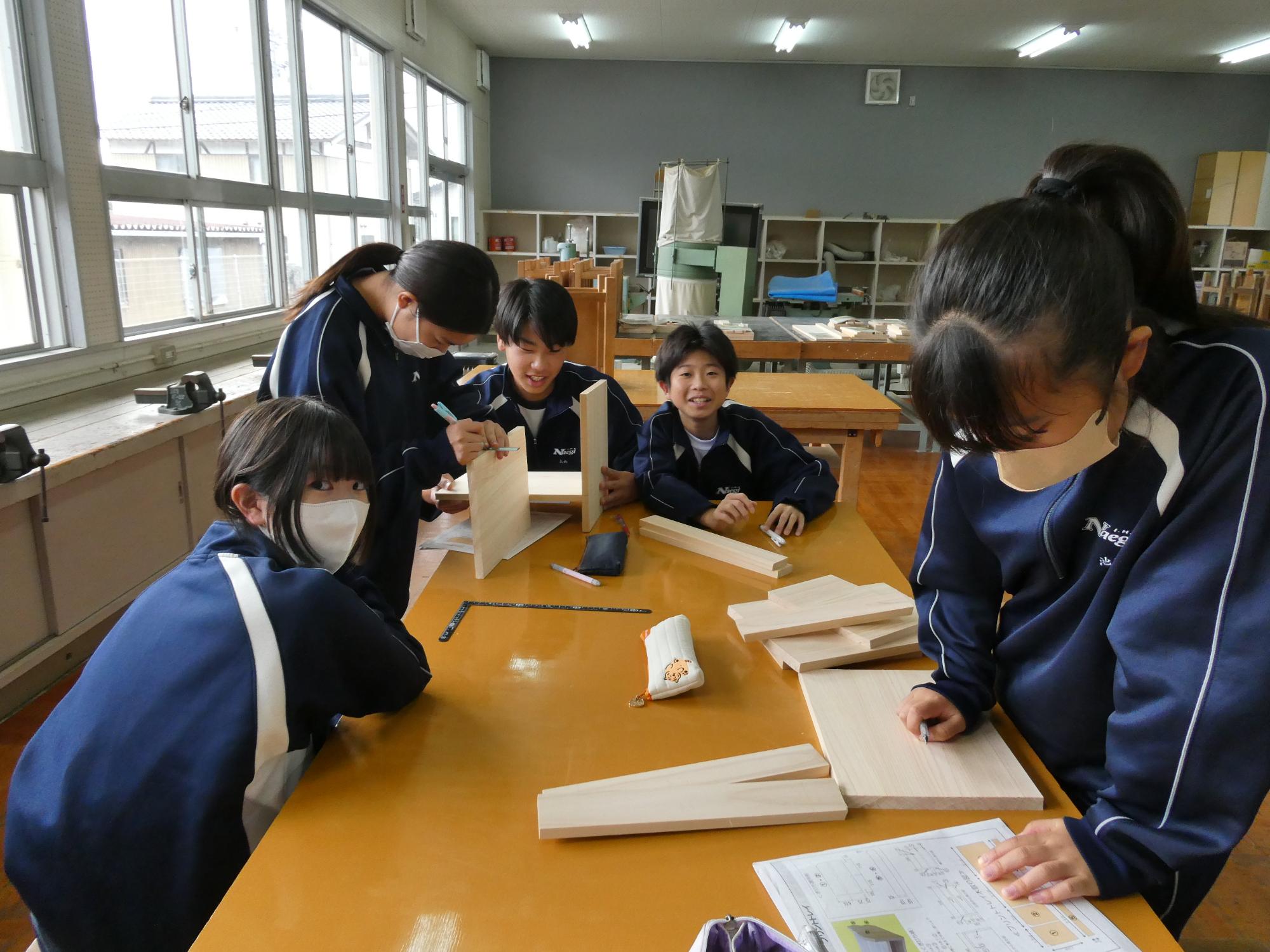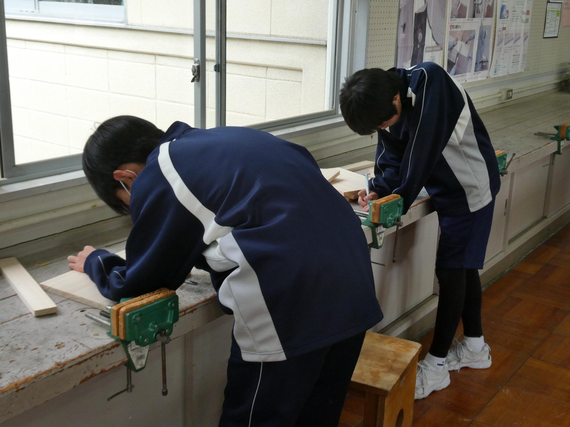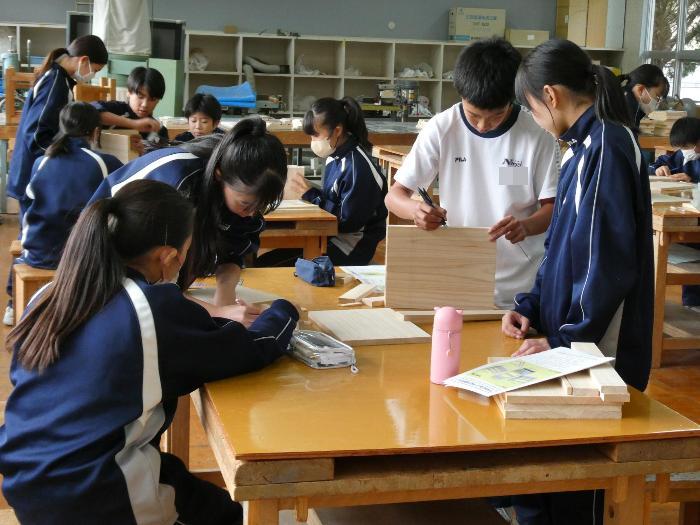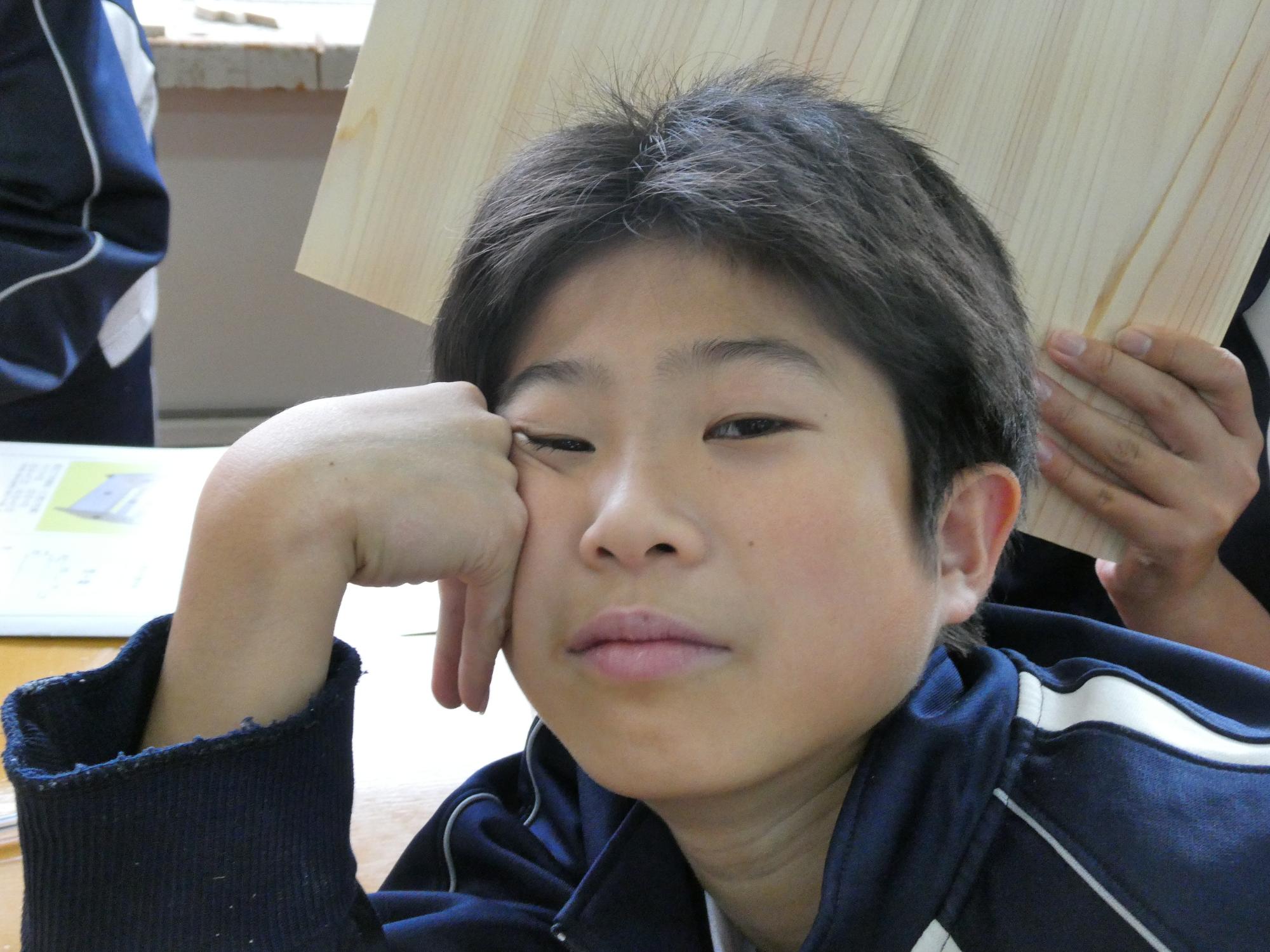 サイズを計って、木材に線を引き、ノコギリでカットする。まずはここまでのようです。もうできてしまってピースしてる子もいれば、今、木材に線を引いている子もいました。