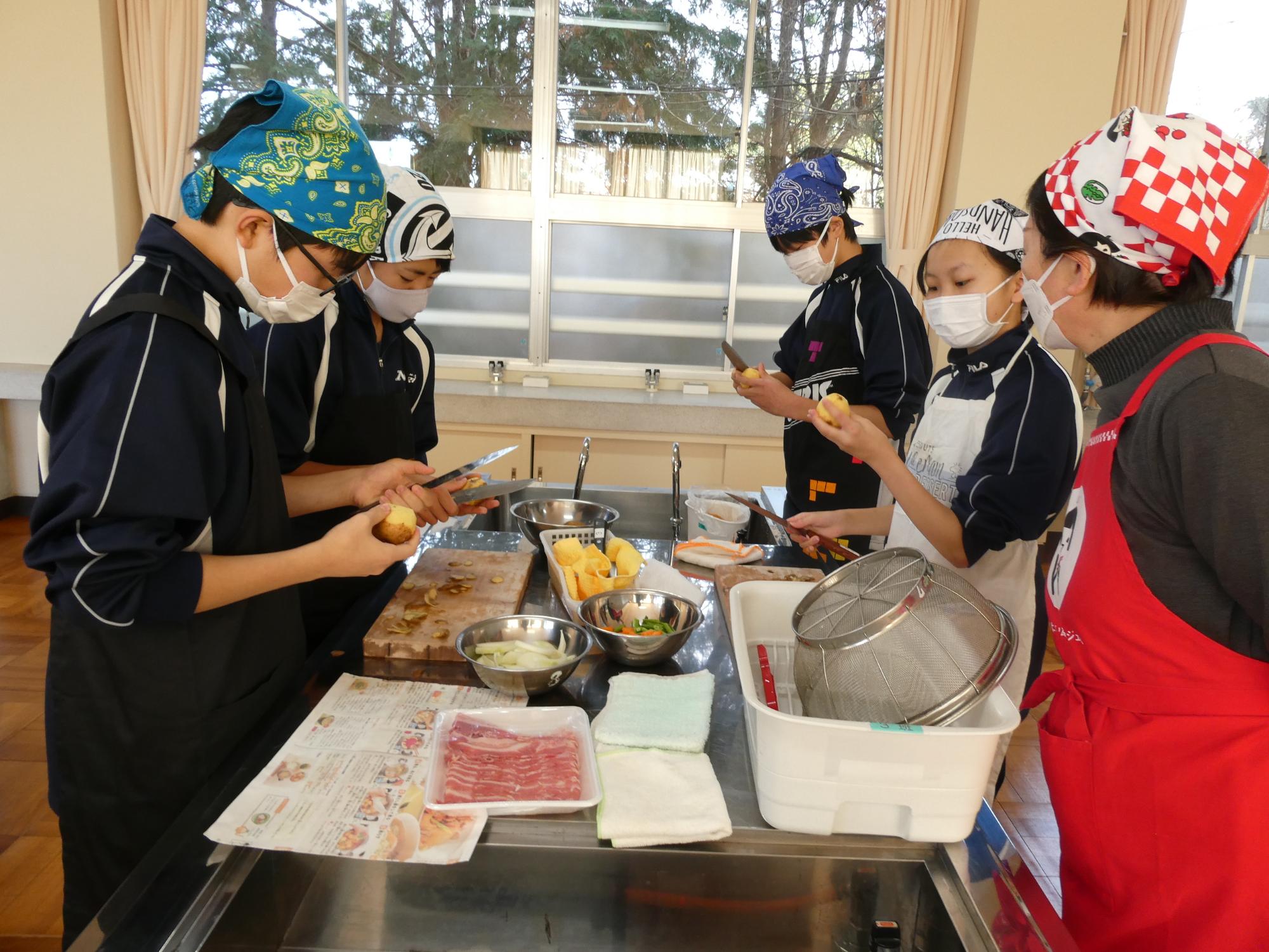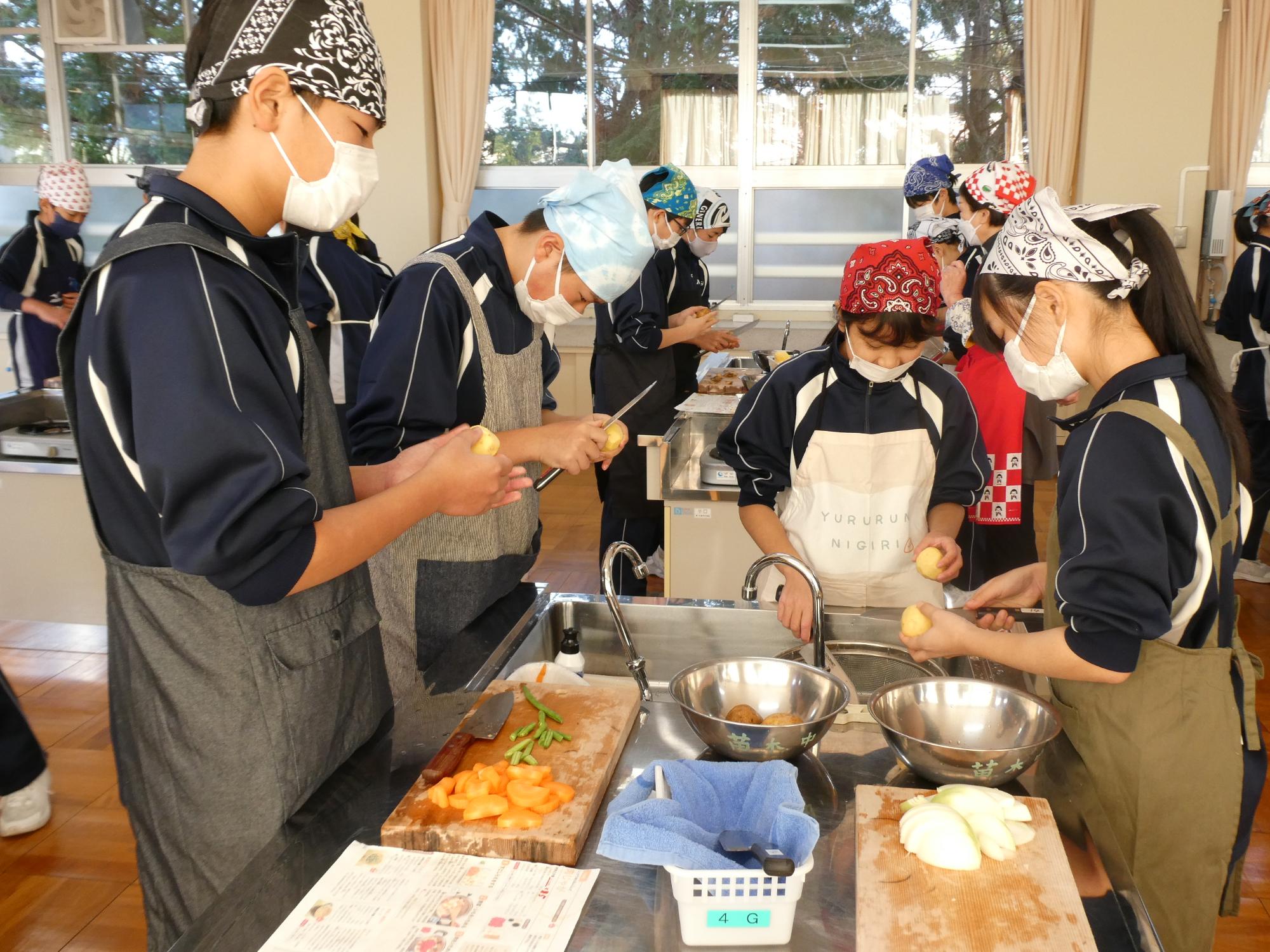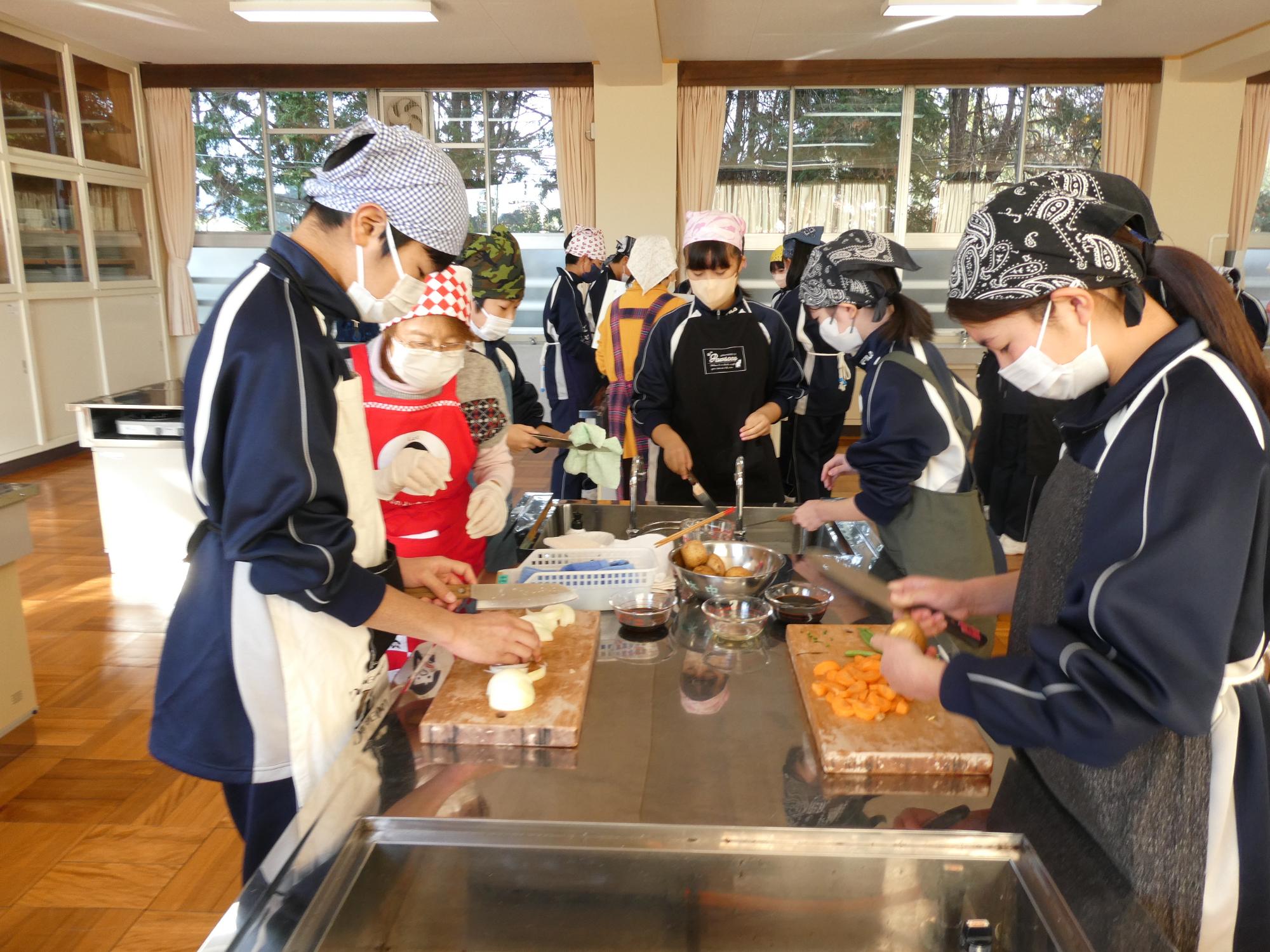 今日の1・2時間目は家庭科の調理実習です。何を作るかというと、「肉じゃが」です。去年いただいた肉じゃが(現2年生の実習料理)は、ジャガイモが一部分シャキシャキしてました(笑)歯ごたえがありました(笑)去年は何人かの先生たちがヘルプに入っていましたが、今年は、JA食農リーダーの皆さんがヘルプに来てくださいました。本当に助かりました。ありがとうございました。