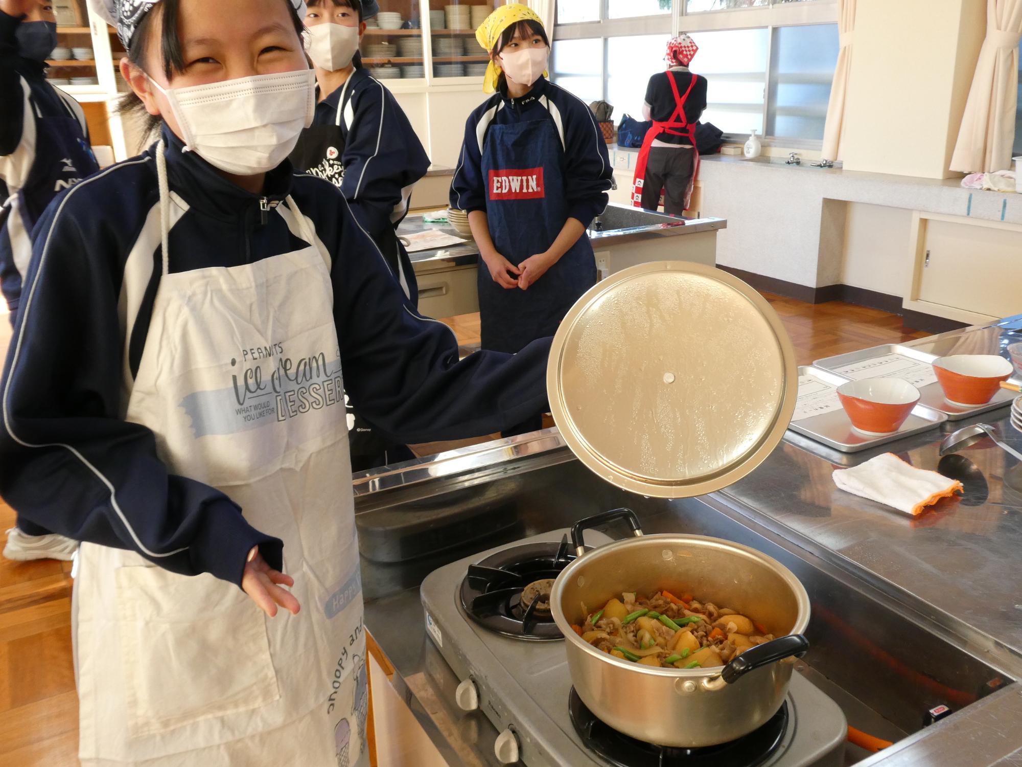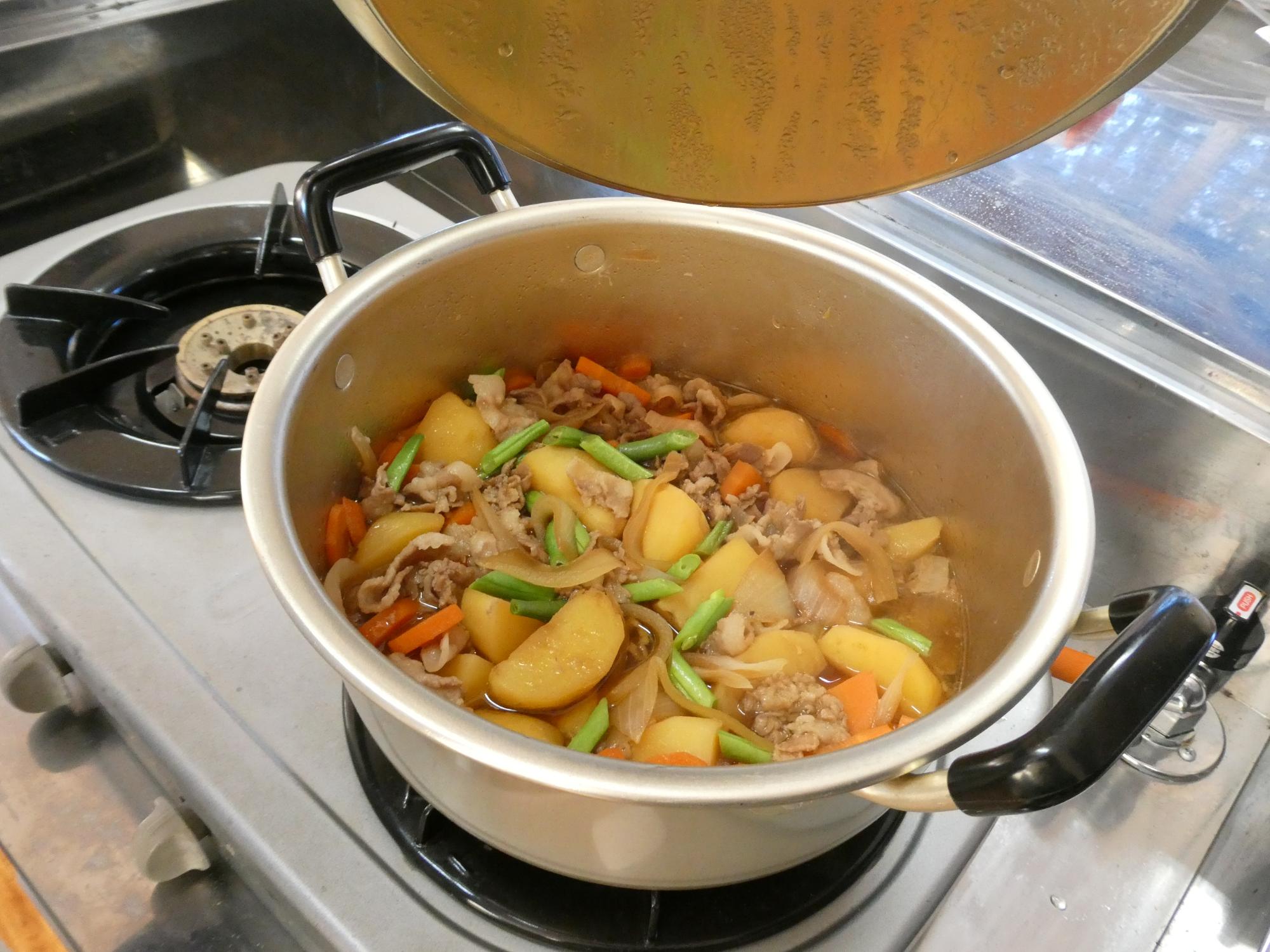 具材を炒めて水や調味料を入れていくのですが、そのタイミングが分からず、どこもあたふたしていました。私は心の中で言っていました。(テキトーで大丈夫!煮物だから)