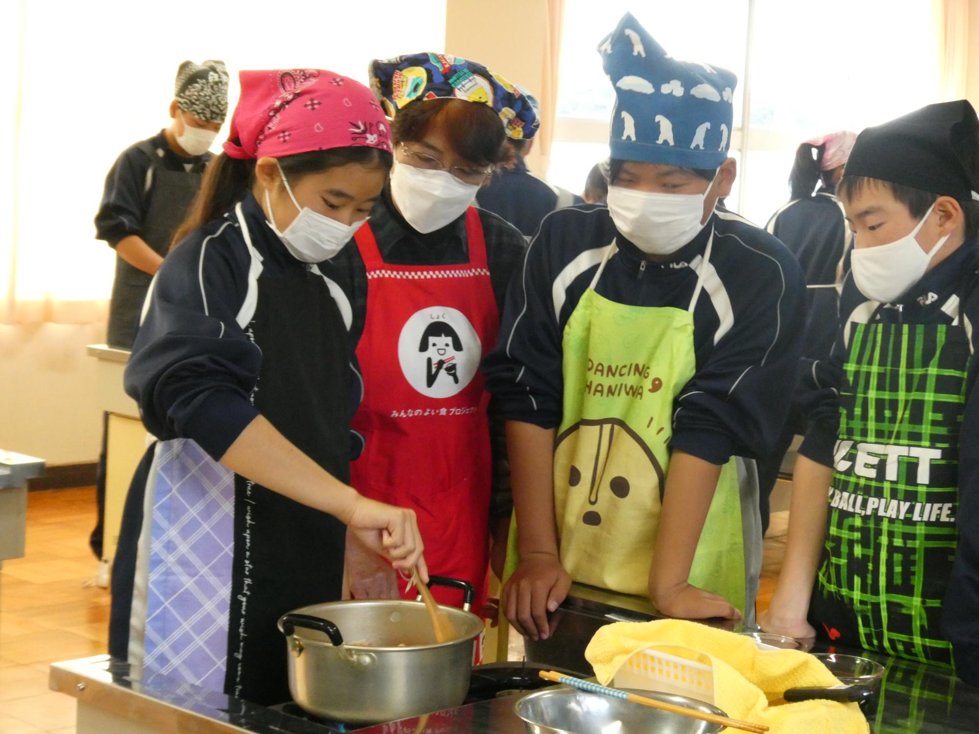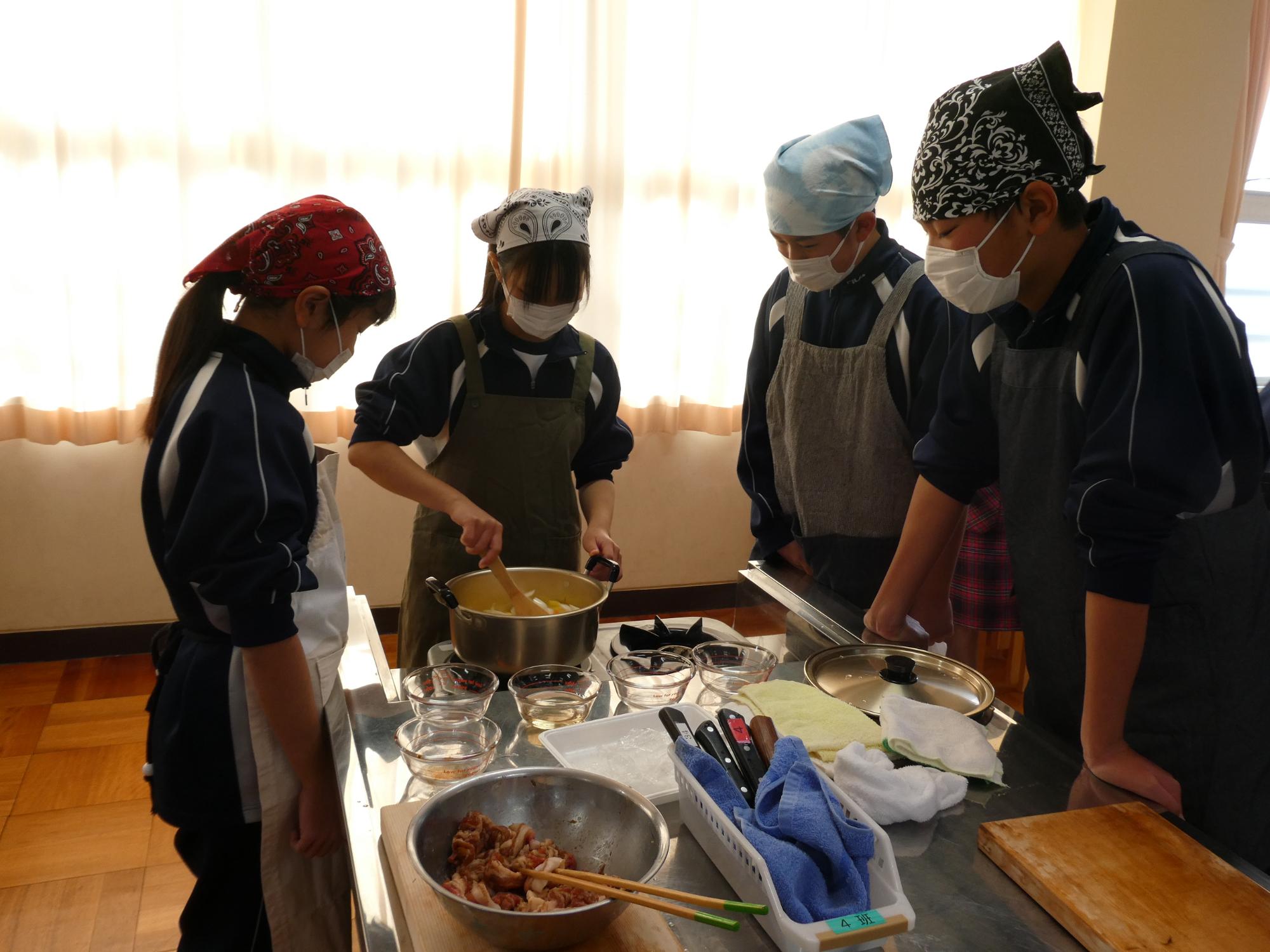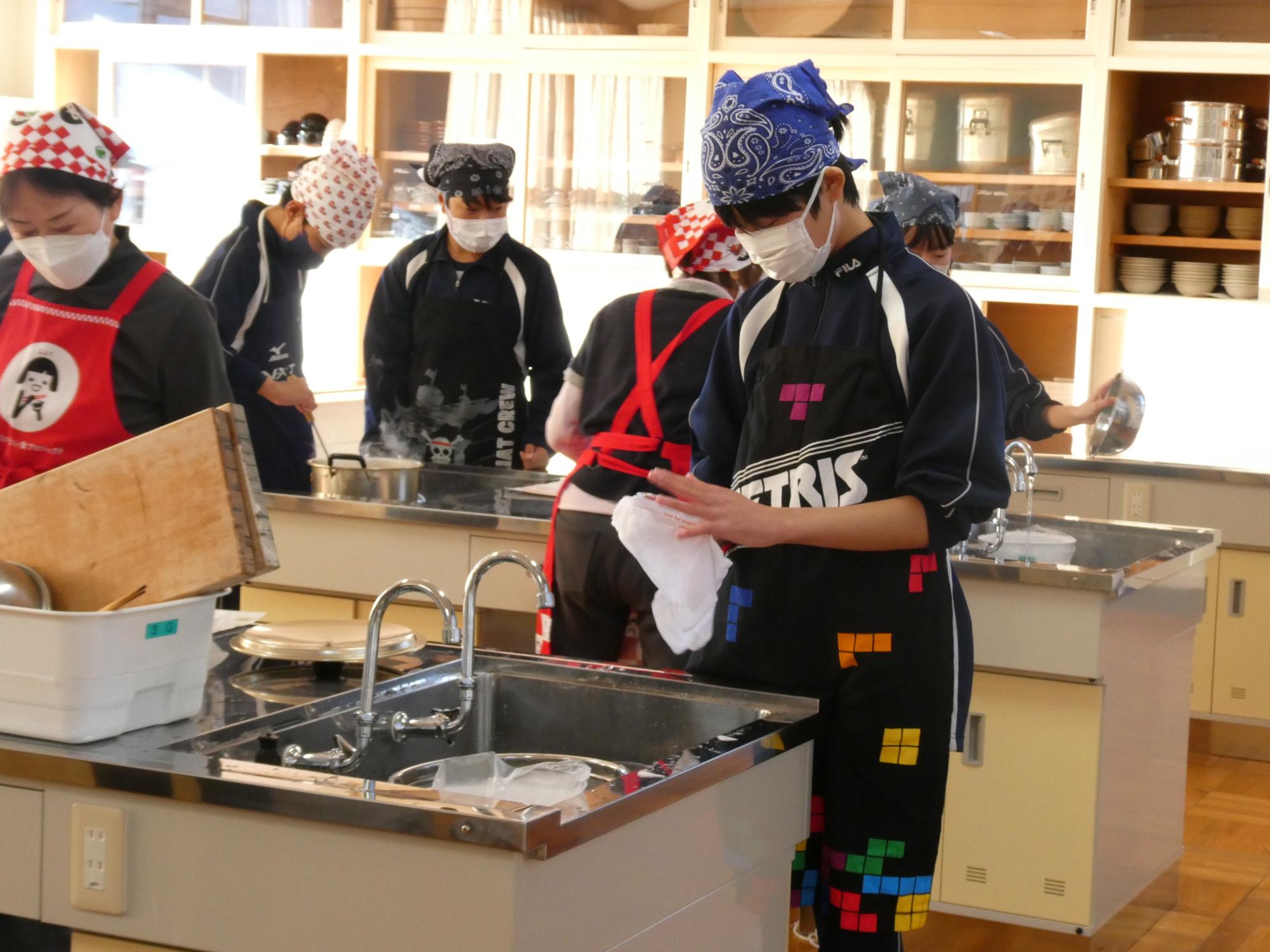 炒めたり、煮たりしている間、お鍋の番を一人置いて、あとの子たちはお片付けです。
