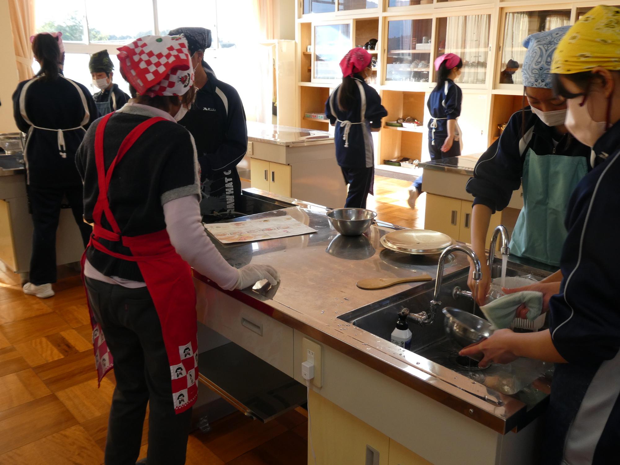 調理と片付けを同時進行していたグループは、ずっときれいな調理台とシンクでしたが、溜めてあるグループは一挙に洗い物の時間になりました。
