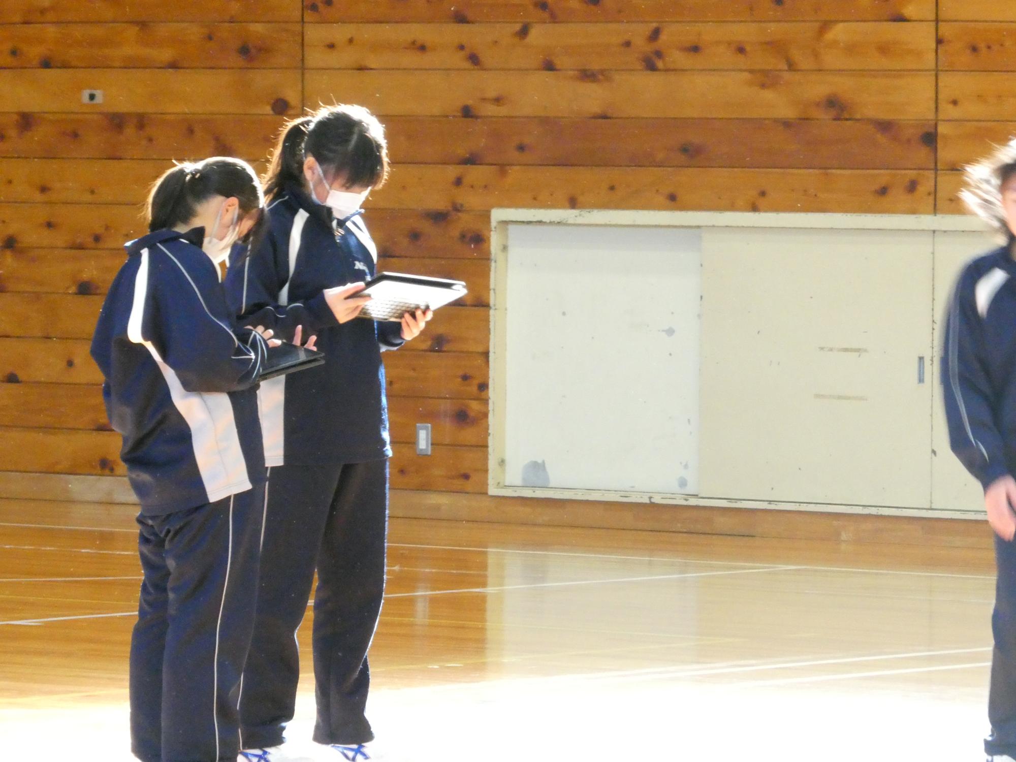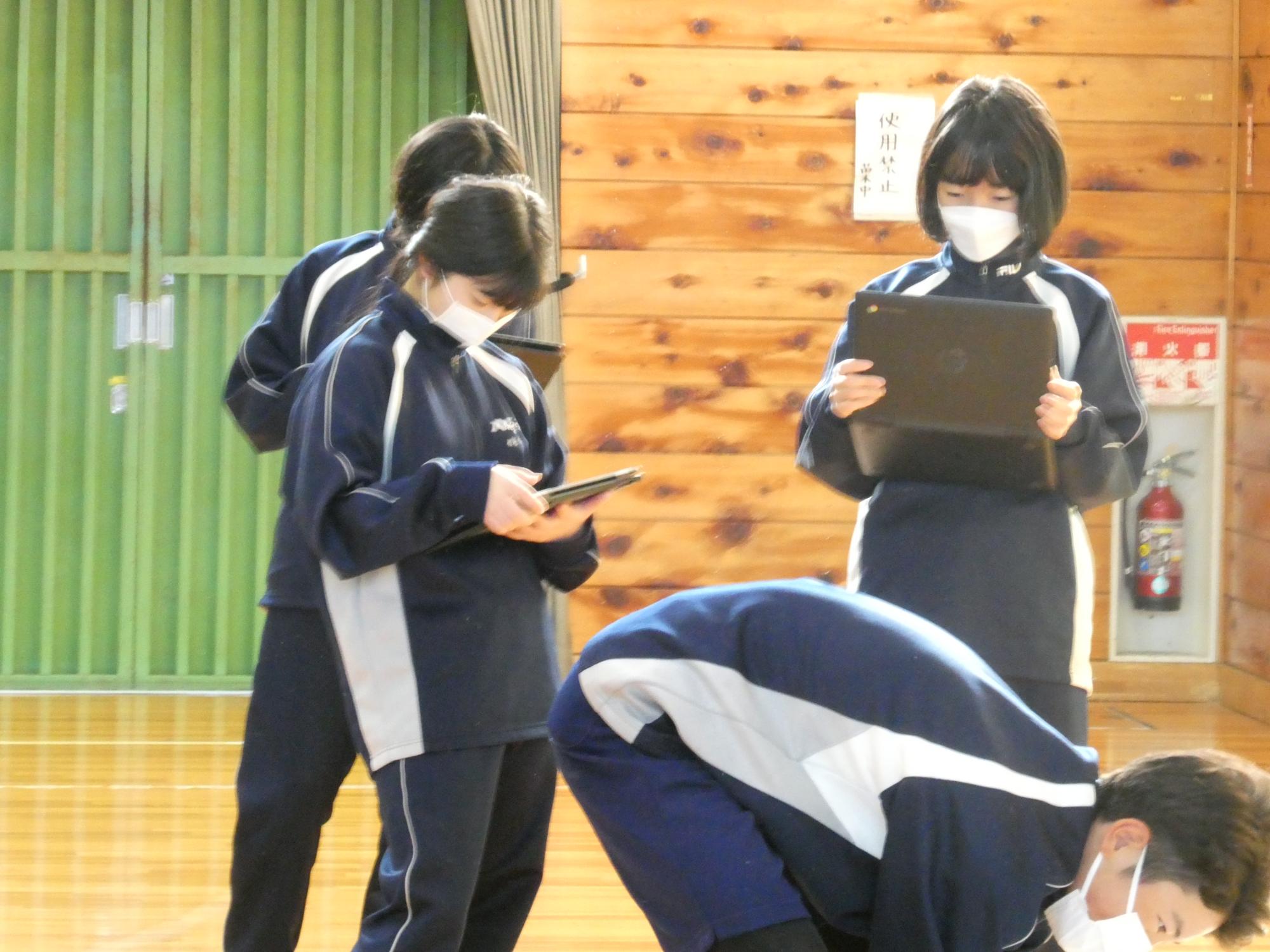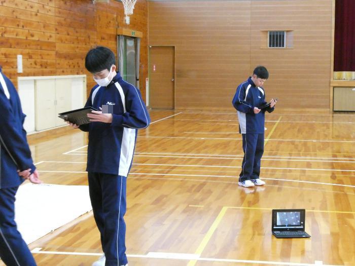 クロームブックで撮影していた自分の演技を見て研究します。みんな真剣に見てました。