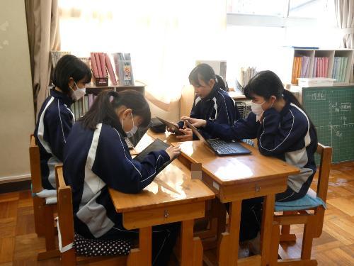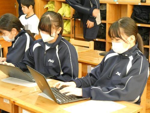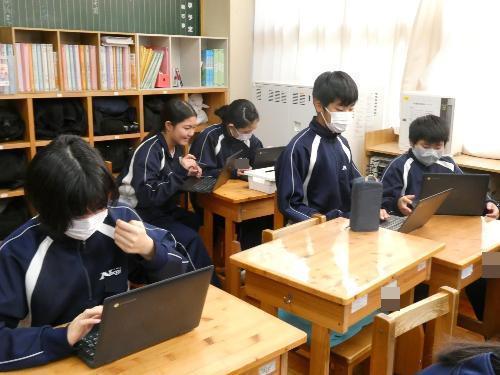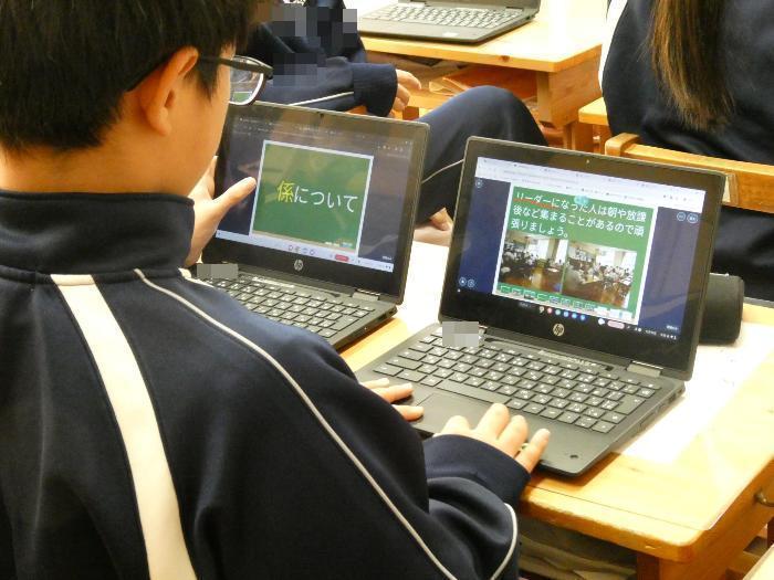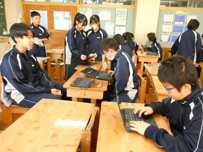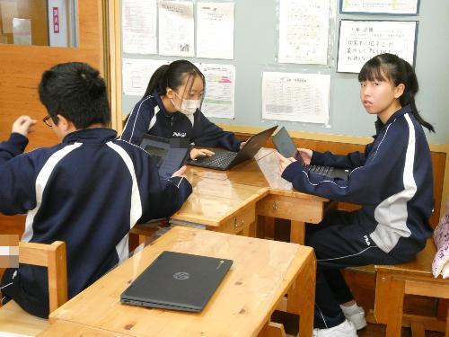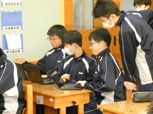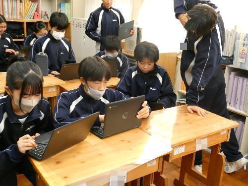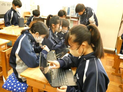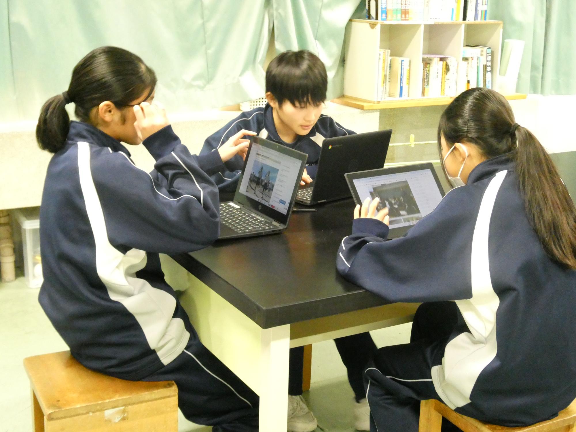 理科室、1A、1Bと、3教室に分かれて、自分たちが担当する説明の文書を作成し、プレゼンテーション用の画面を作るために、写真やイラスト、文書を画面に貼り、着々と仕事をこなしていました。