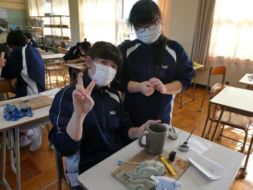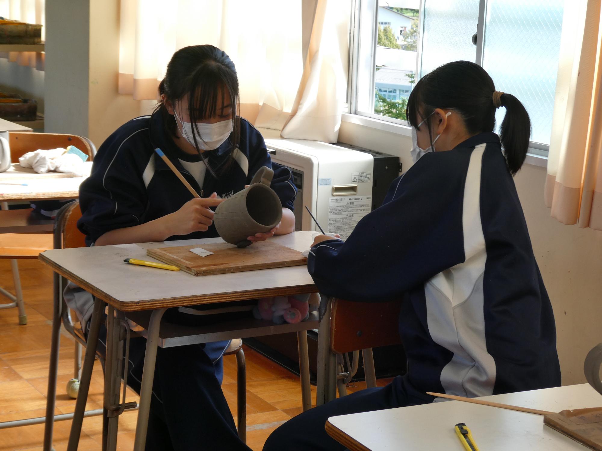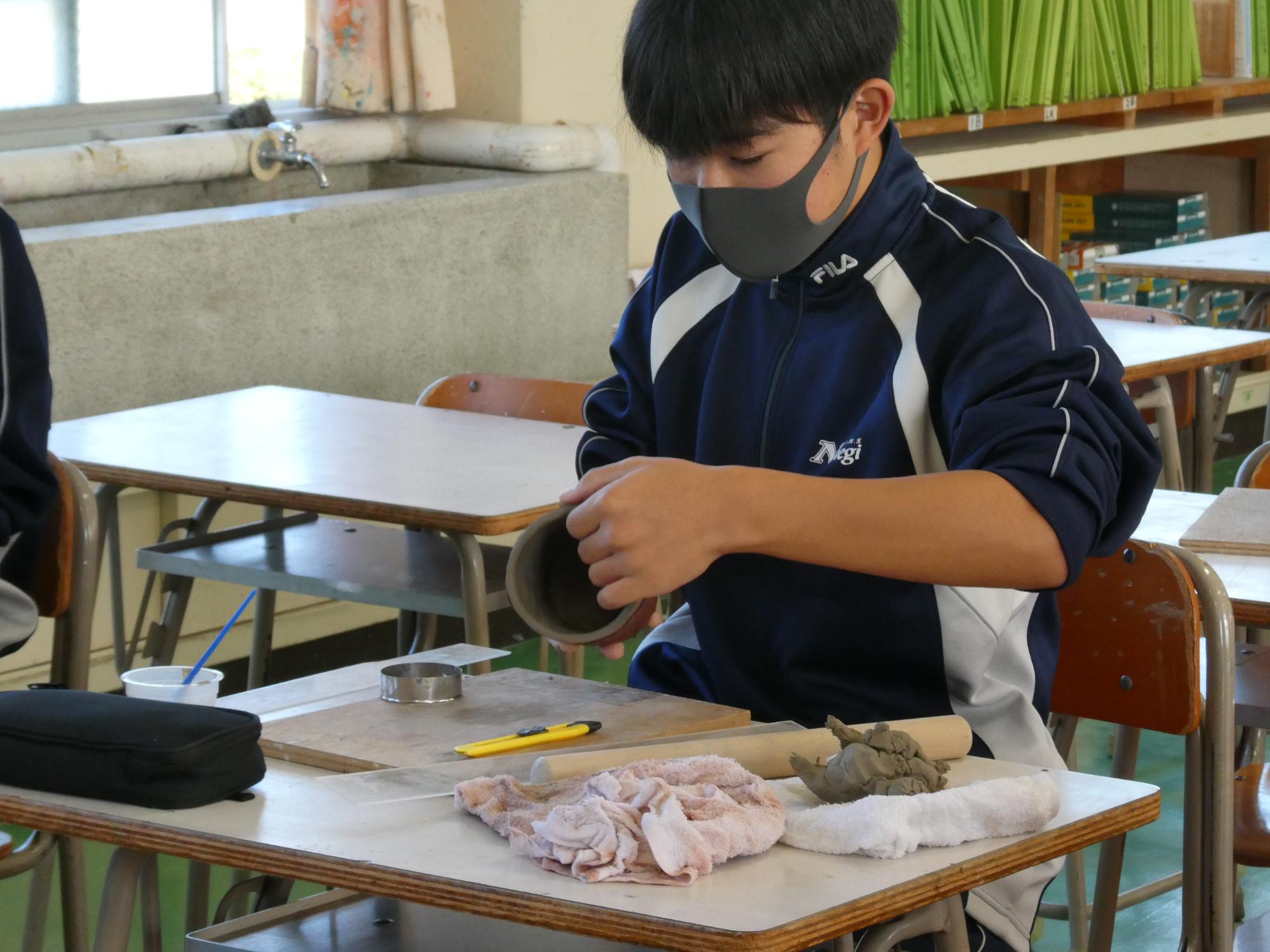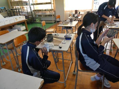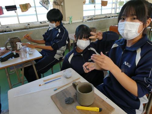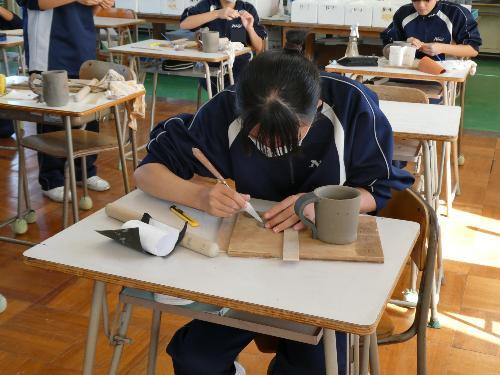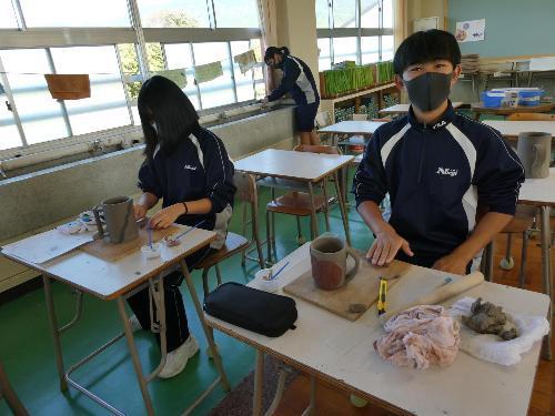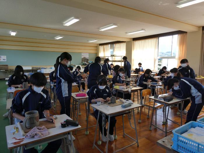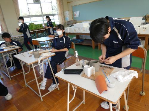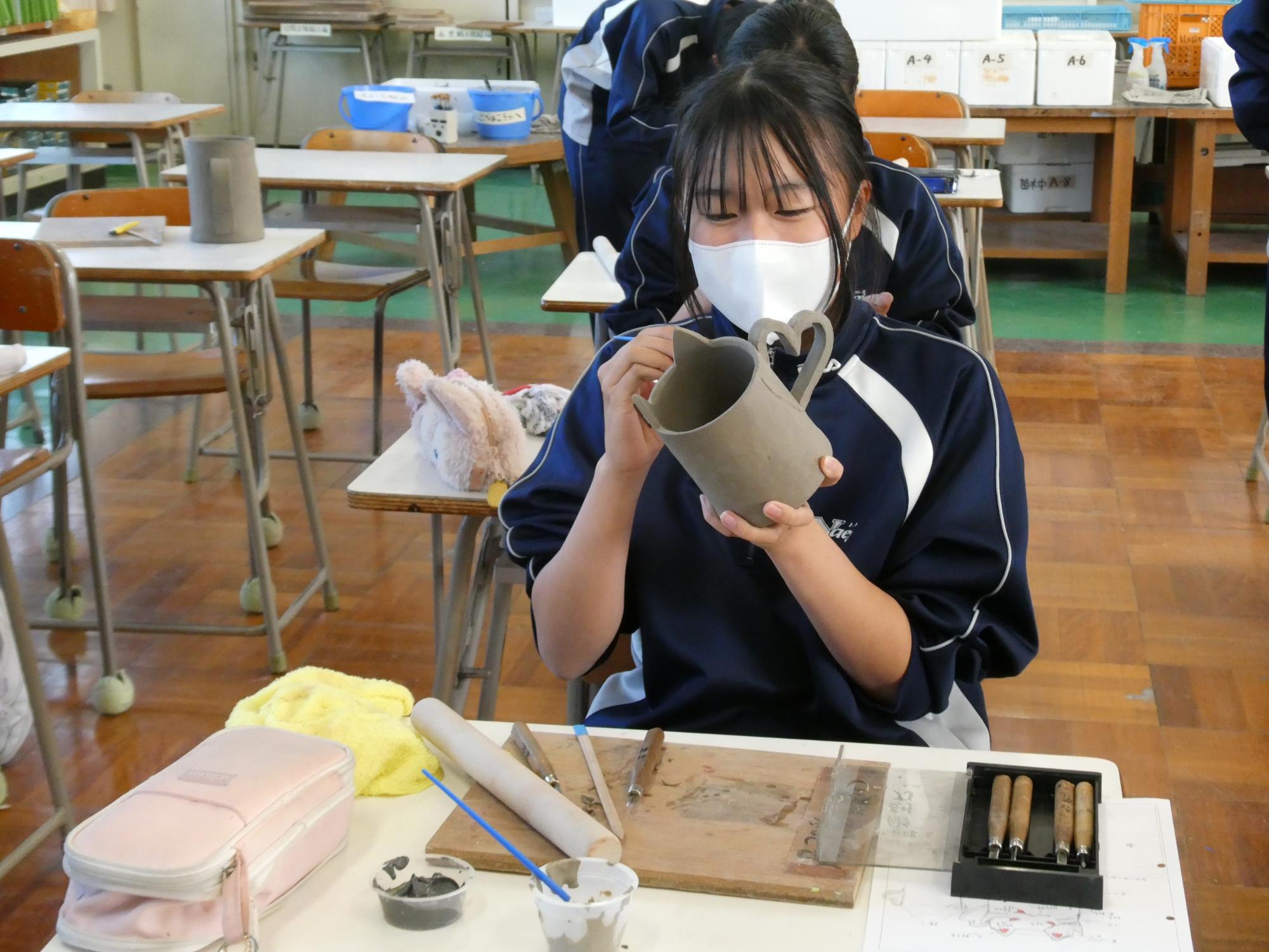 11月4日「2B~授業風景」 更新日:2025年11月04日 2Aも2Bも、美術の授業風景です。 毎年行っている「陶芸」の授業です。瑞浪のプロの方にご協力いただいてできる授業です。どの学校でもできるわけではありません。できる学校の方が珍しいわけです。 今日で仕上げのようです。今回はカップ、器に限定した制作だそうです。とても丁寧に、きれいに仕上げています。焼き上がりが楽しみですね。プロの方が焼いてくださり、出来上がるのは3年生になってからかな。