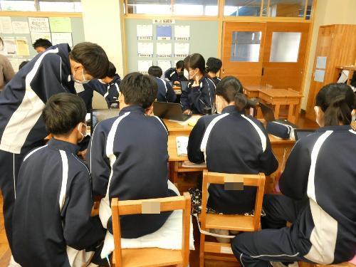 次は、自分の将来の夢や、現実的な選択を想定しながら、高等学校や専門学校などの、上級学校調べを行っています。今回は、行きたい学校、興味ある学校は置いておいて、各グループで一つの学校を受け持ち、調べて、プレゼンテーションするという学習です。