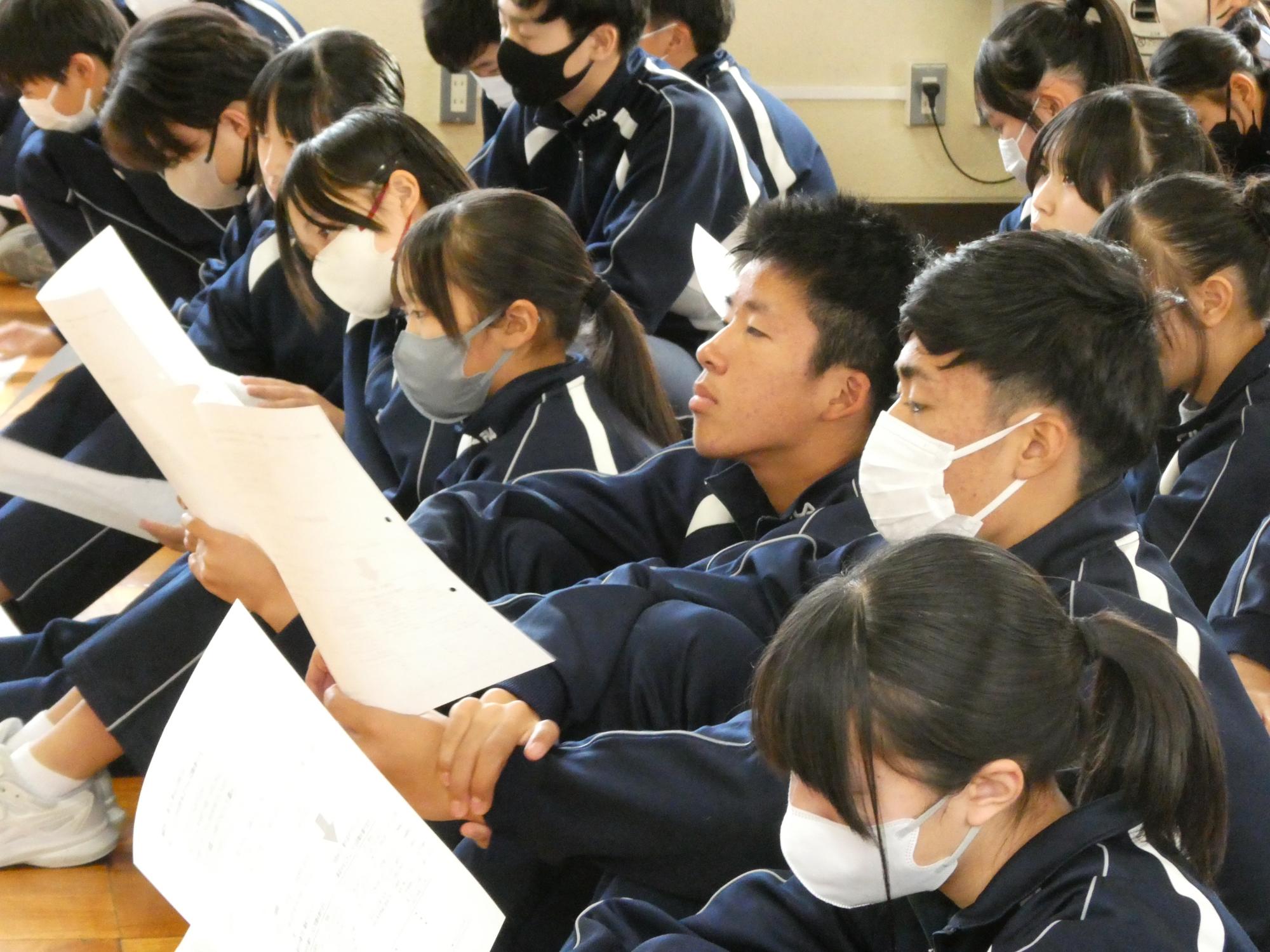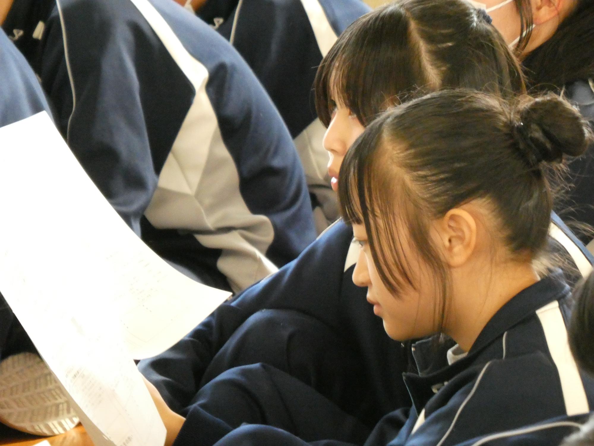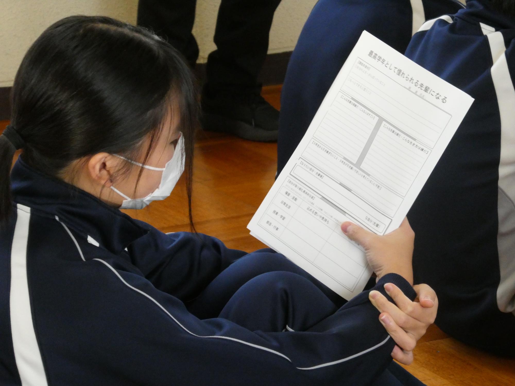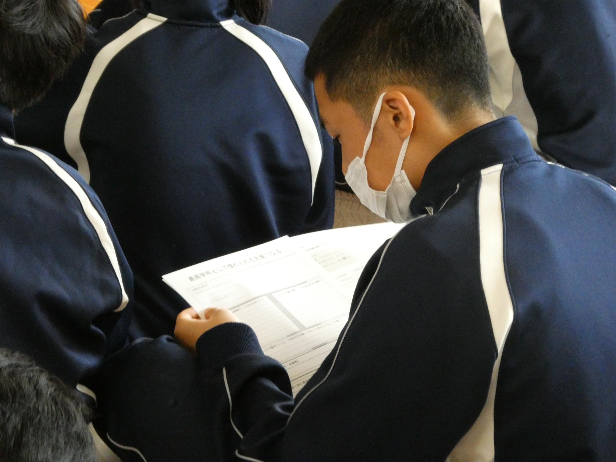 3年生、1年生に続いて、2年生もプロジェクトを立ち上げました。今日は先生からプロジェクトの話を聞き、各教室に戻って、3年から引き継ぐべきものとは何か、3年生が引き継いでほしいと思っていることは何なのか、目指す先輩像と今の自分との違いは何なのか・・・、そんなことを一人一人プリントに書き込み、これから始まる成長への道のりのスタートラインに立ちました。