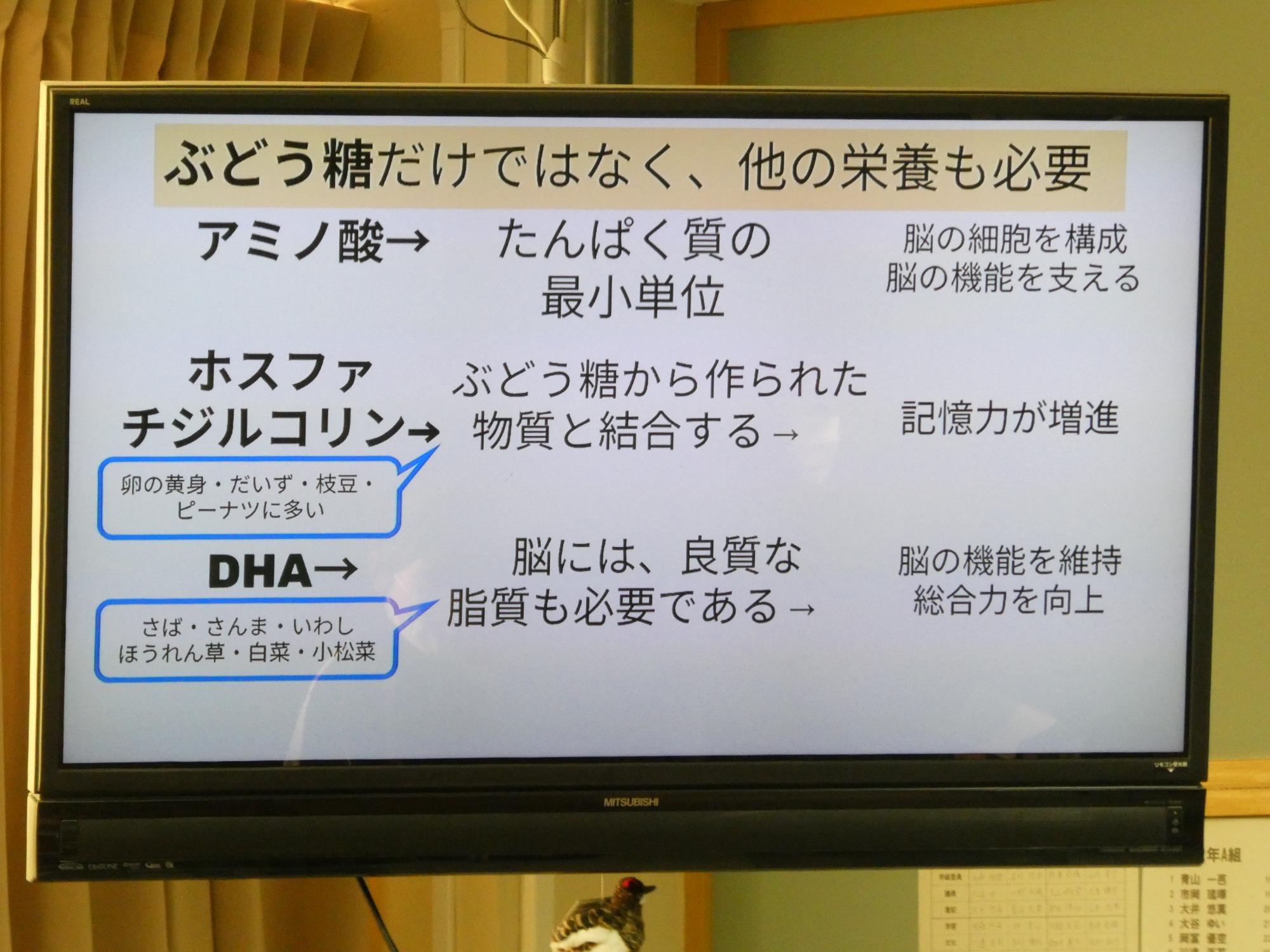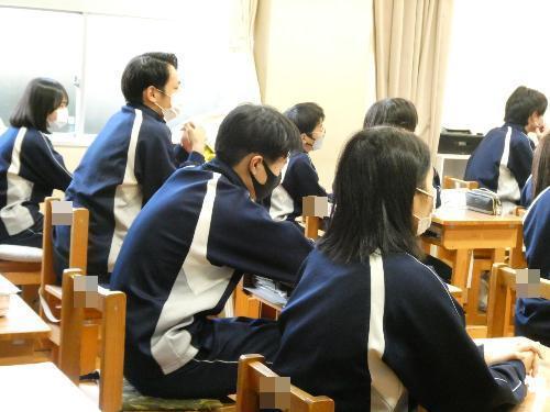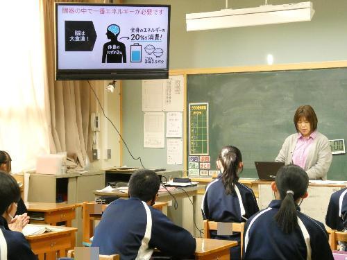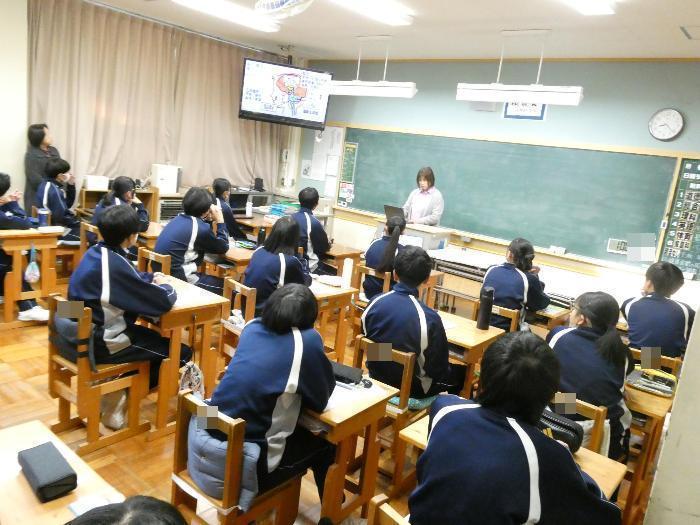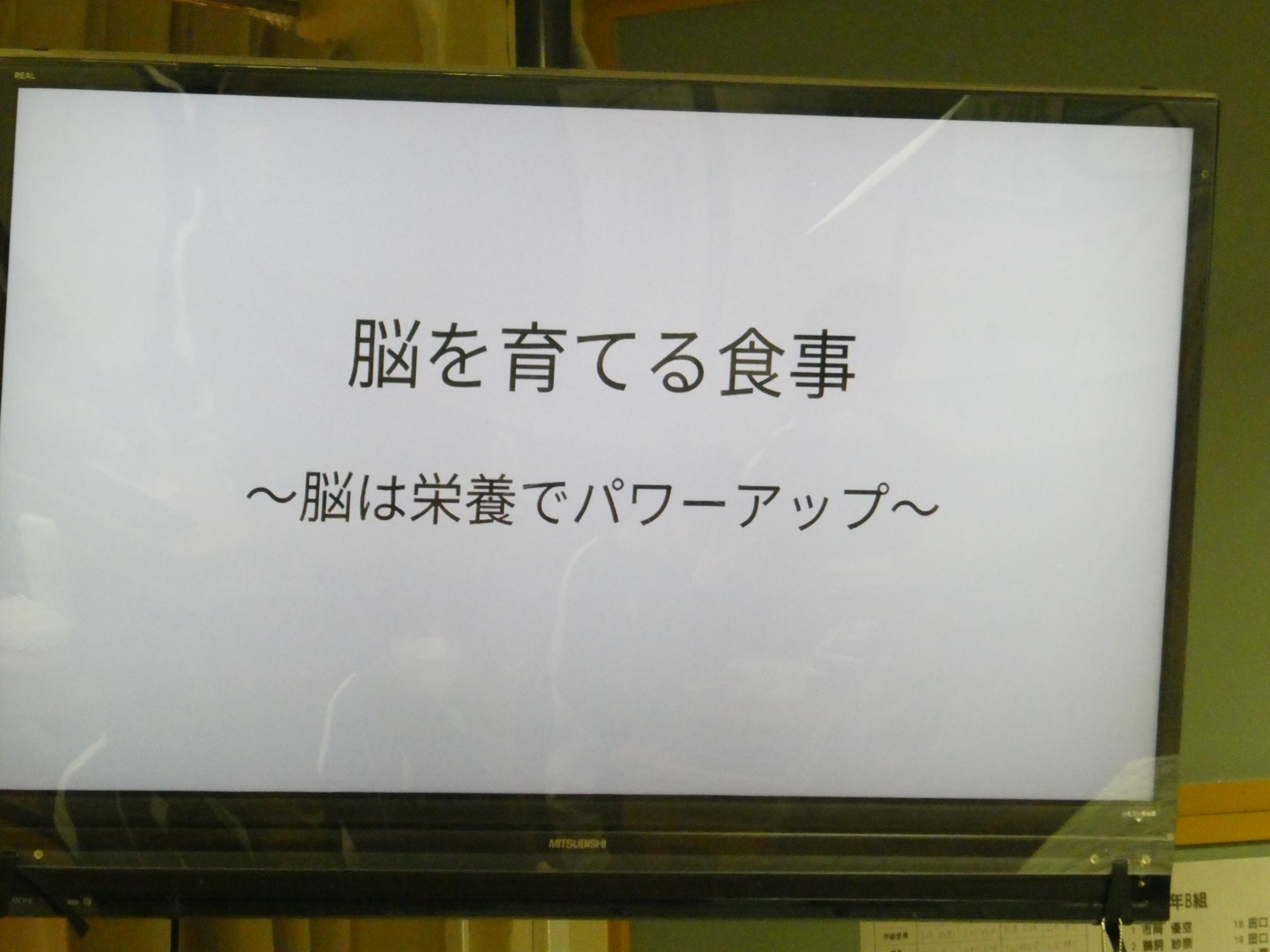 1月21日「食育指導」 更新日:2026年01月21日 月火の2日間で、1年生と3年生が、そして今日は2年生が、栄養教諭の小海途先生から食育指導を受けました。1学級10分間の短い時間ですが、成長期にある生徒たちにとっては大切な学習です。 今日のテーマは「脳を育てる食事」です。 給食には、サバなどの魚料理、大豆などの豆料理が多いのも、理解できますね。 2年生は、魚嫌いの生徒がとっても多いのですが、脳は大丈夫?(笑)