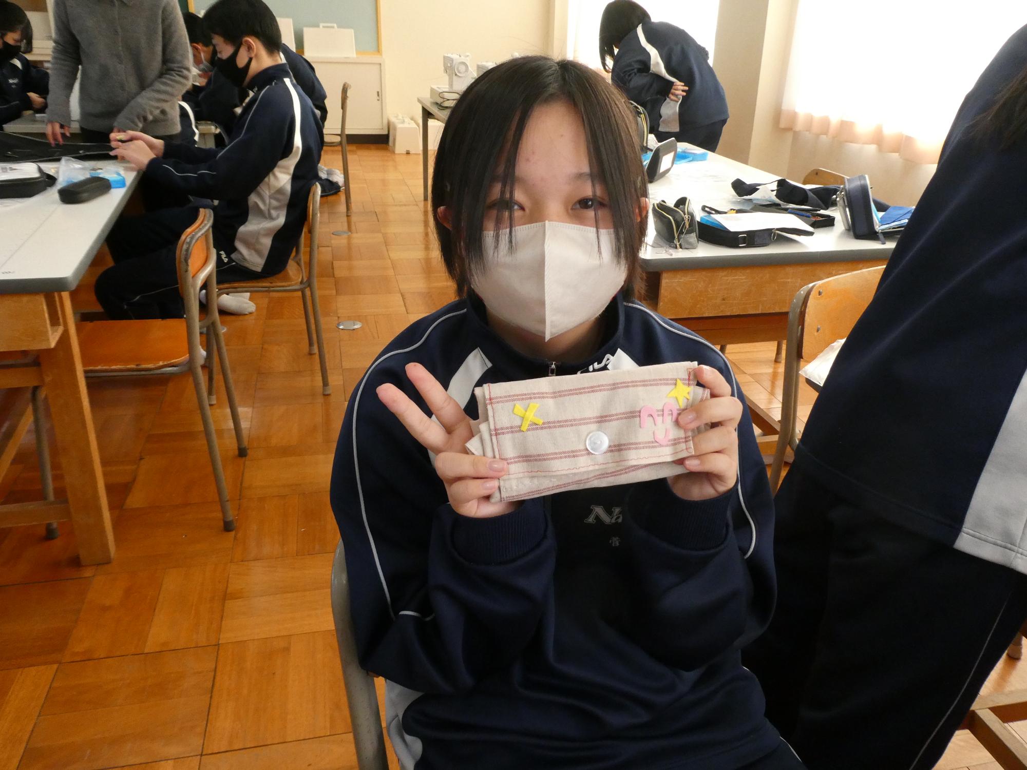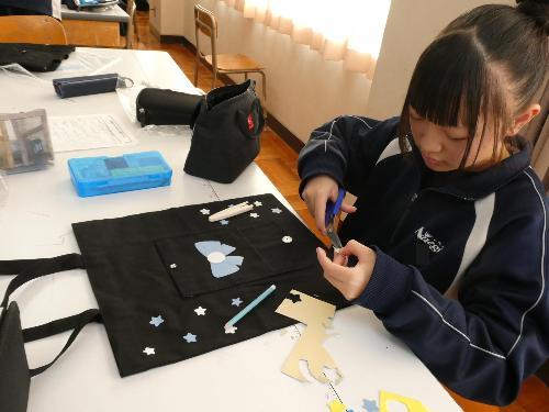 2Aの家庭科、作品がかなりできてきました。フエルト生地でいろいろデザインして貼ったのに、これで買い物行くのは恥ずかしいとか言っていました。じゃ、なぜそんなデザインをした~!(笑)