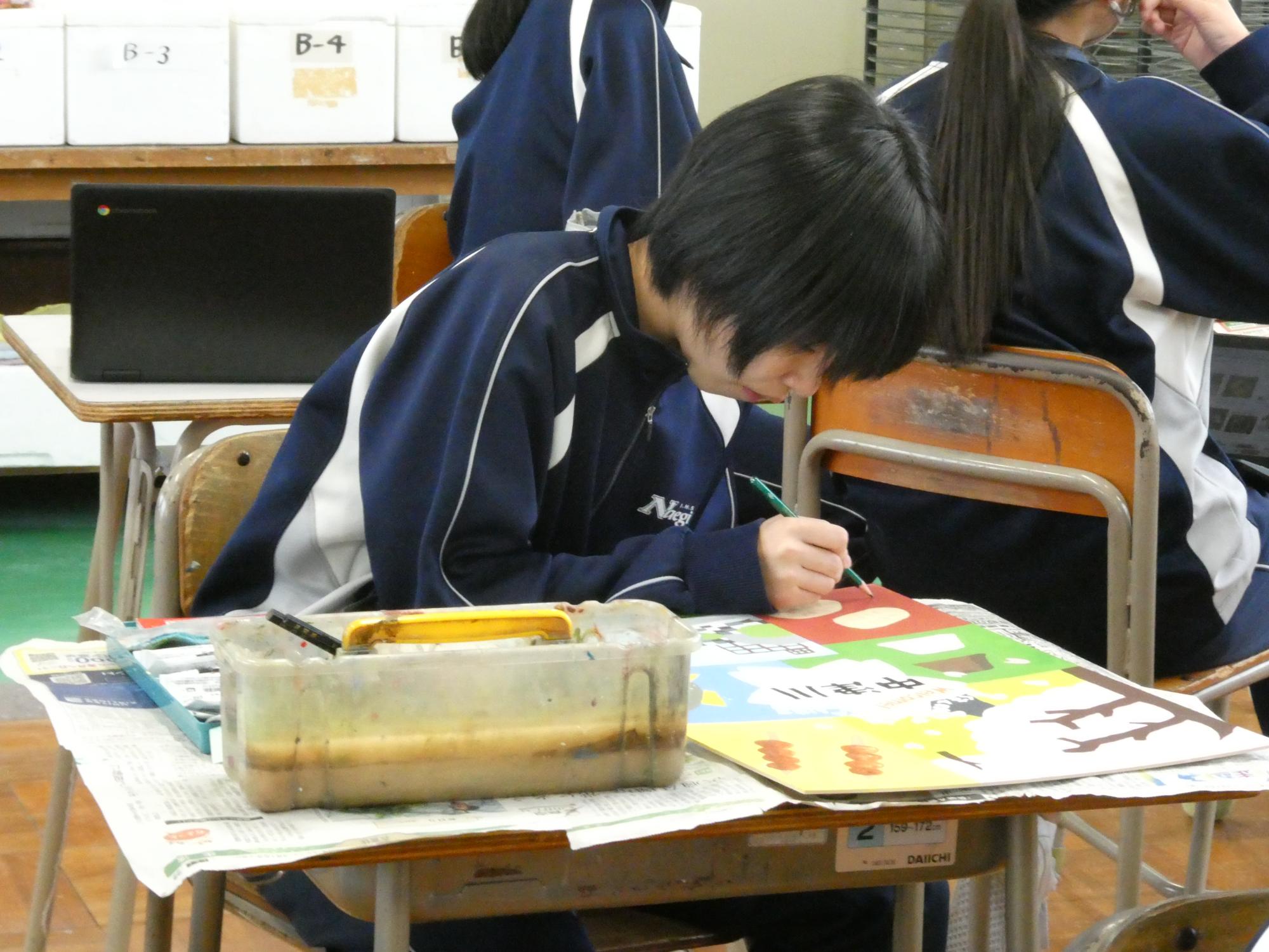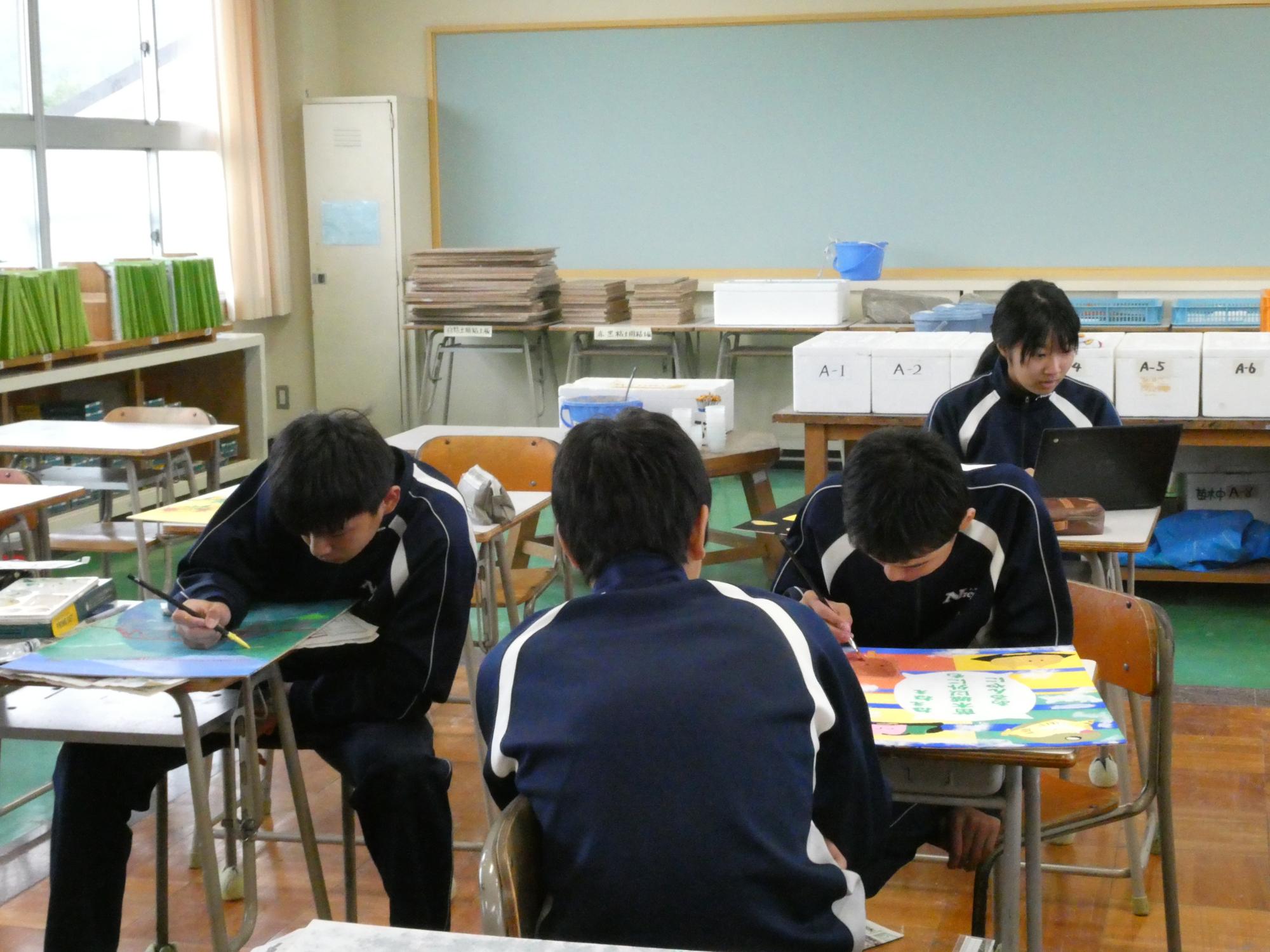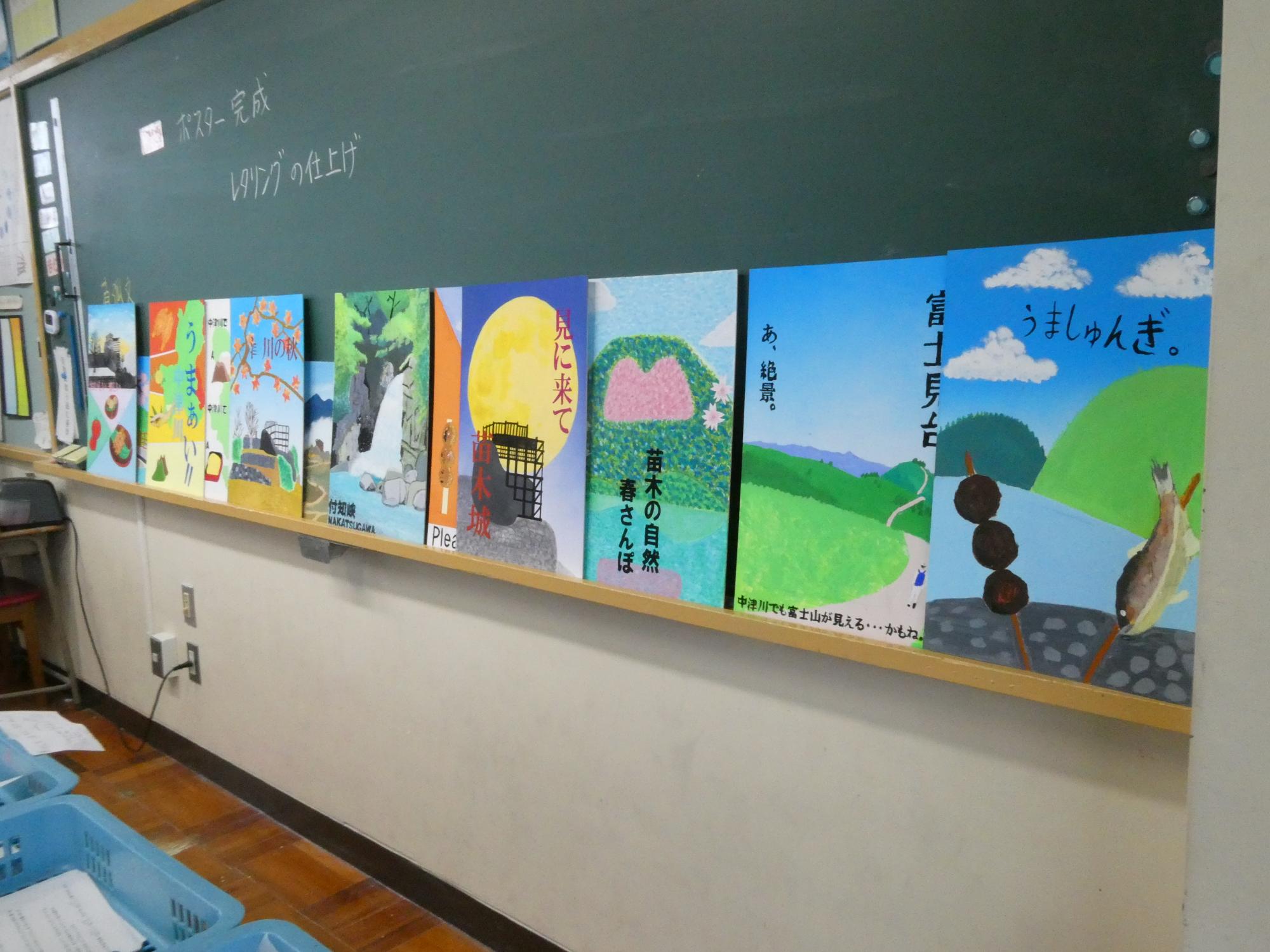 毎年好評を得ている中津川PRのポスター制作です。もう描き終わっている子も多くいました。描き終わった子たちは仲間の作品の色塗りを手伝っていました。