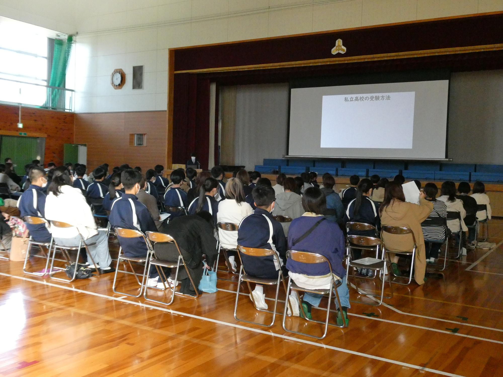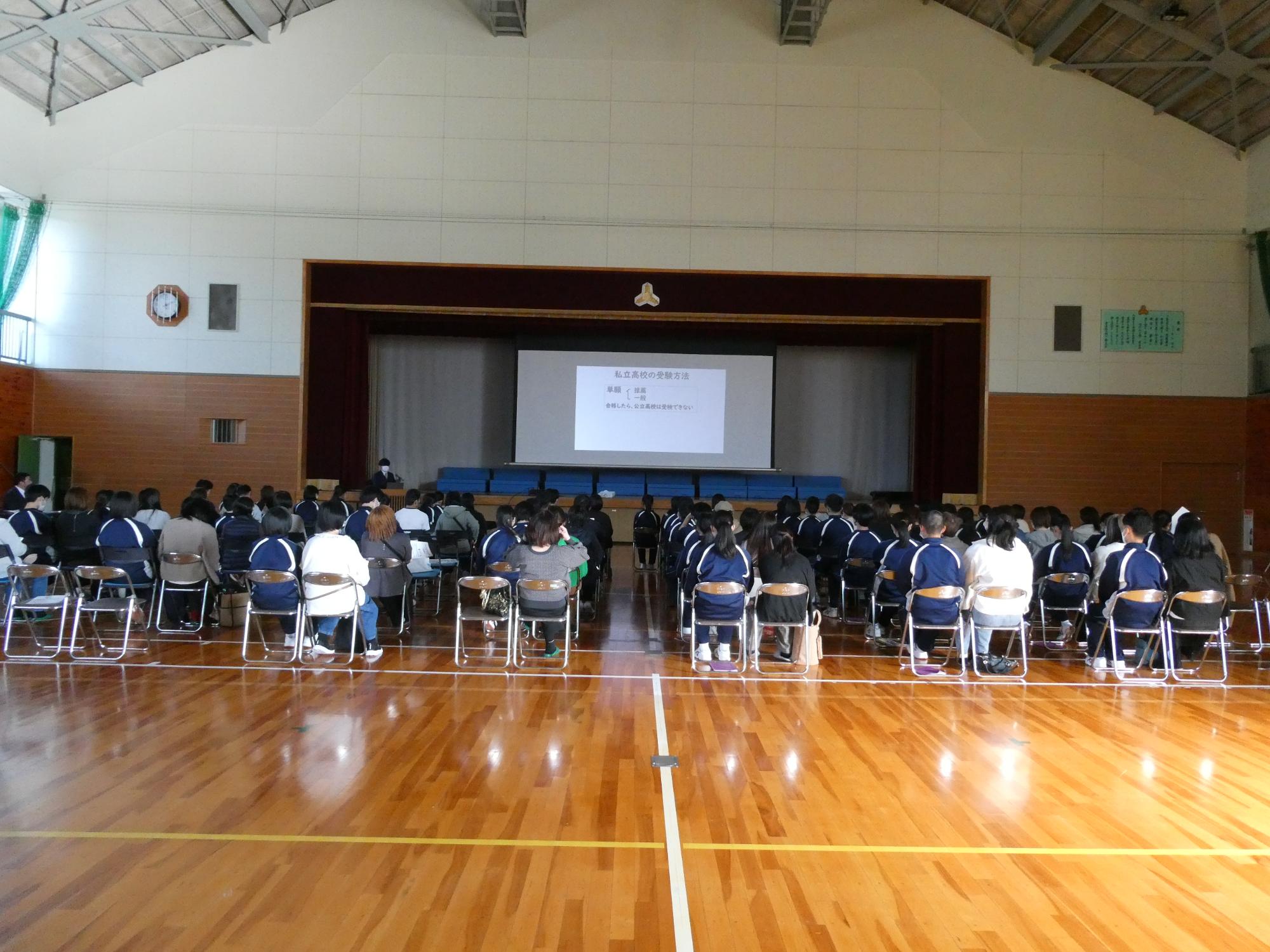 また、公立高等学校だけでなく、私立高等学校についても、出願の仕方などを中京高校の方が代表して説明しに来てくださいました。それについても、学年担任がお伝えしますので、本日欠席された方は、重要なことですので、是非ご連絡ください。