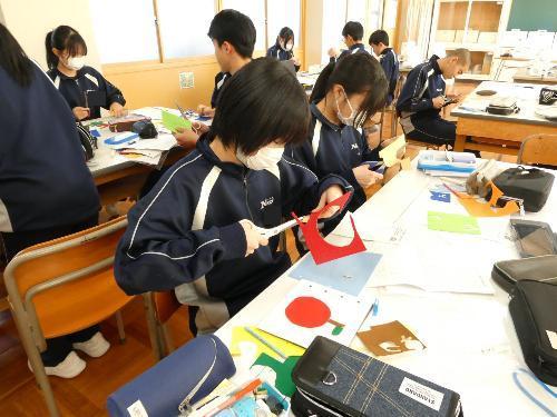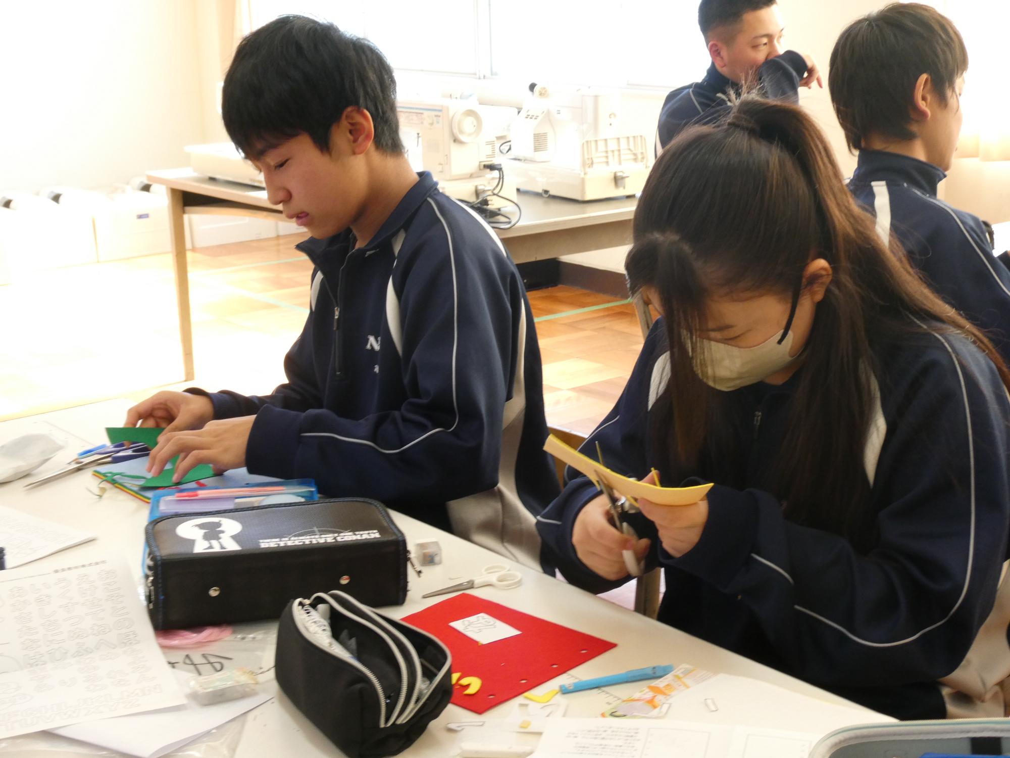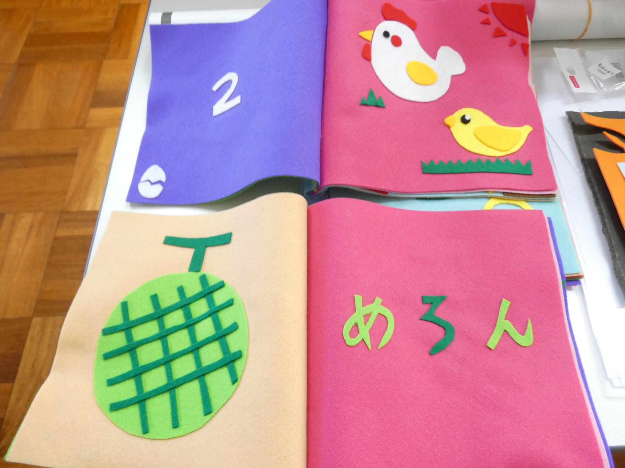 3Bの授業風景は、家庭科。保育実習に向けて、フエルト生地でオリジナル絵本を作成しています。園児だから、三歳から六歳までいます。もう字が読める子もいれば、全く分からない子もいるわけだから、なかなか難しいですね。
