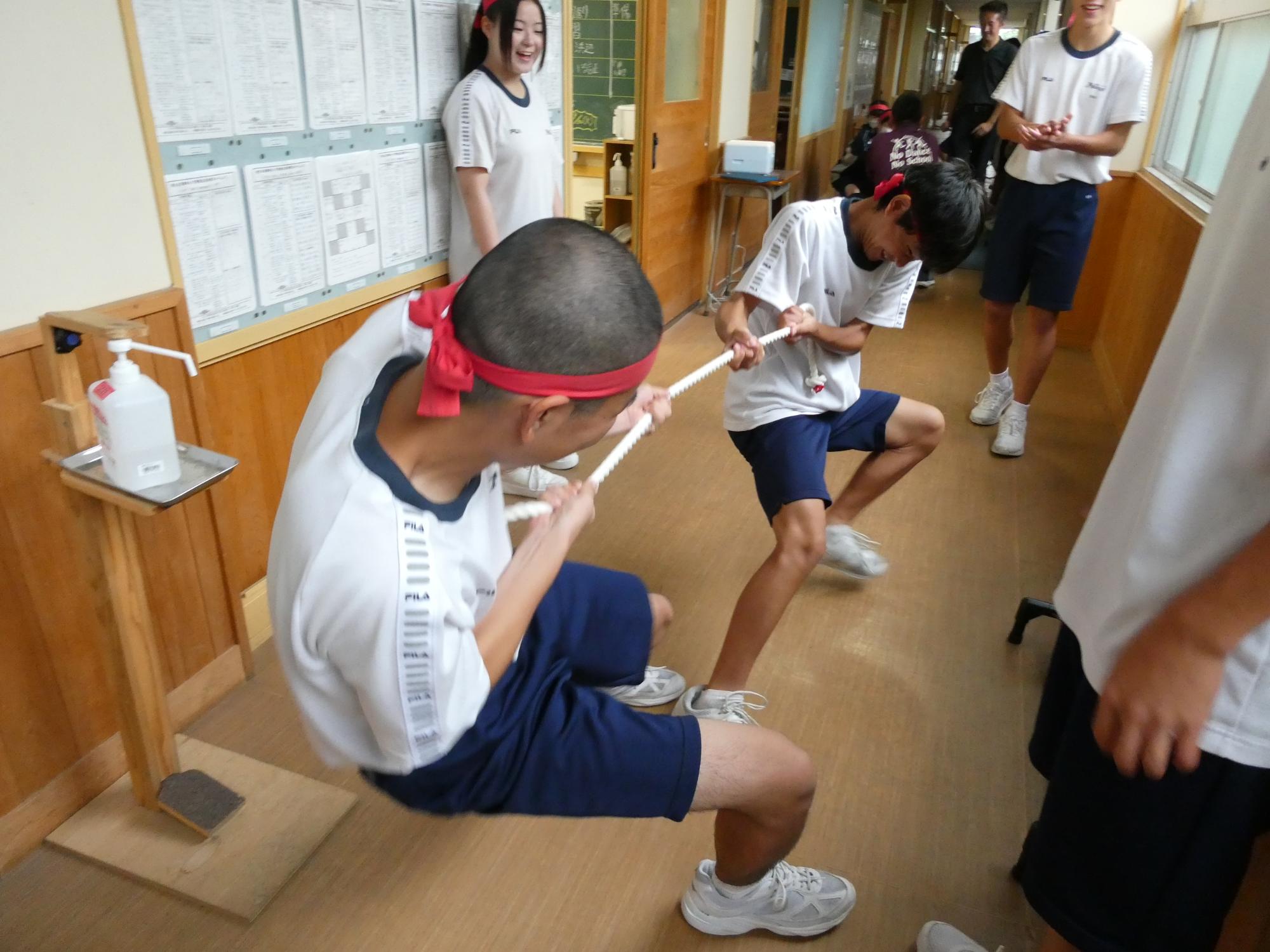「何やってるの?」と思いましたが、綱引きの練習だとか。こんな短い「縄」、どこにあった?