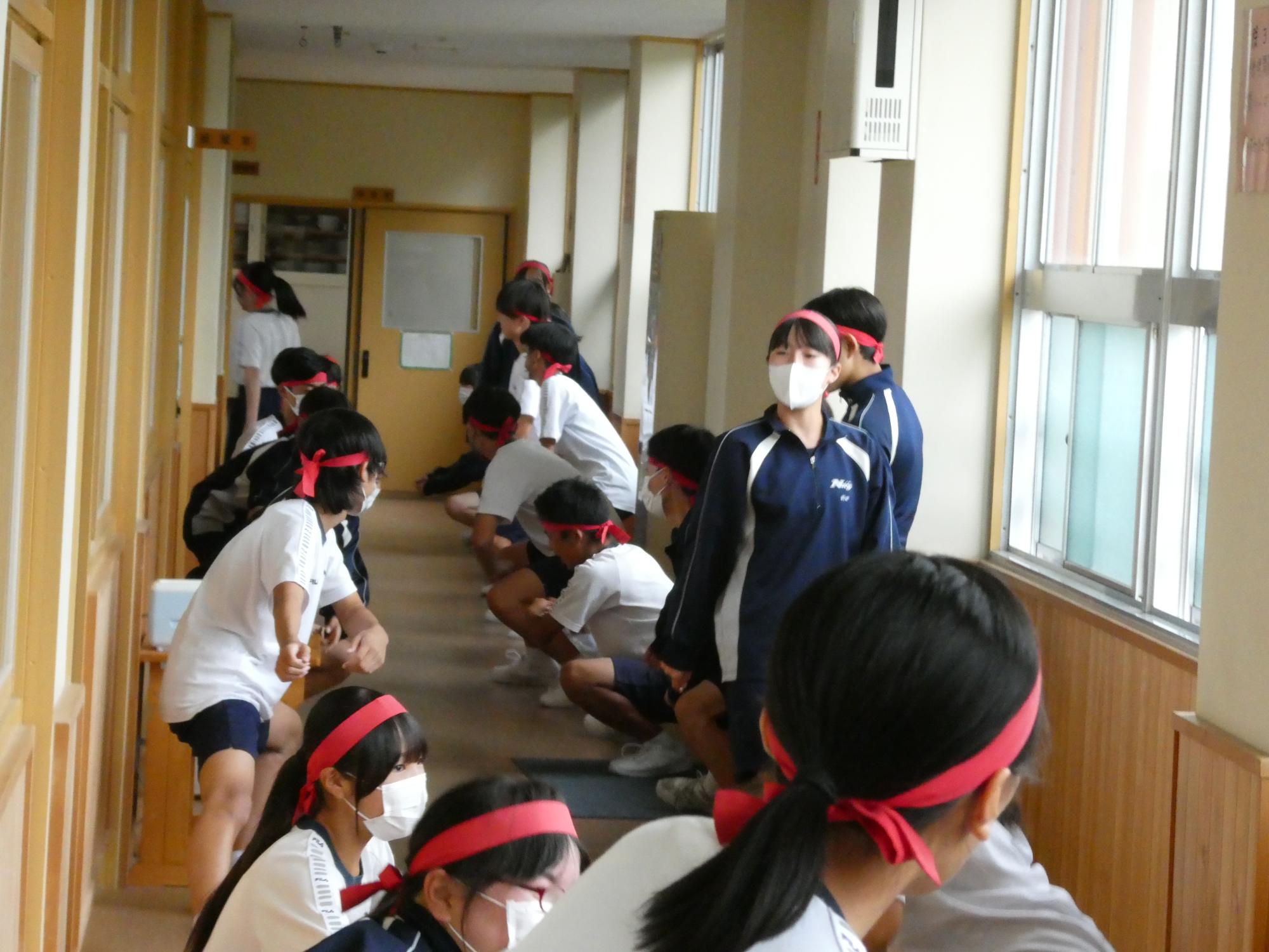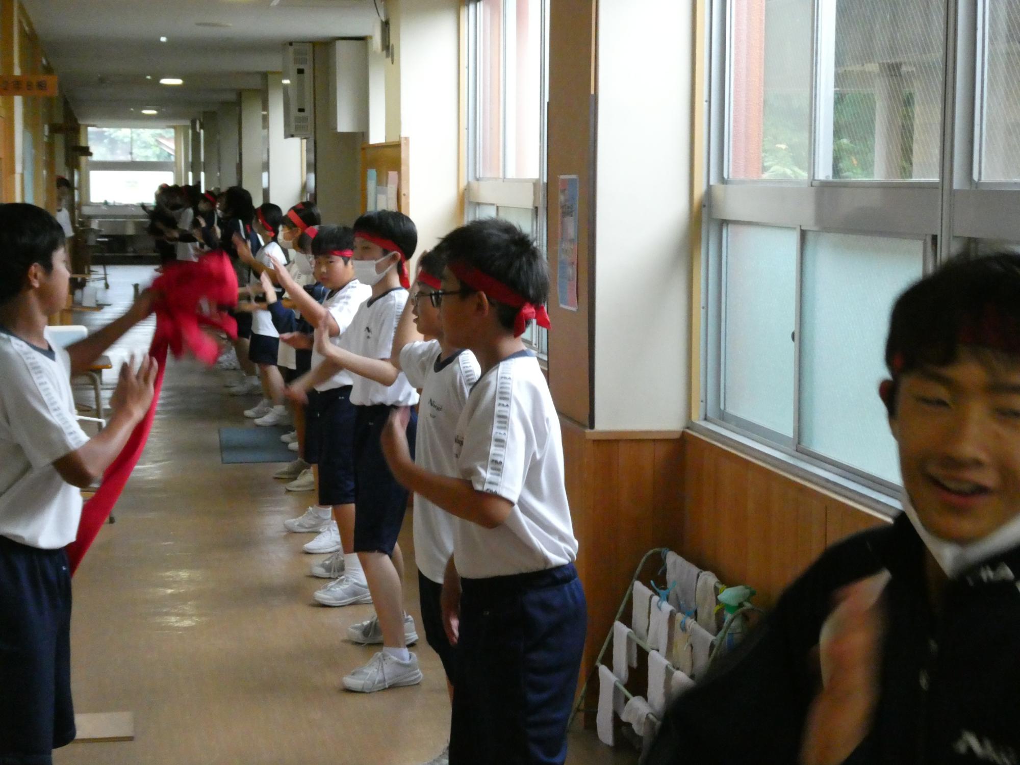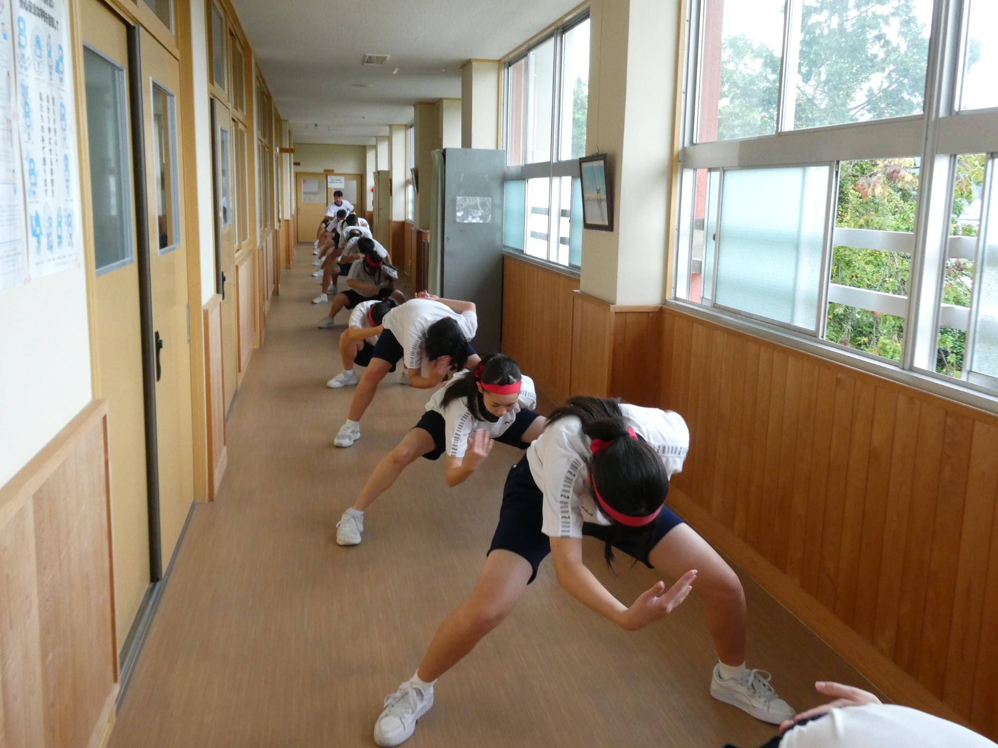赤団は雨でグラウンドが使えないので、校舎の廊下で練習です。