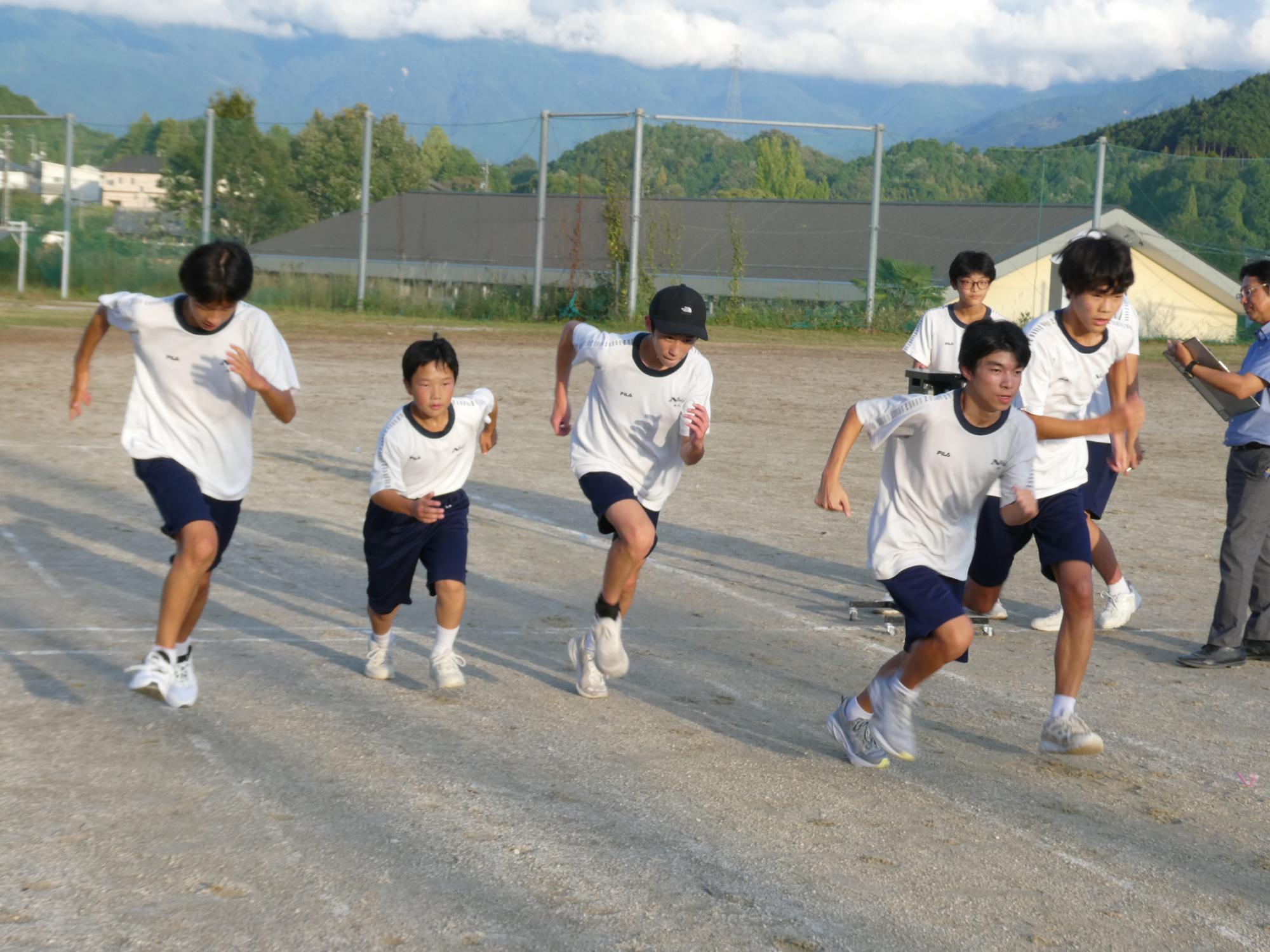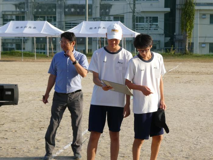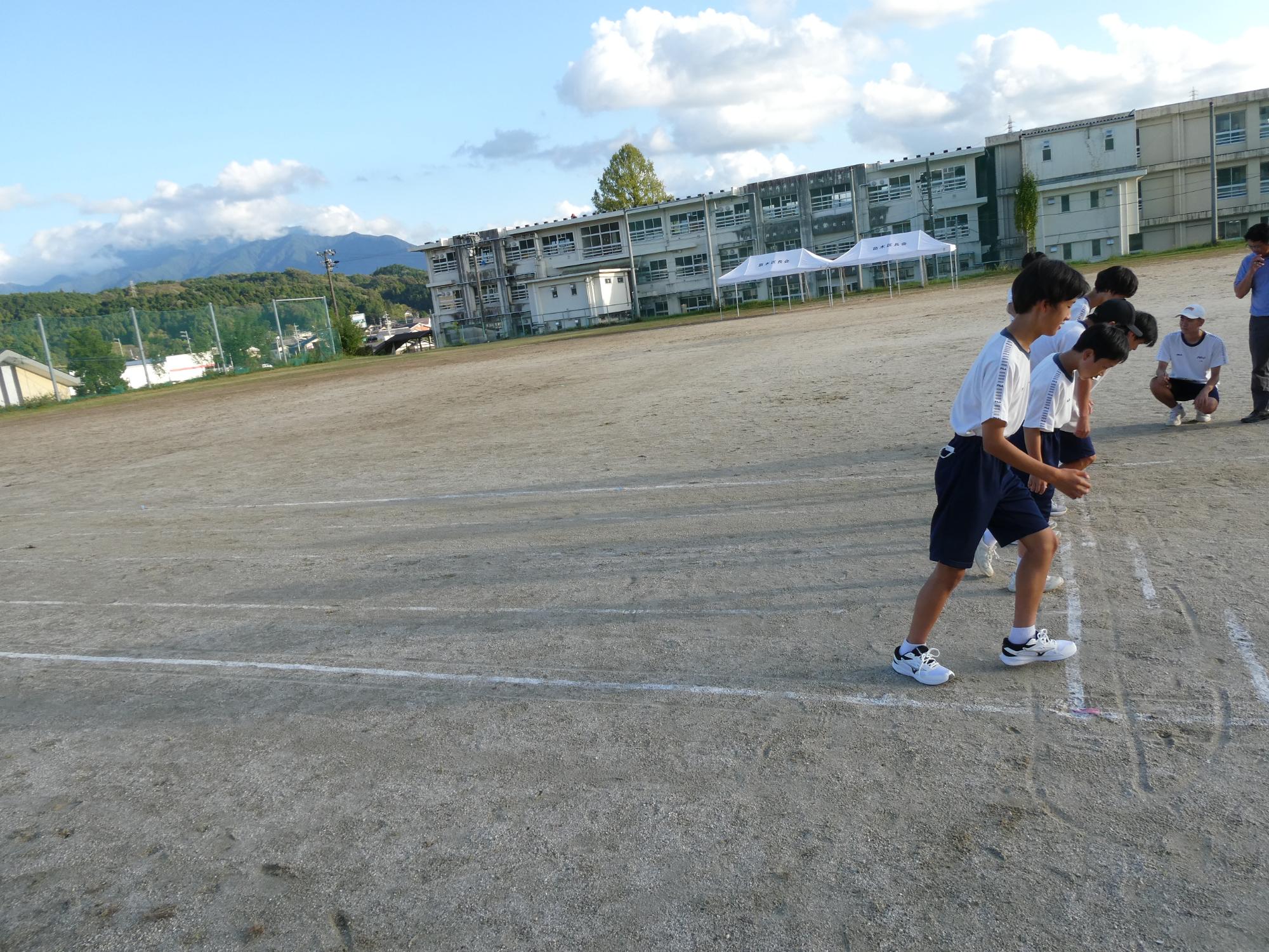 今日の駅伝練習は、校外には出ず、グラウンドのトラックを回ります。5周、1kmを、休憩を挟みながら3回?4回?走っていました。今日は欠席が何人かいて、少し少ないメンバーでの練習でした。マネージャーを務めてくれる2人が、いっぱい声をかけ、適切なアドバイスや目標設定タイム、現在のタイムなどを伝え、励ましていました。素晴らしい働きです。