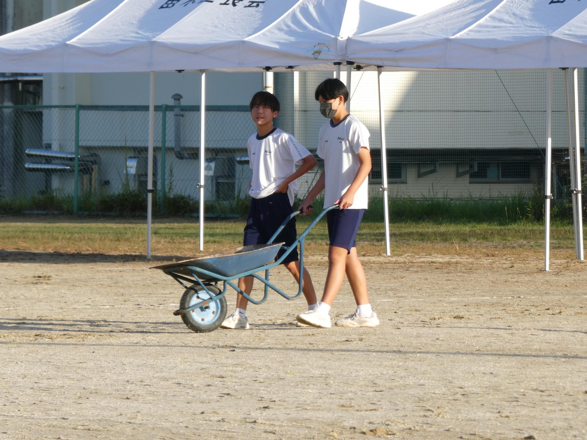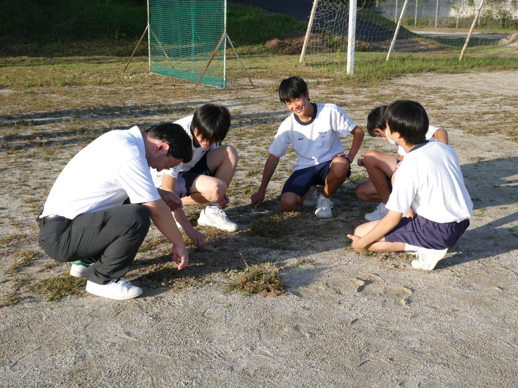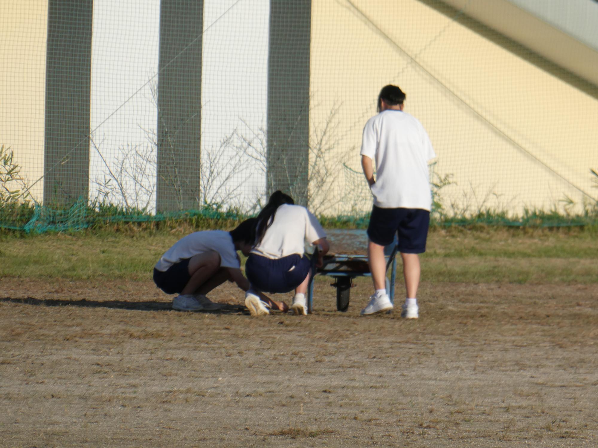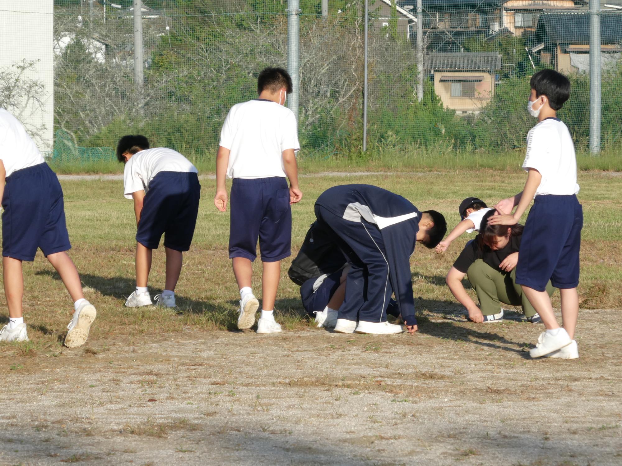 駅伝の練習を見に行くと、選手以外にも多くの生徒たちがいました。みんな草取りをしてくれています。ボランティアの生徒?、体育大会の器具係の皆さんかな?