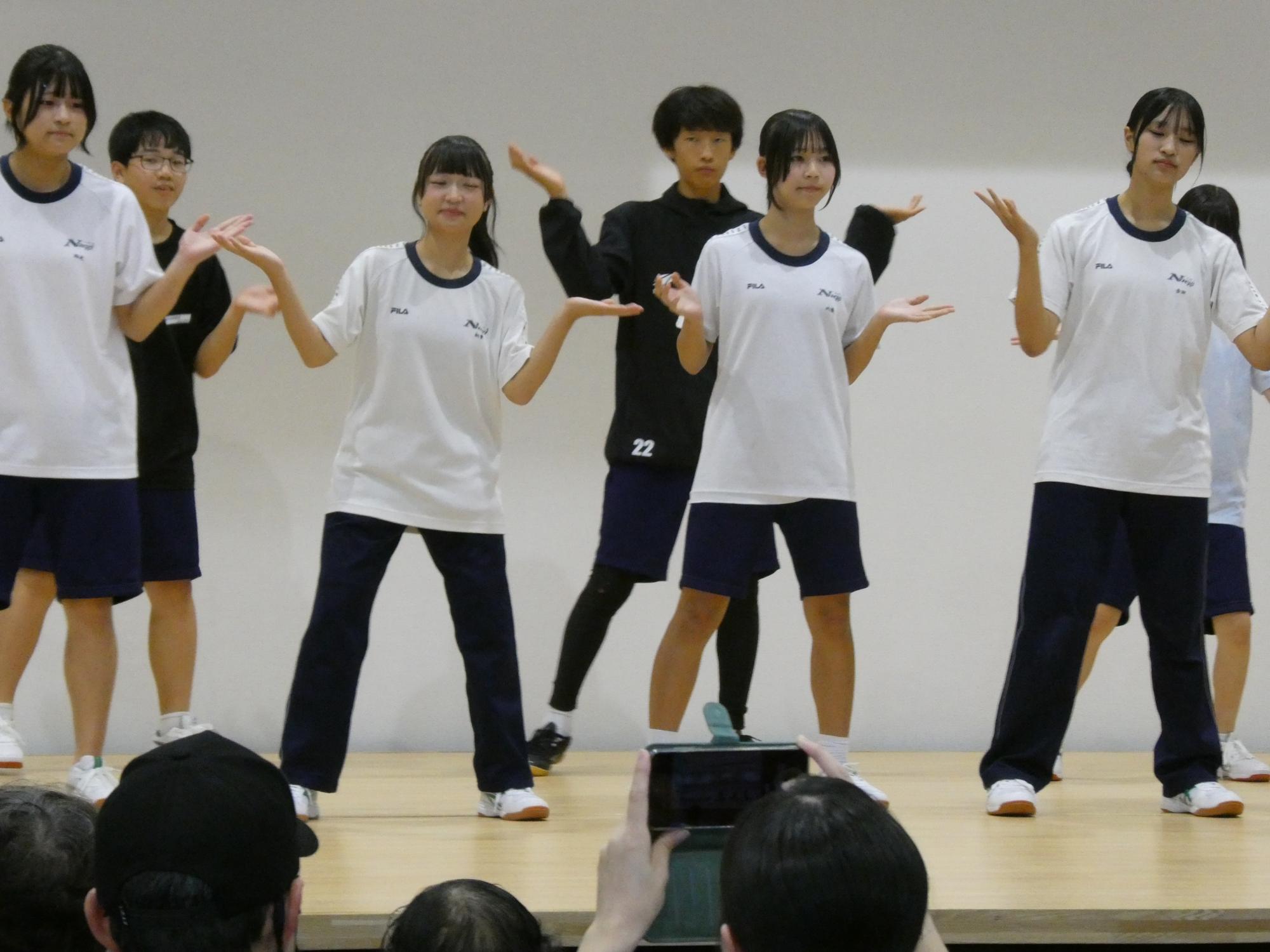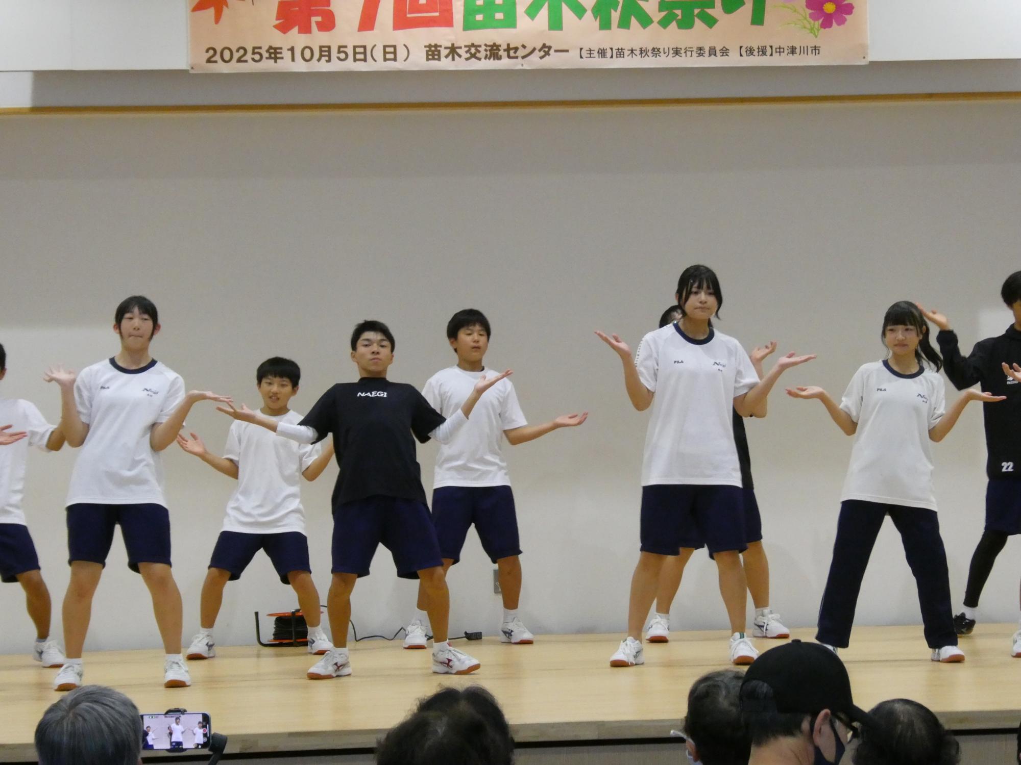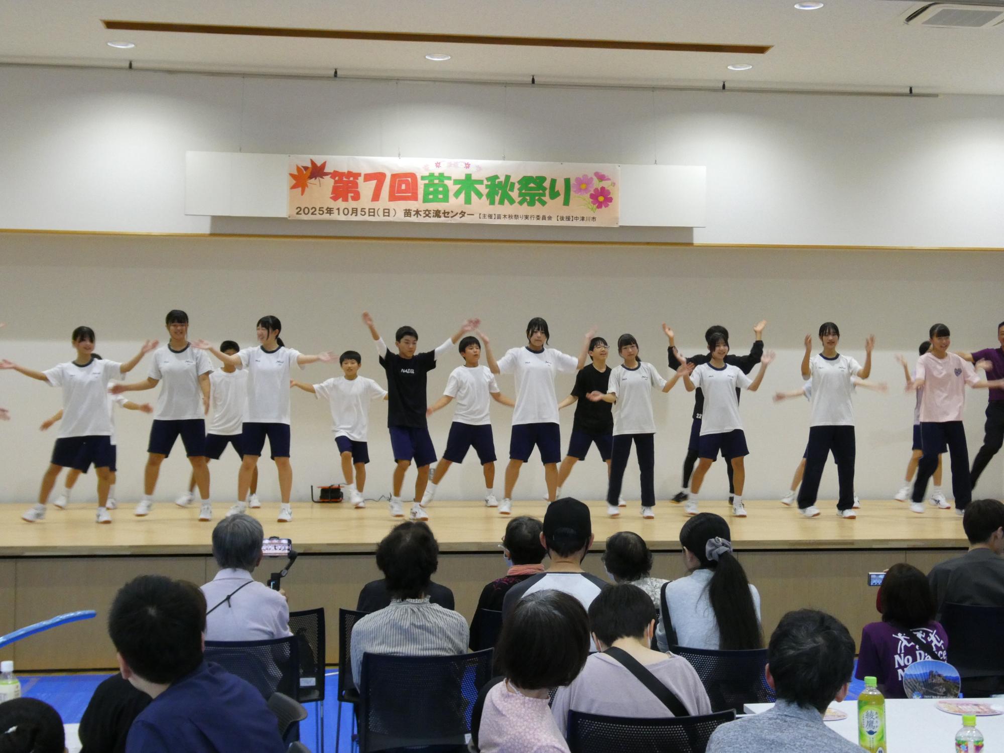 苗木コミュニティーセンターで開催された、「苗木秋祭り」に、苗木中もDANCEで参加。1年生中心にメンバーを募ったのですが、参加者が少なく、2年生にヘルプ参加を呼びかけ、2年生のリードでダンスを披露しました。