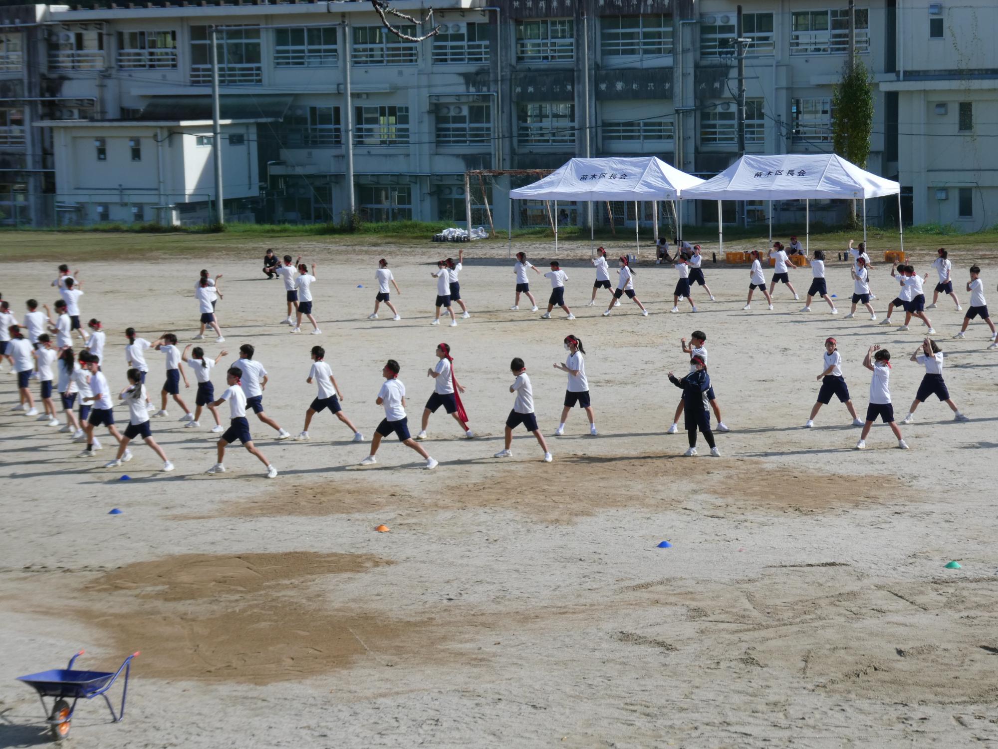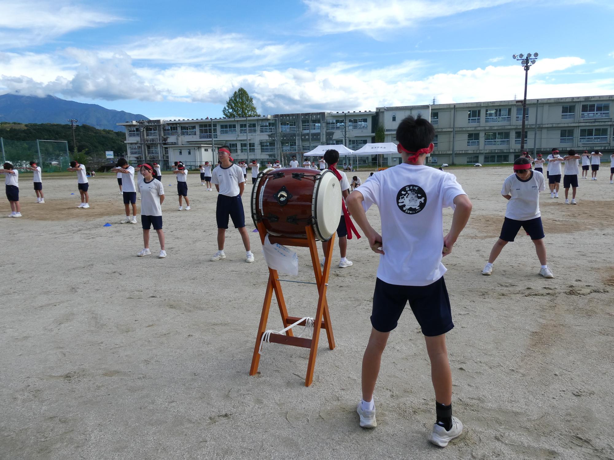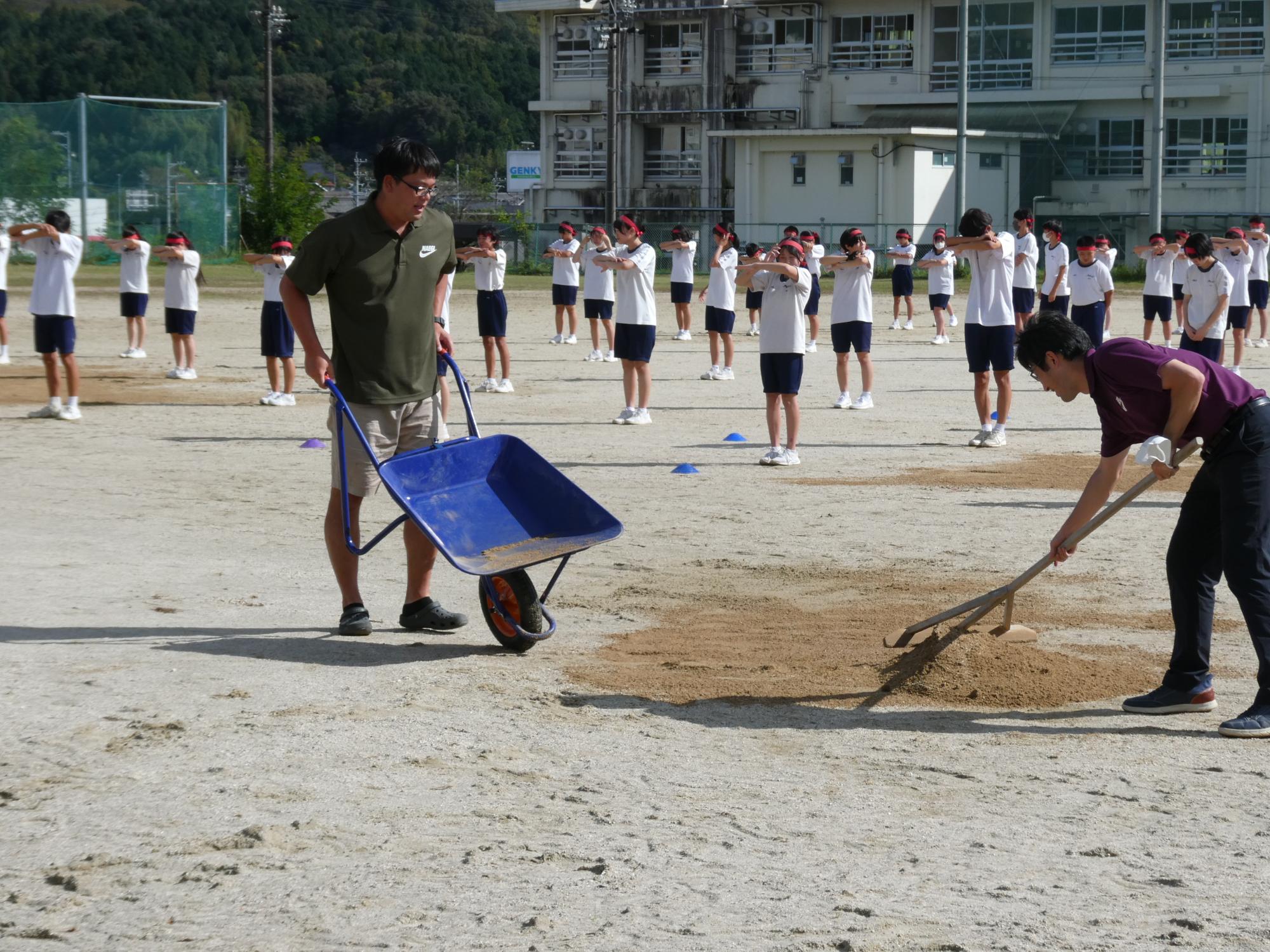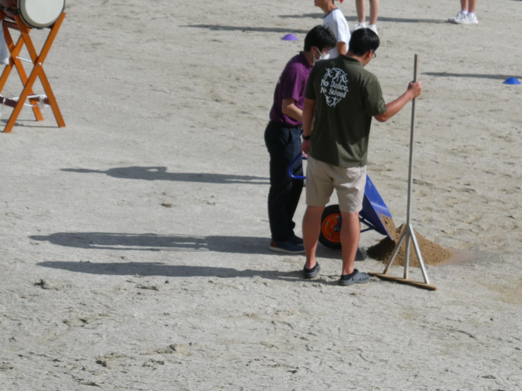 1時間目に予定されていた団練習は、予定を組み替え、5時間目に。それでもグラウンド状態は良くなかったので、先生たちによるグラウンド整備が続けられました。酷使したせいか、一輪車のタイヤがパンクしました。