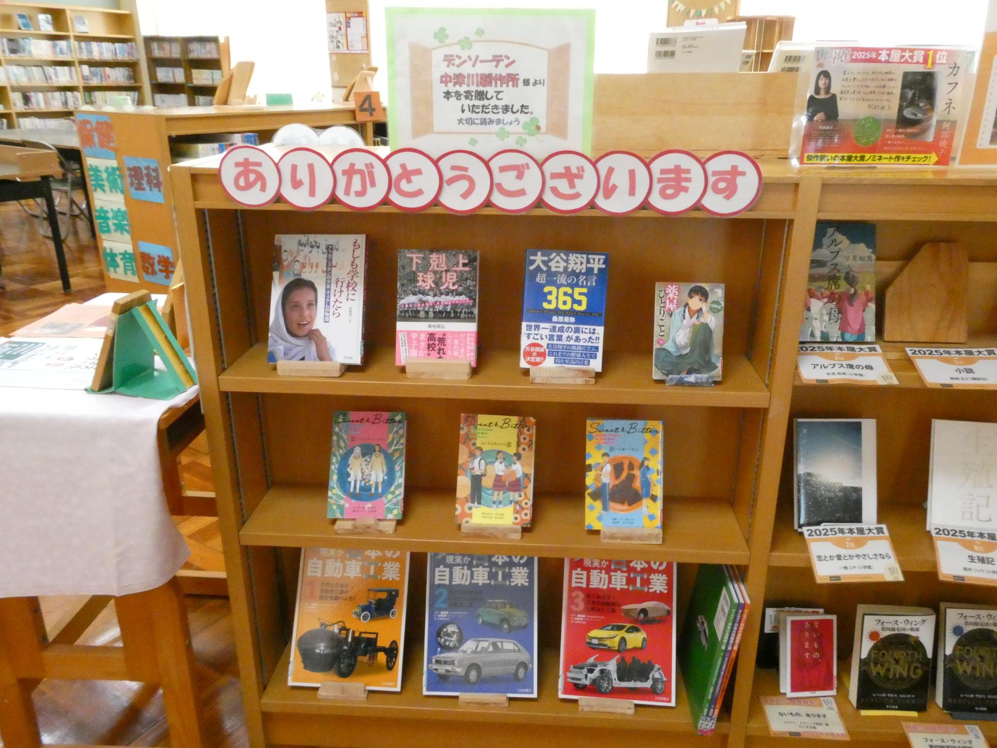 10月15日「デンソーテン様から図書の寄付をいただきました」 更新日:2025年10月15日 苗木にある、デンソーテン、中津川製作所様より、図書を寄付していただきました。 今日から専用コーナーを設置して、貸し出しを開始しました。 デンソーテン、中津川製作所様、ありがとうございました。