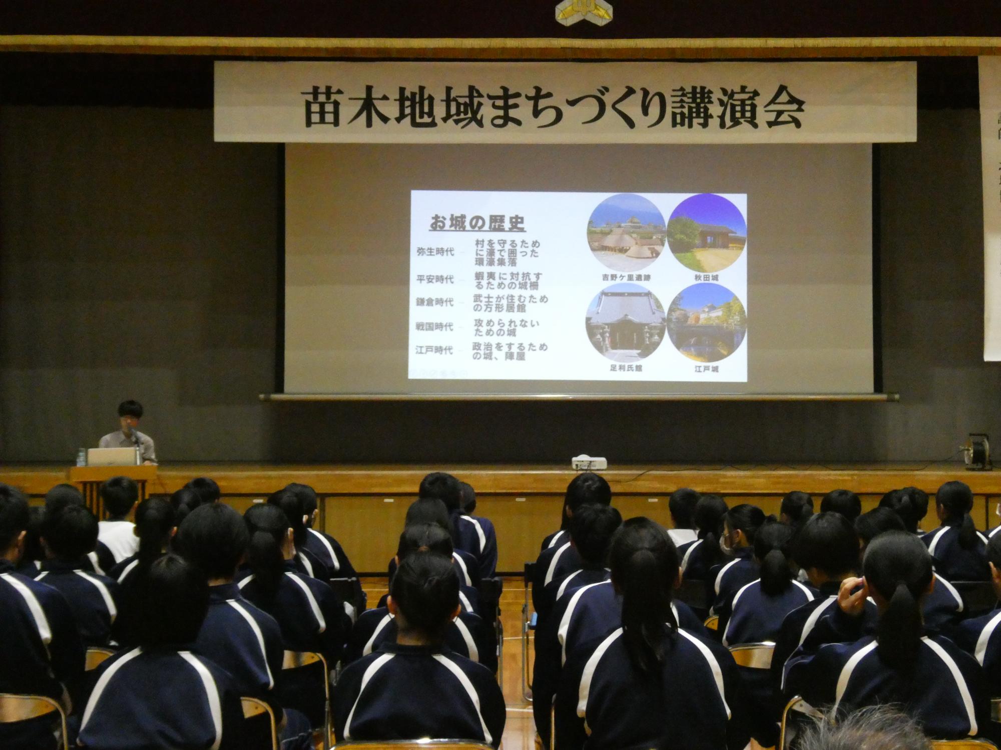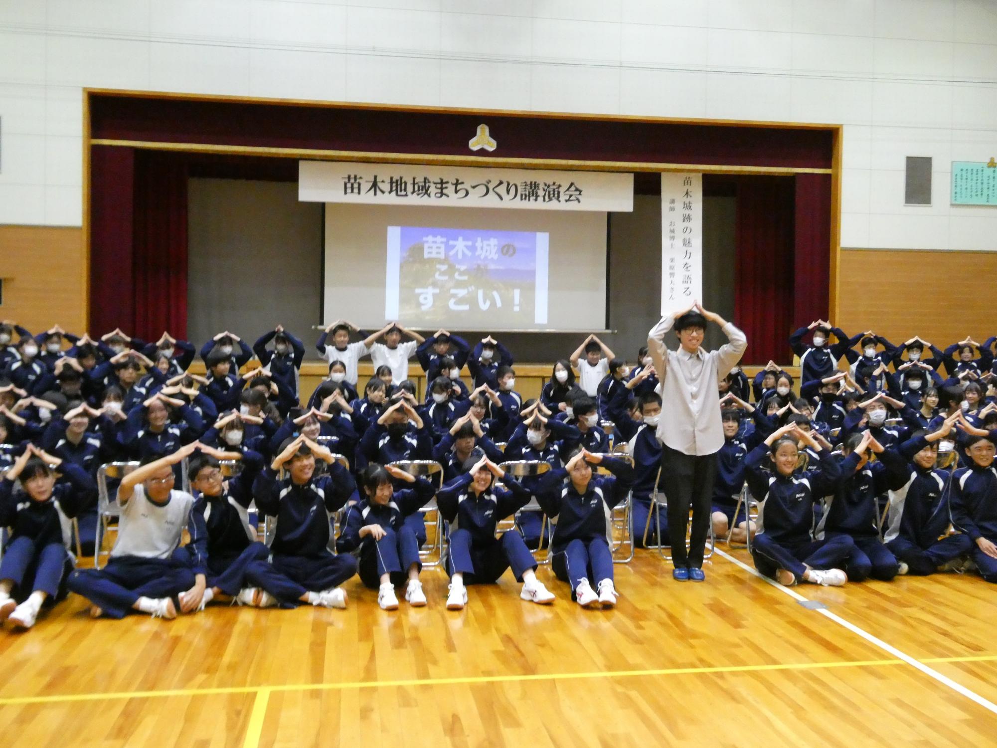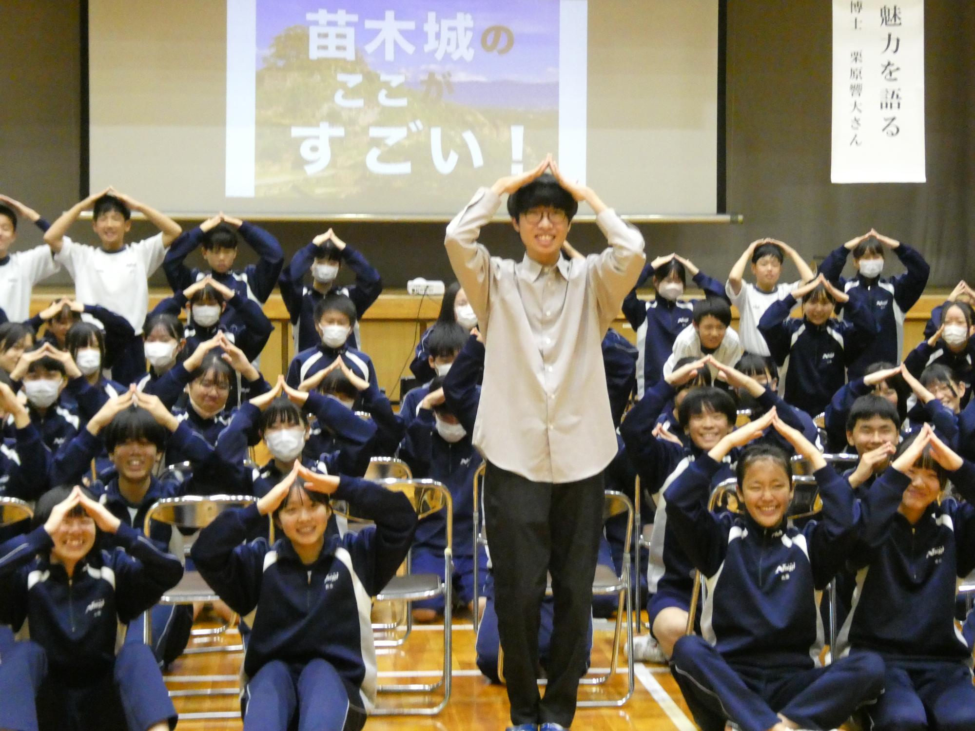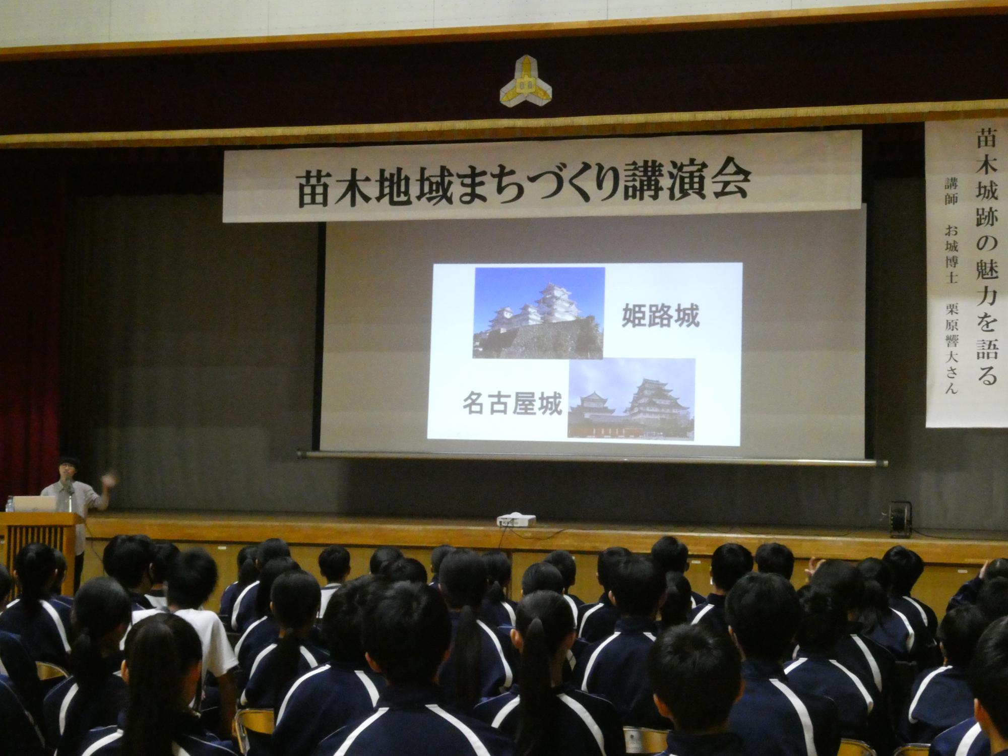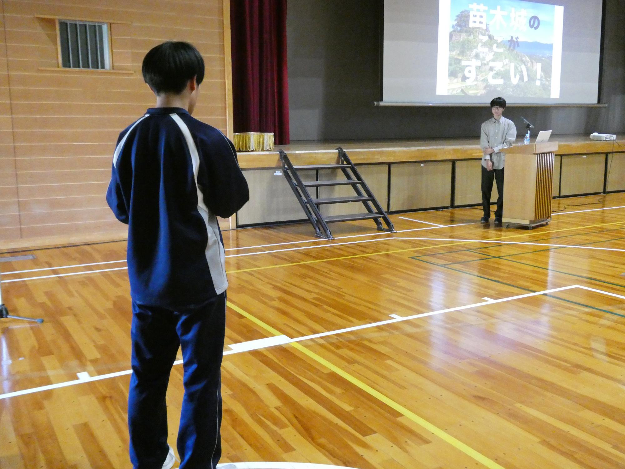 苗木城が築城500年を迎えます。そのプレイベントとして、苗木中学校と苗木まちづくり推進協議会の共催で、テレビなどで「お城博士ちゃん」として活躍していらっしゃる高校一年生、栗原響大(くりはらひびき)さんをお招きし、苗木中学校で講演をしていただきました。