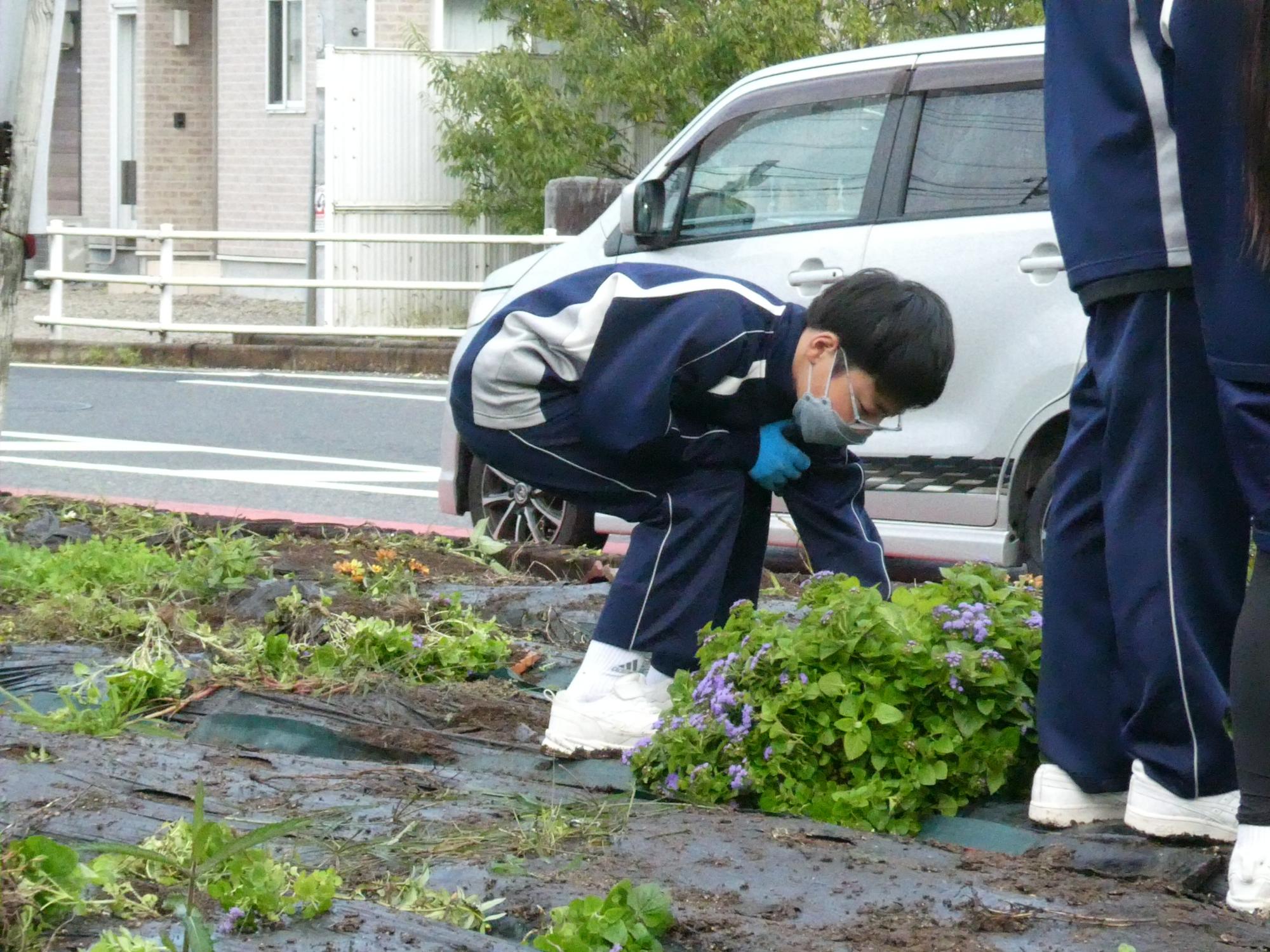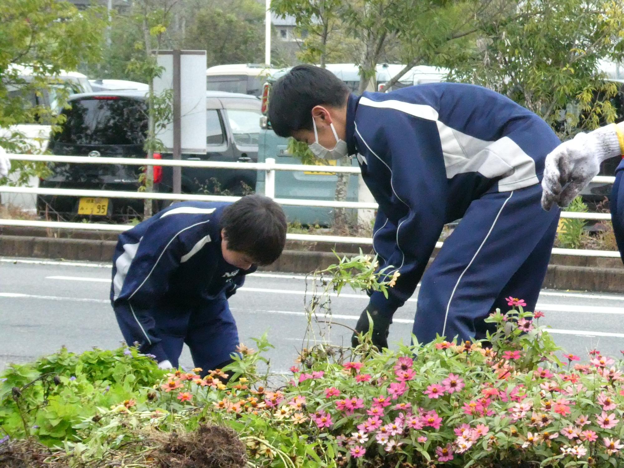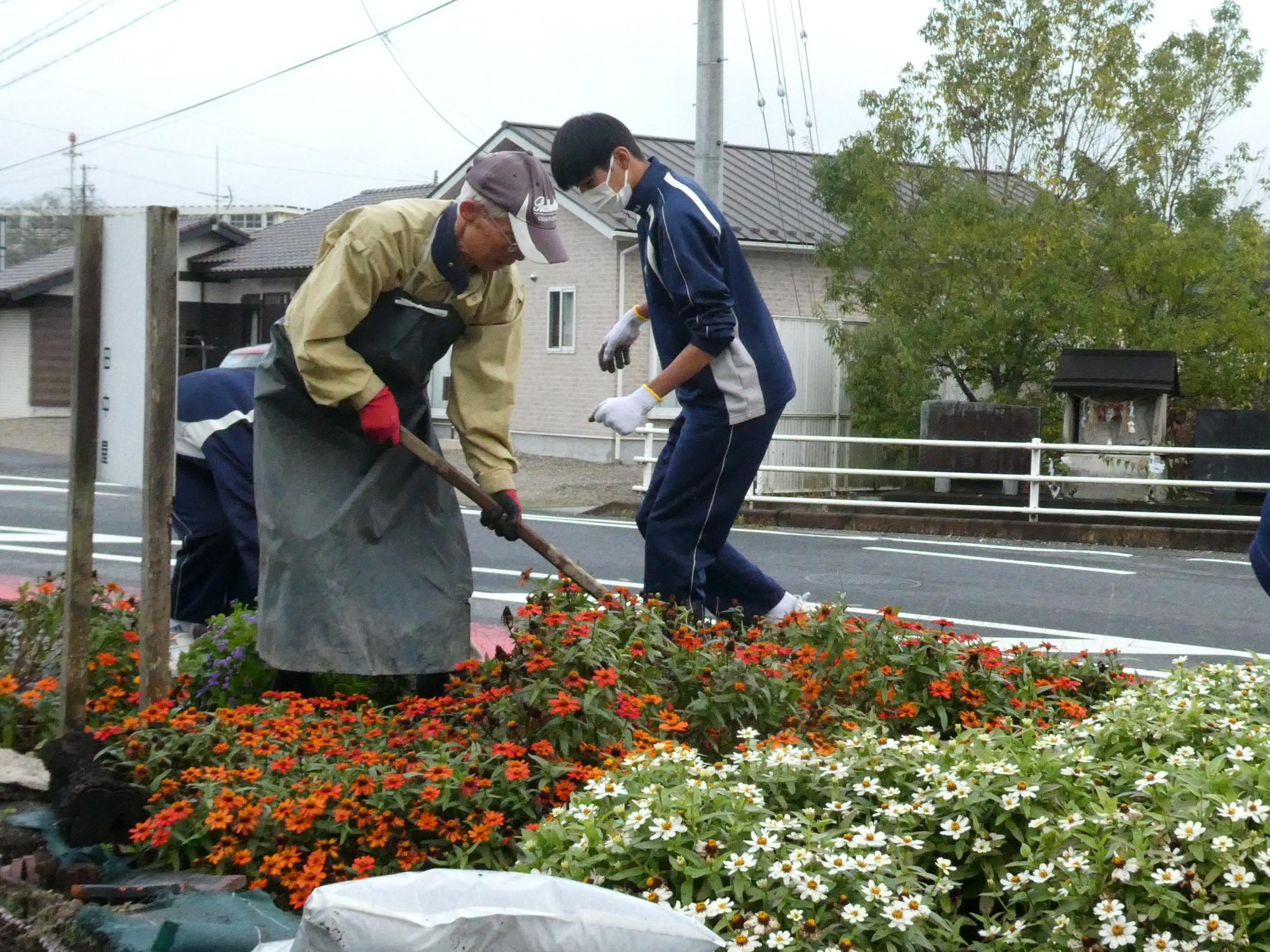 11月1日、土曜日の7時50分、多くの生徒たちが参加し、花壇ボランティア作業が行われました。地域の方々と一緒に、古い花を抜いて、新しい花を植える準備です。