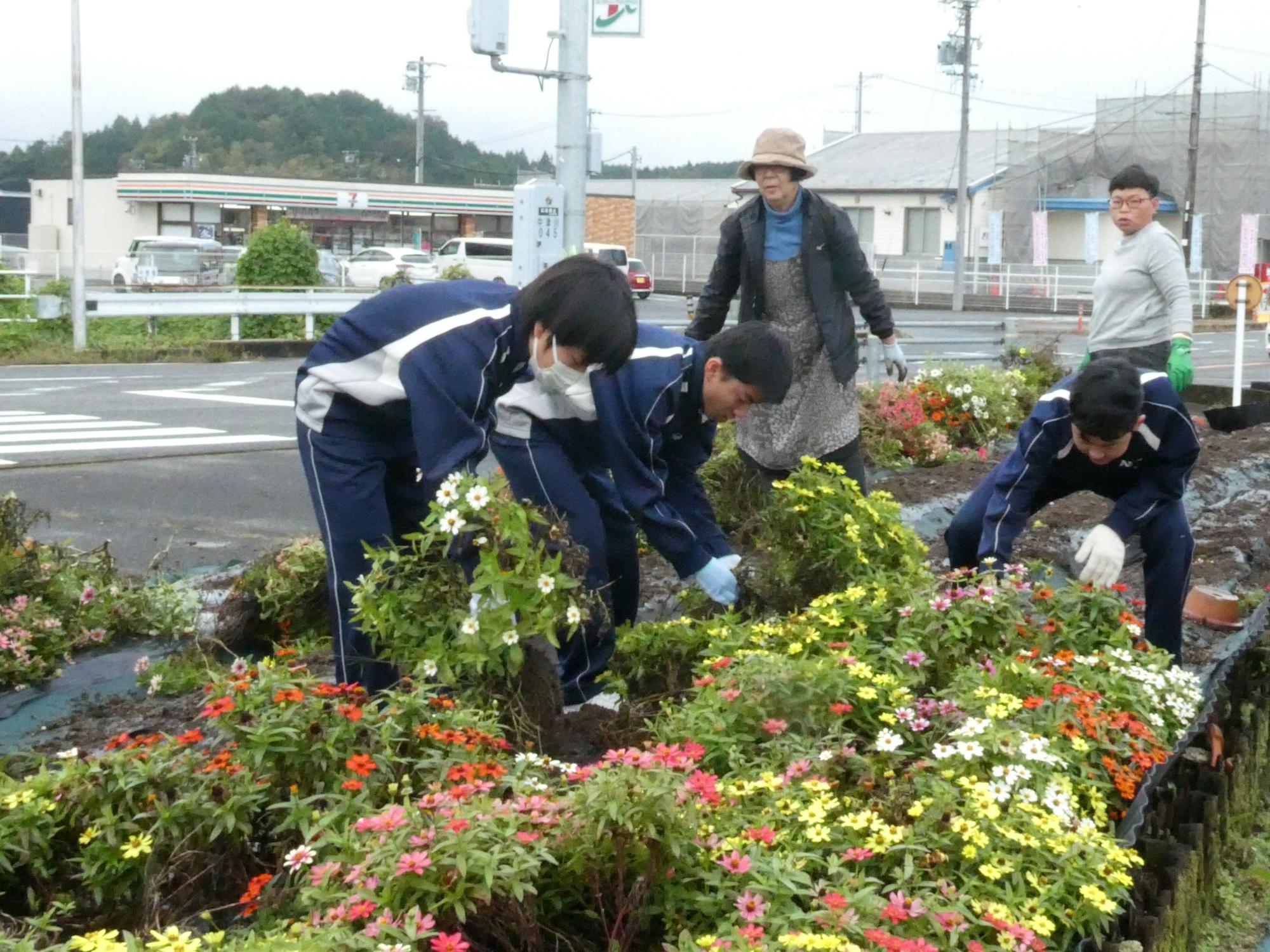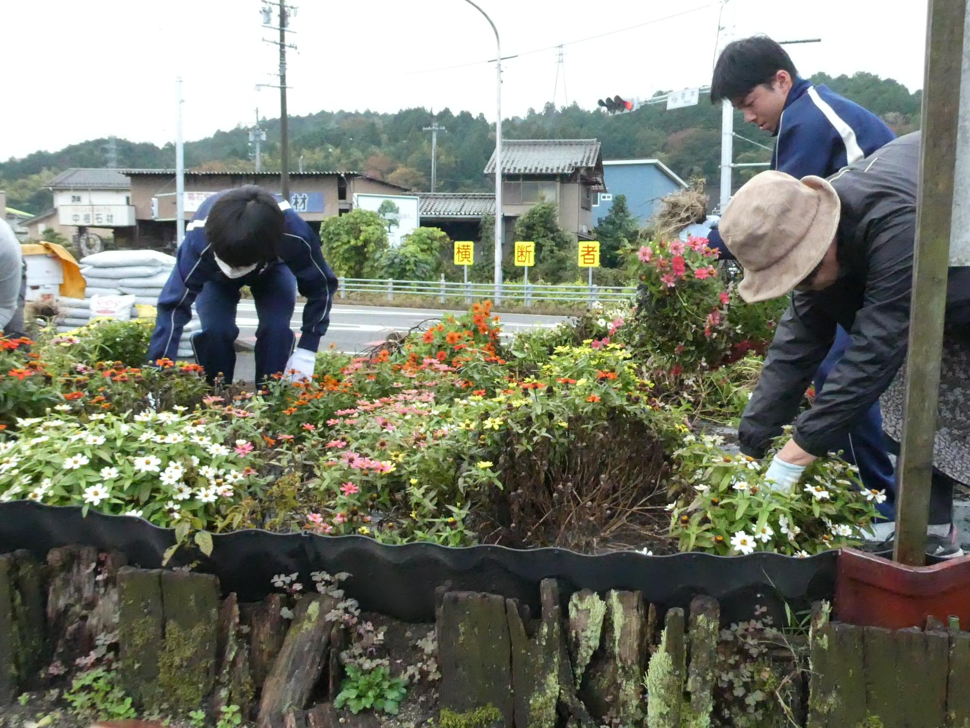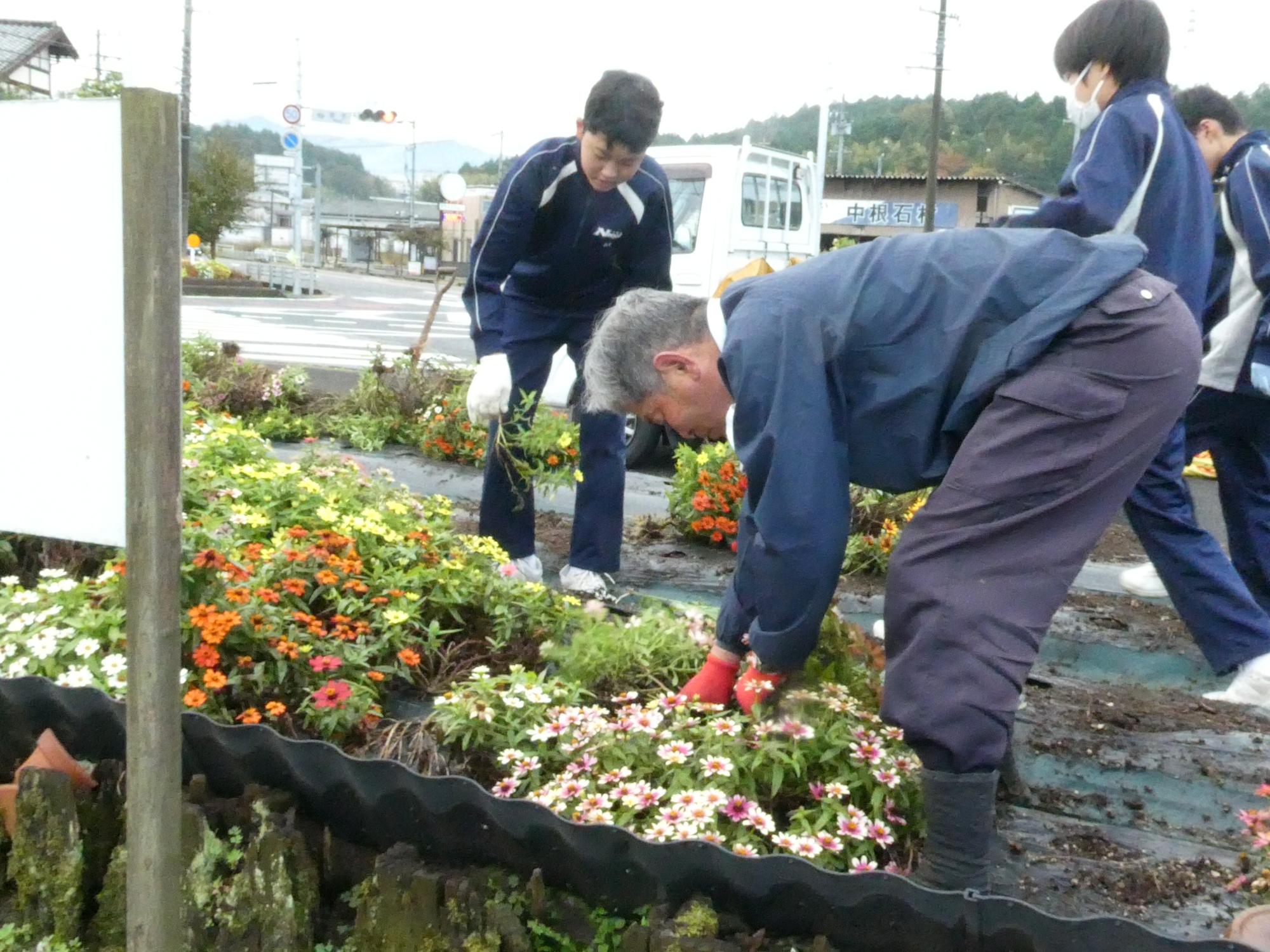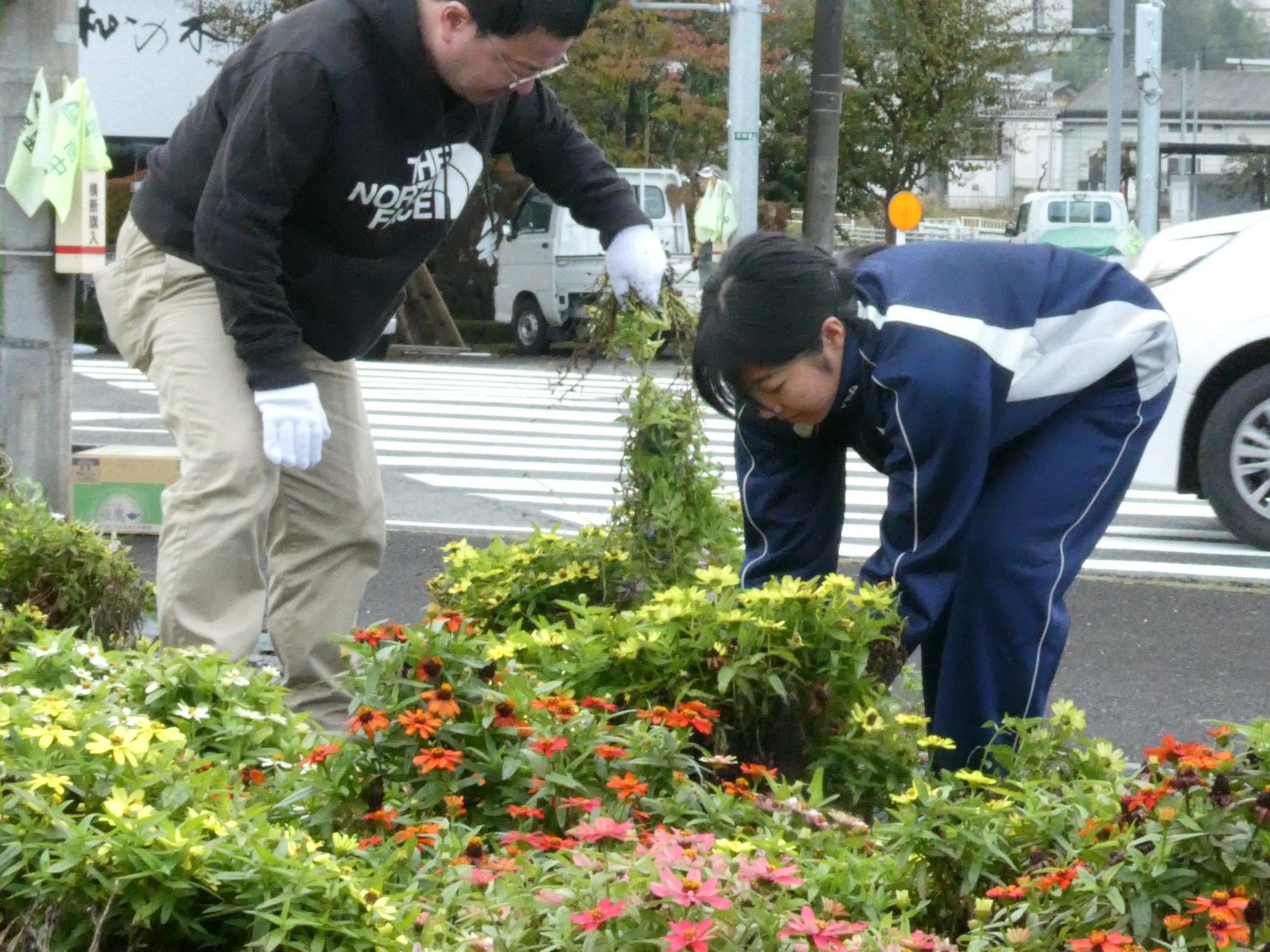 11月1日、土曜日の7時50分、多くの生徒たちが参加し、花壇ボランティア作業が行われました。地域の方々と一緒に、古い花を抜いて、新しい花を植える準備です。