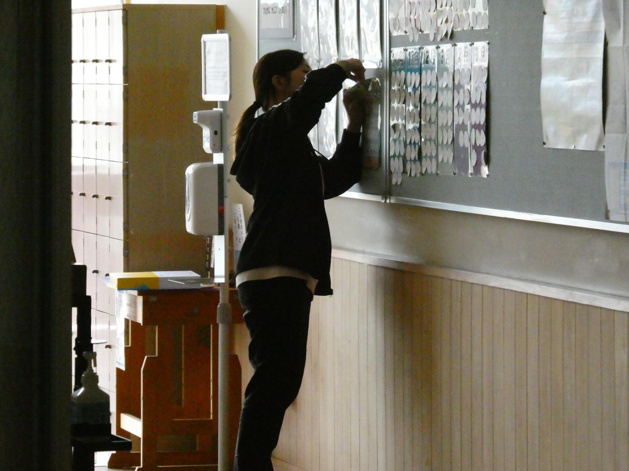 これを作って貼ってくれているのが、スクール・サポート・スタッフの山際さんです。以前にも紹介しましたね。毎日9時から12時まで、3時間だけお仕事に来てくれるので、授業中のみんなとは顔を合わせる機会がとっても少ないと思います。