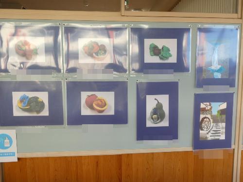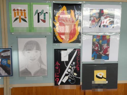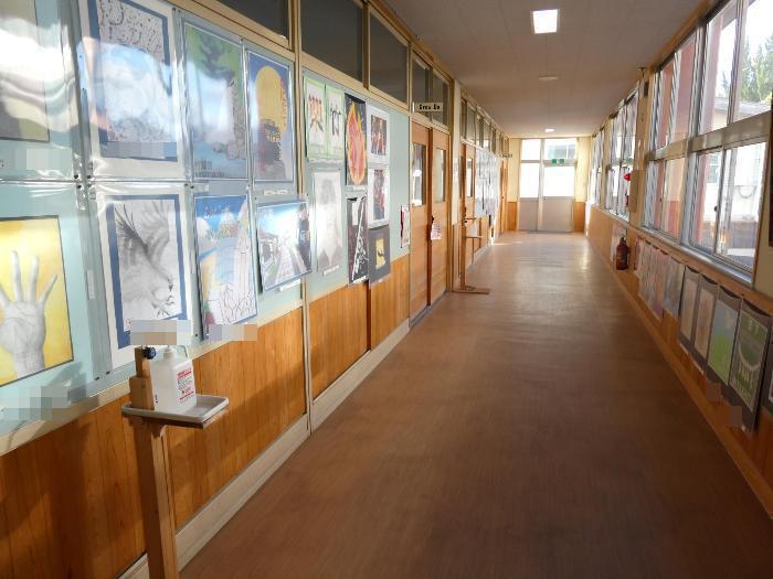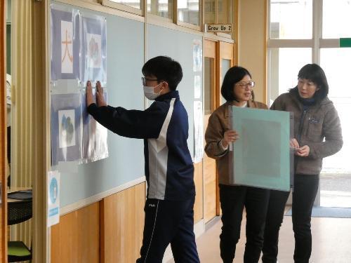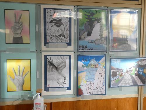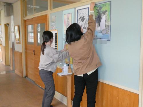中津川市内の中学生の美術作品を、順番に各学校に回して展示する、「子供作品移動展」の作品を、美術の征矢先生、そして、用務員の津田さん、サポートスタッフの山際さんが、廊下に展示してくれました。お手伝いをしてくれた生徒もいました。「ありがとう~」