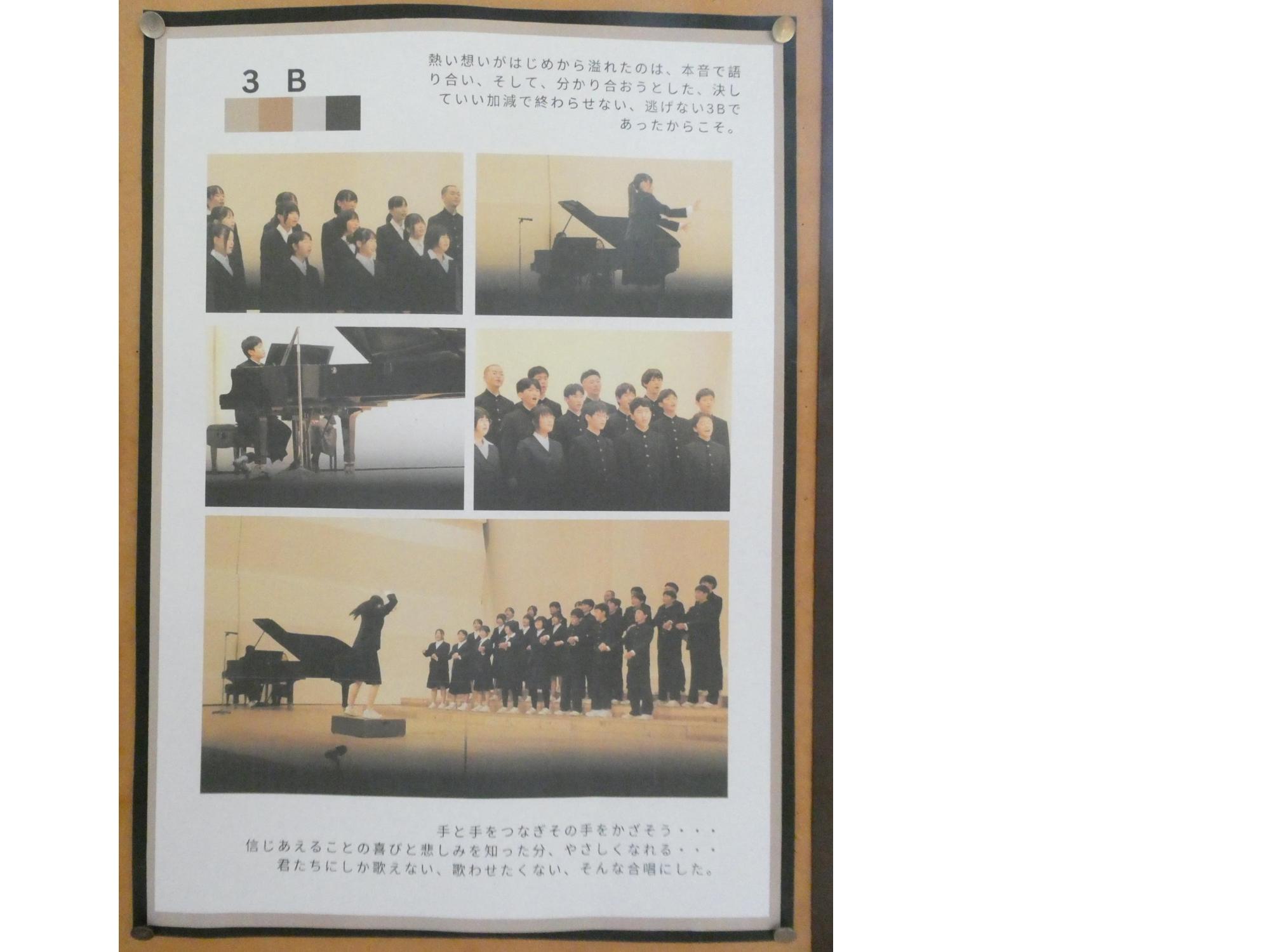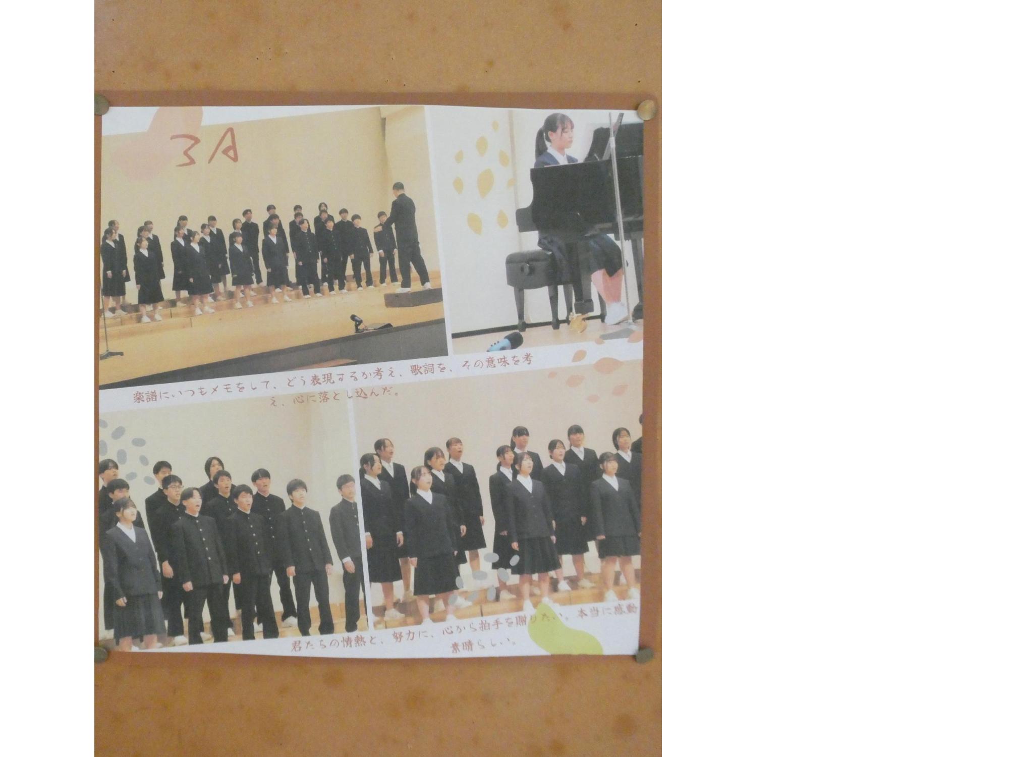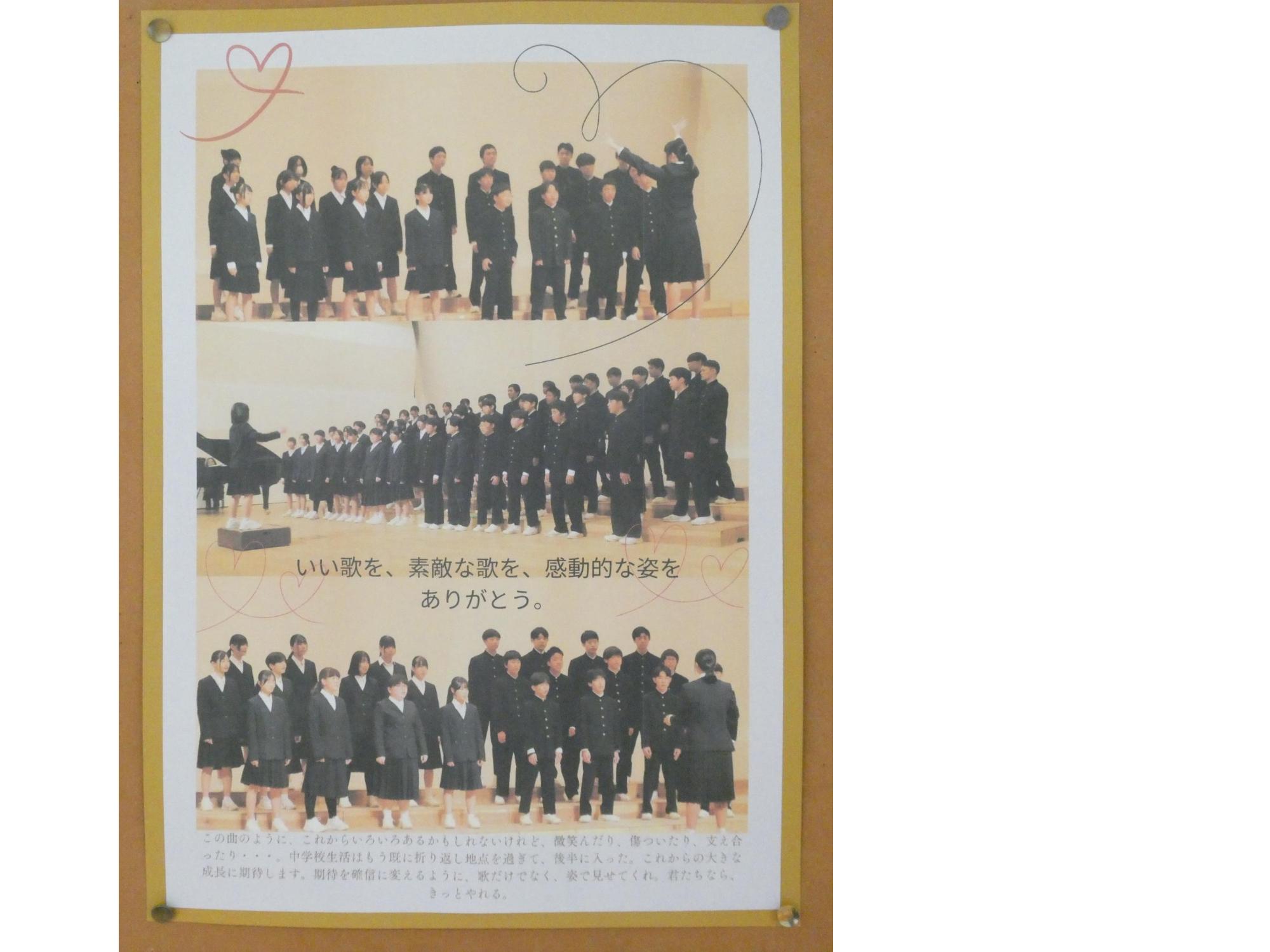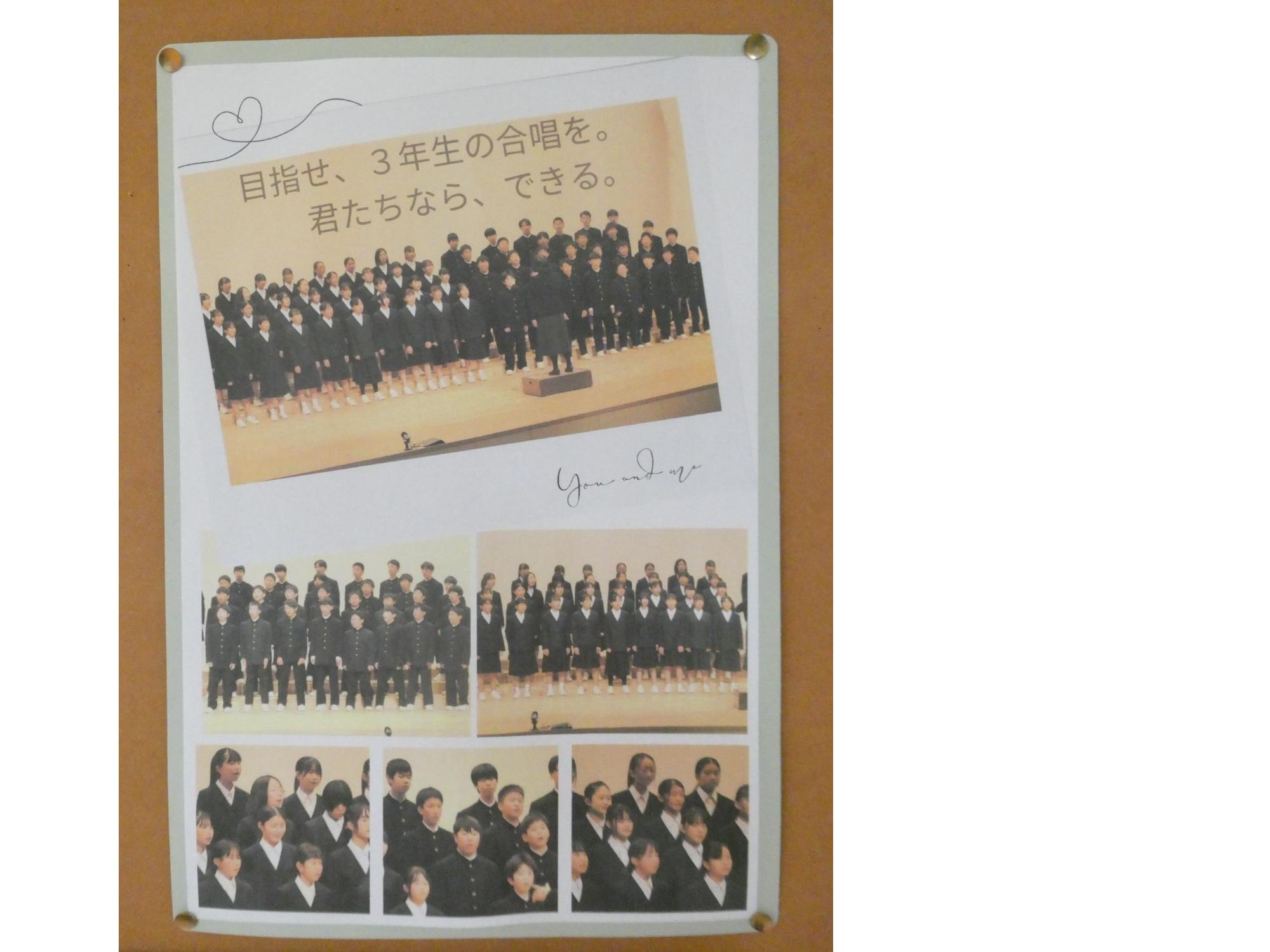 あの感動を忘れるな、あの輝きを忘れるな・・・ということで、スクール・サポートの山際さんが、各学年向けにホームページの写真やコメントで合唱祭の掲示を作ってくれました。「これを見て、頑張った自分や、頑張った仲間を思い出し、これからの生活も頑張ってね。」という山際さんからのメッセージ・・・だと、思う(笑)