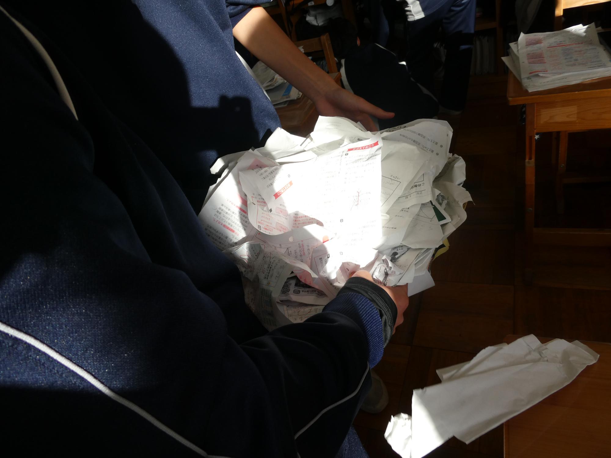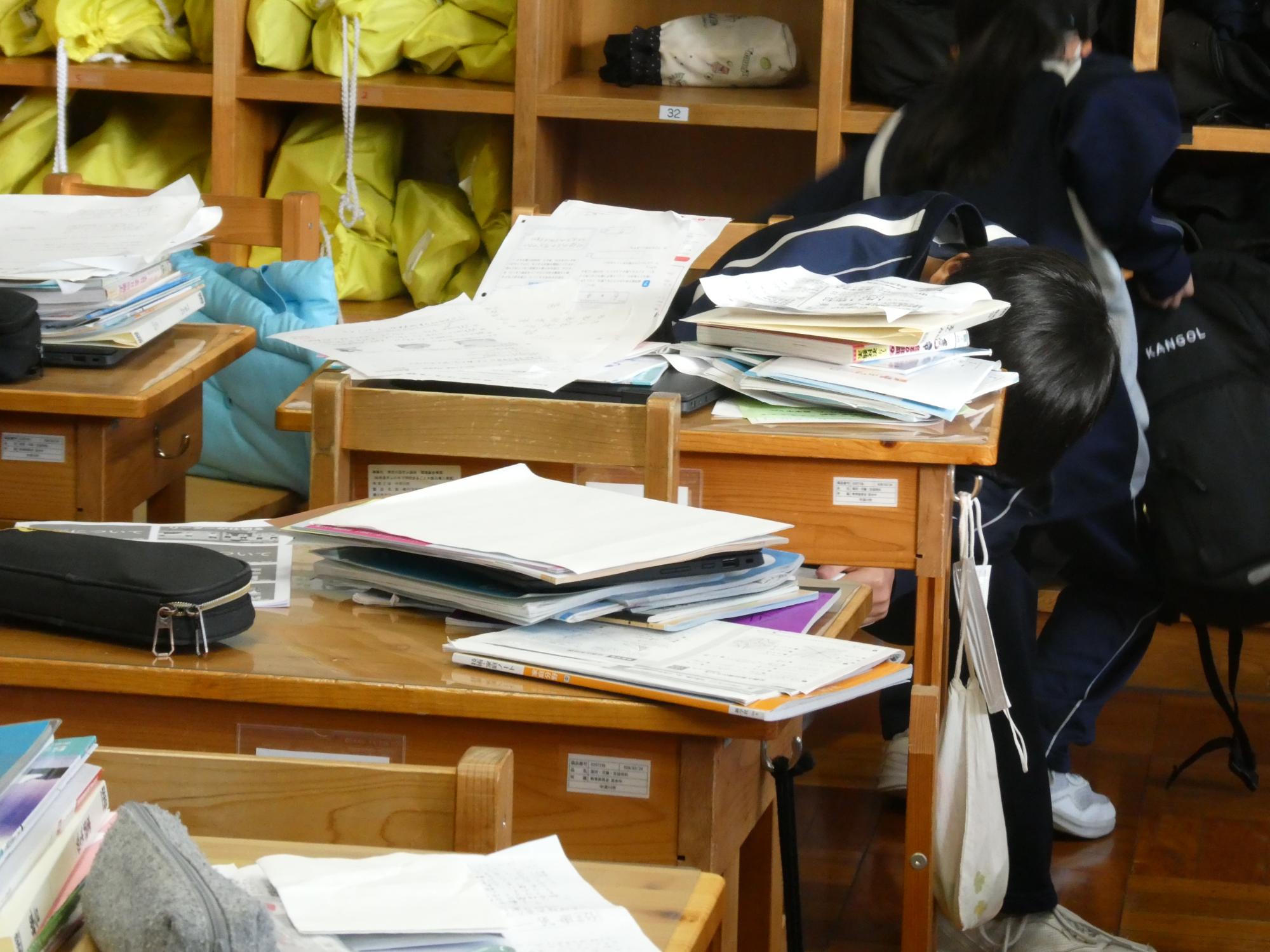 机の中から、こんなにも不要なプリント、くしゃくしゃになった紙類が出てきた強者(つわもの)が登場。ちょっと教室がどよめきました(笑)