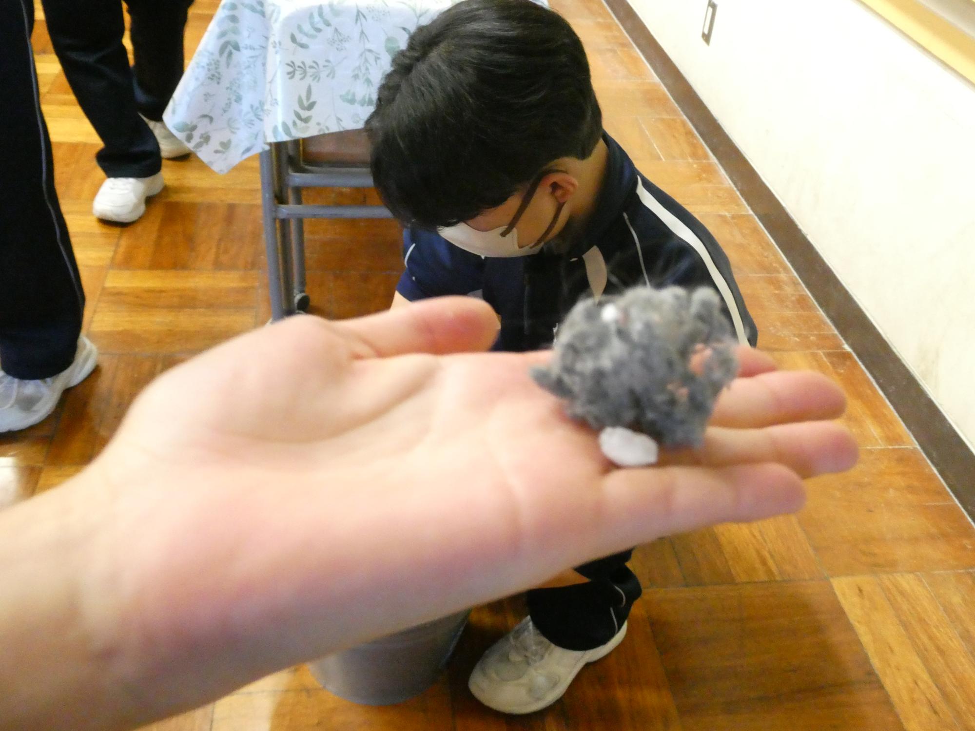 バケツで雑巾を絞っている男子を撮ろうとしたら、目の前にゴミ。こんなにゴミが付いてたよと見せてくれたのですね。撮ろうとしていた男子の姿がかくれました。ありがとう。