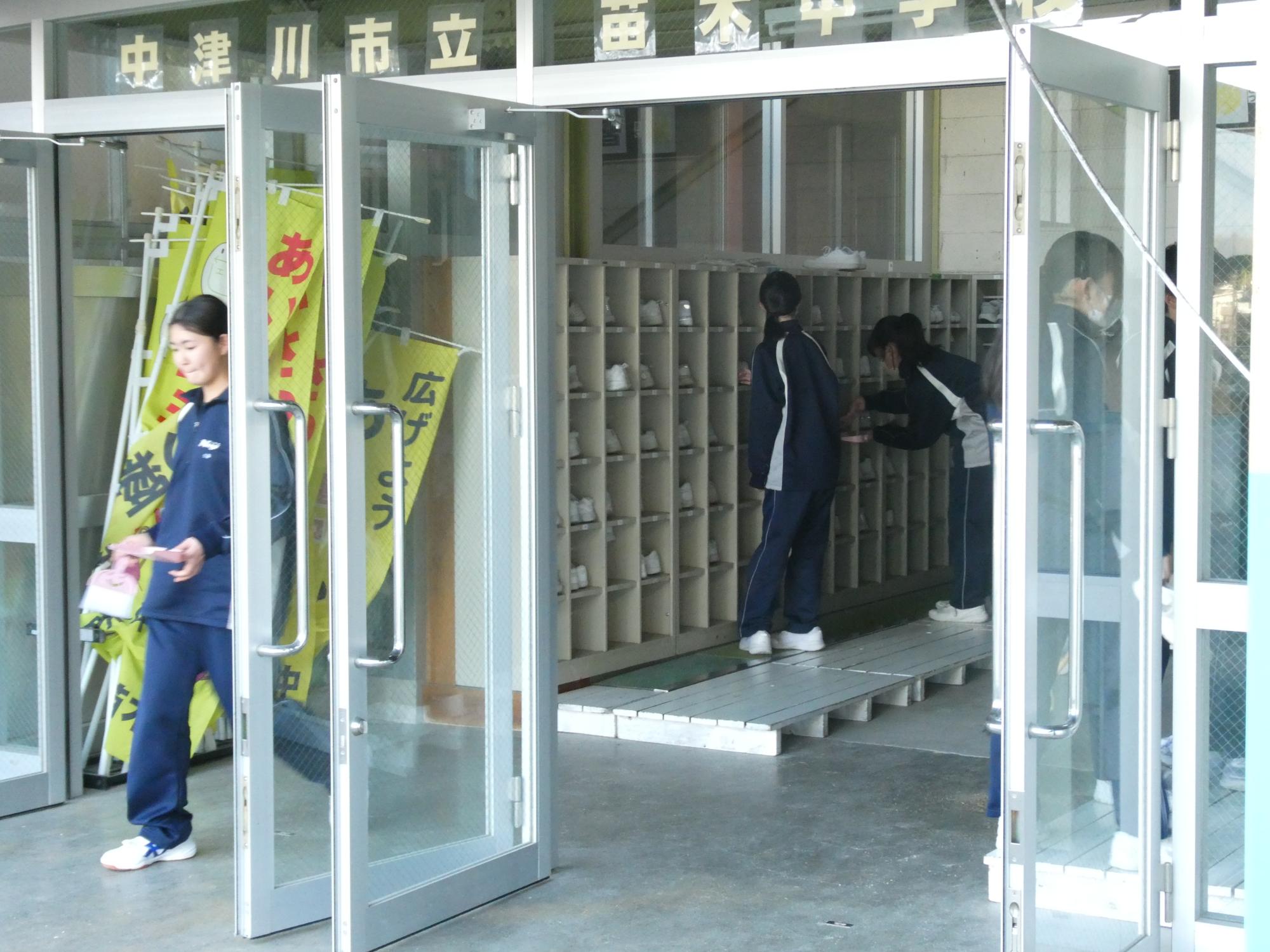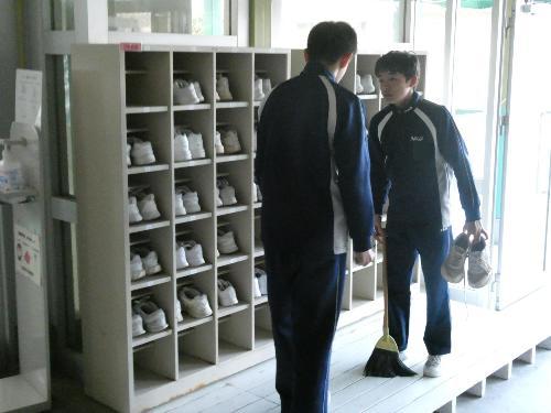 机が終わった生徒は、下駄箱の掃除です。砂やホコリを掃き出して、水拭きをしましょう。