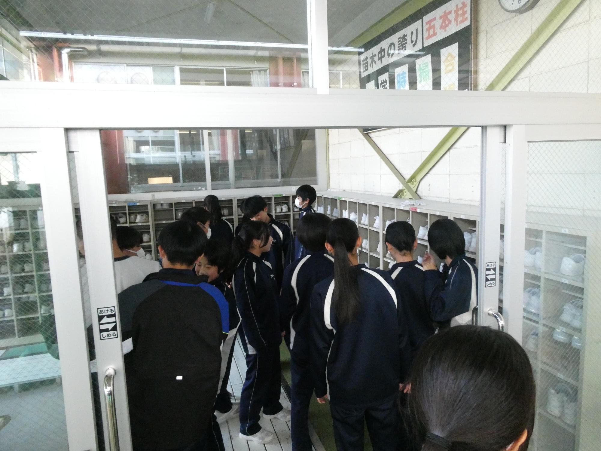 下足箱が大渋滞で順番を待っている2人