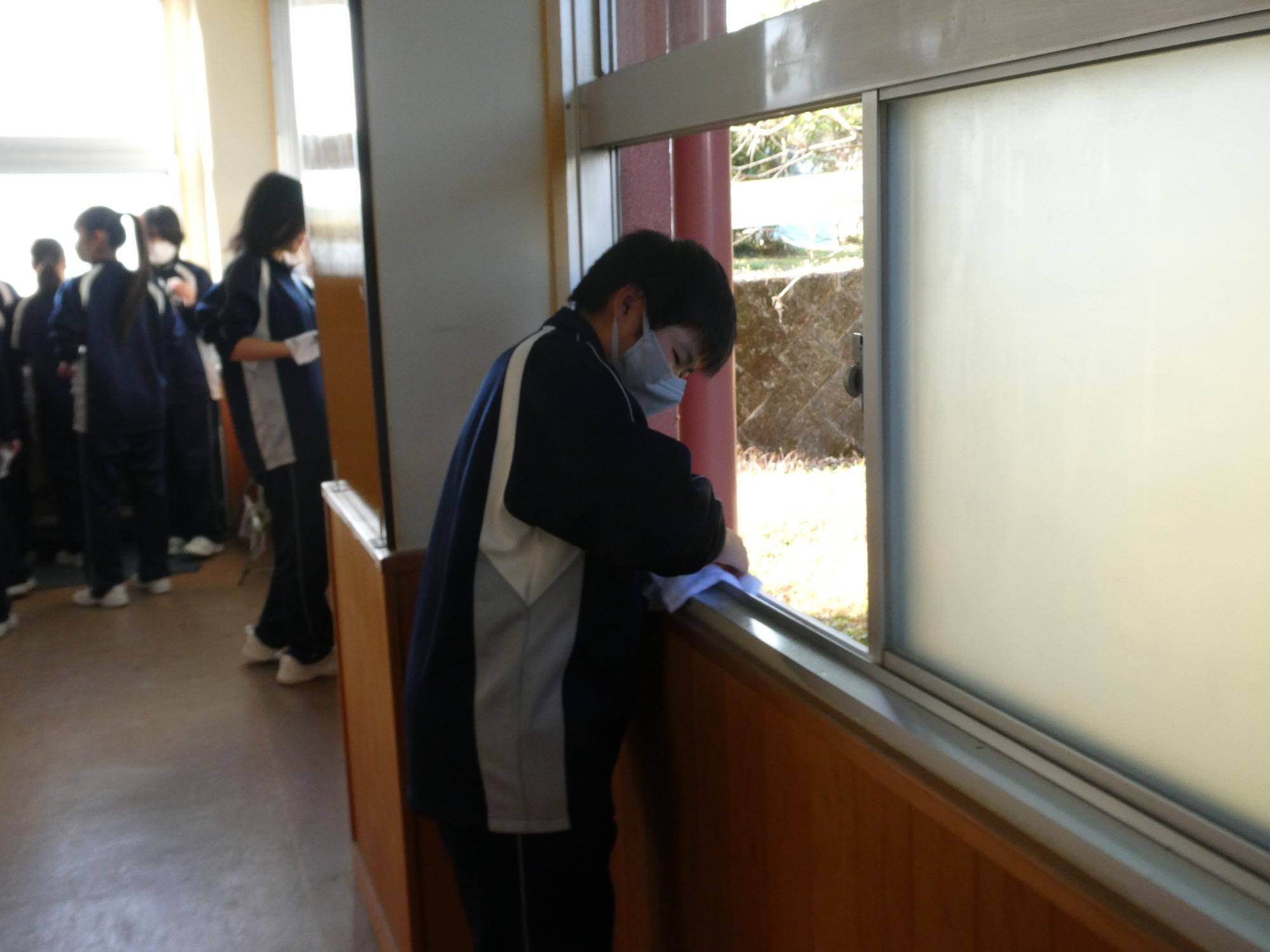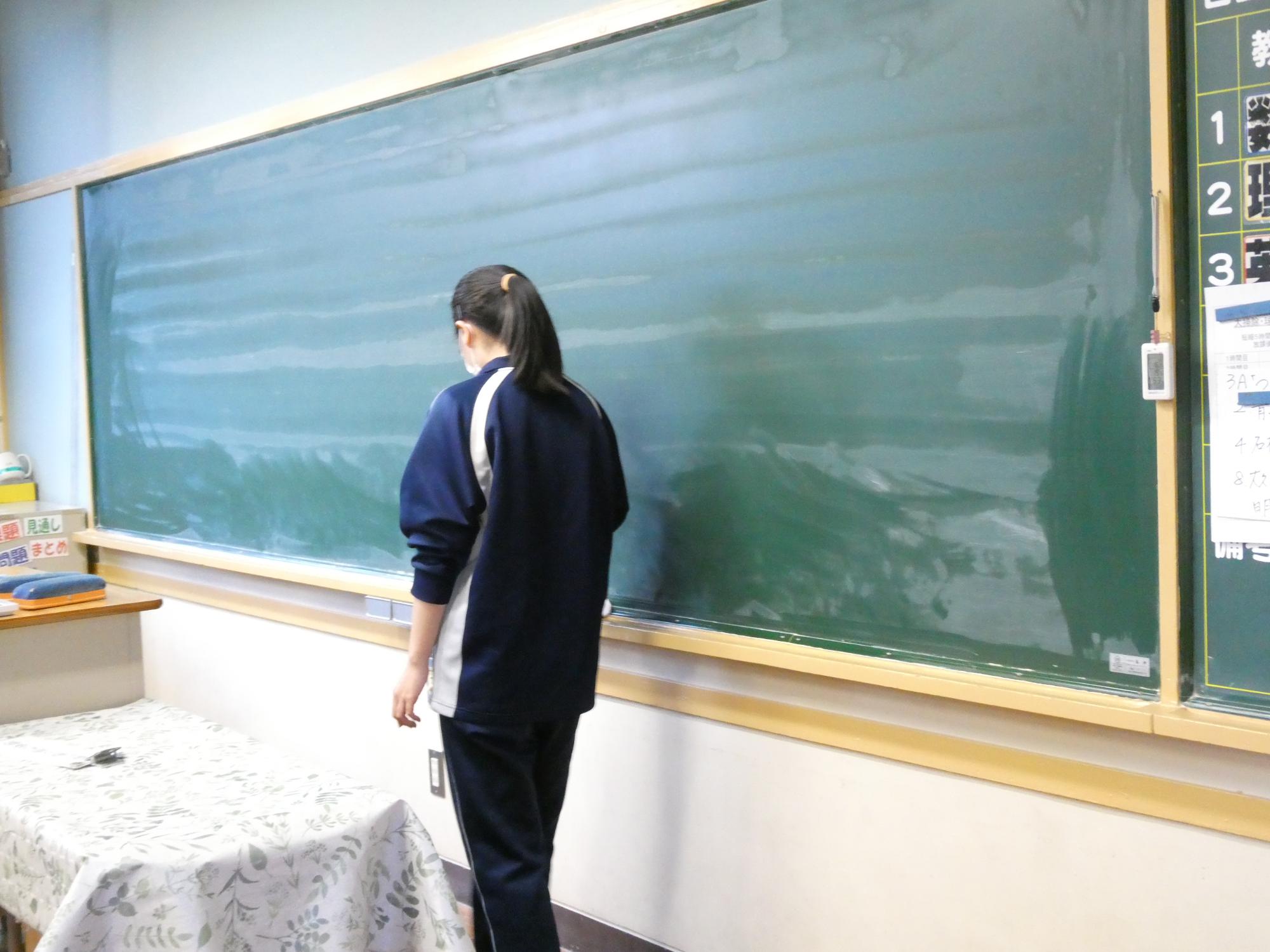 下足箱が終わったら、教室掃除です。日ごろやっていない、窓のレールや黒板の上などもきれいに拭き掃除です。