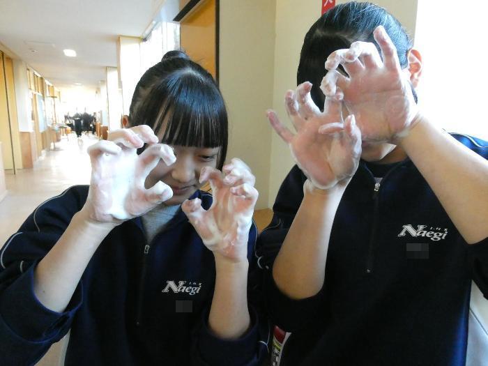 掃除が終わって、石鹸で念入りに手をアワアワにしている2人