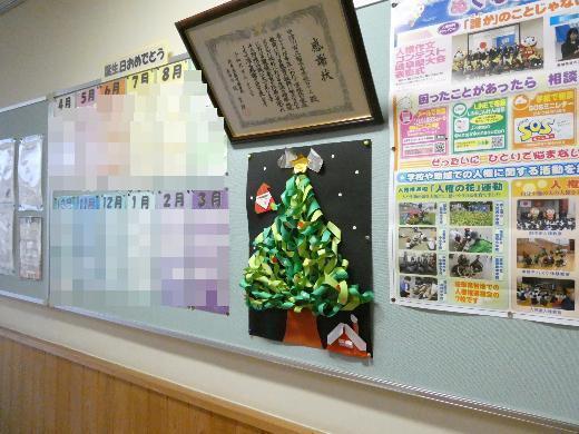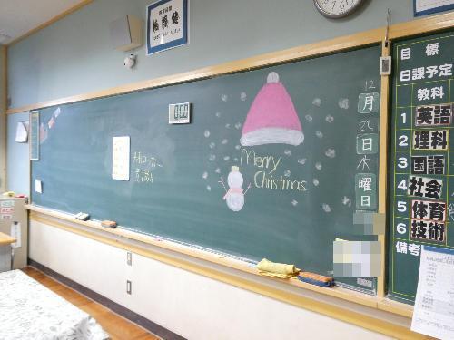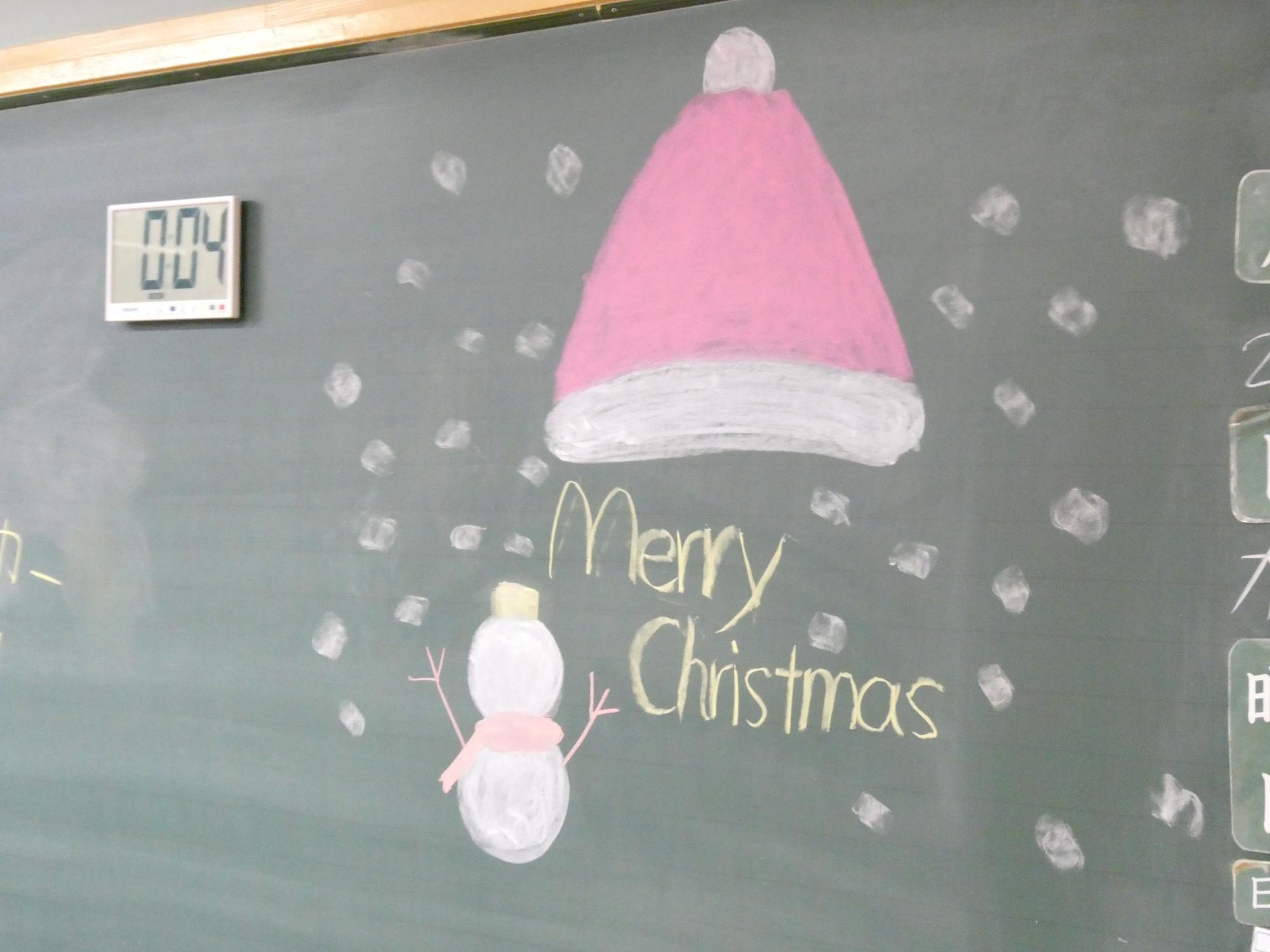 12月25日「merry christmas」 更新日:2025年12月25日 3年生の教室の黒板に描かれた「Merry christmas」 苗木中の玄関の掲示板に飾られた「christmas tree」 スクールサポートスタッフの山際さんの作品です。
