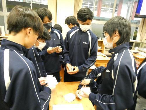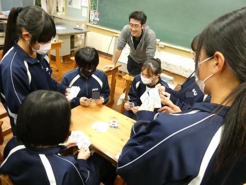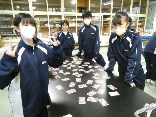 前半は、理科らしい理科の授業。終わりころにもう一回行ってみると、カードゲームしてました。あれ?・・・カードを見てみると、「元素記号」「DNA」「電気」「生物」のカード・・・理科?・・・合ってます。理科です。