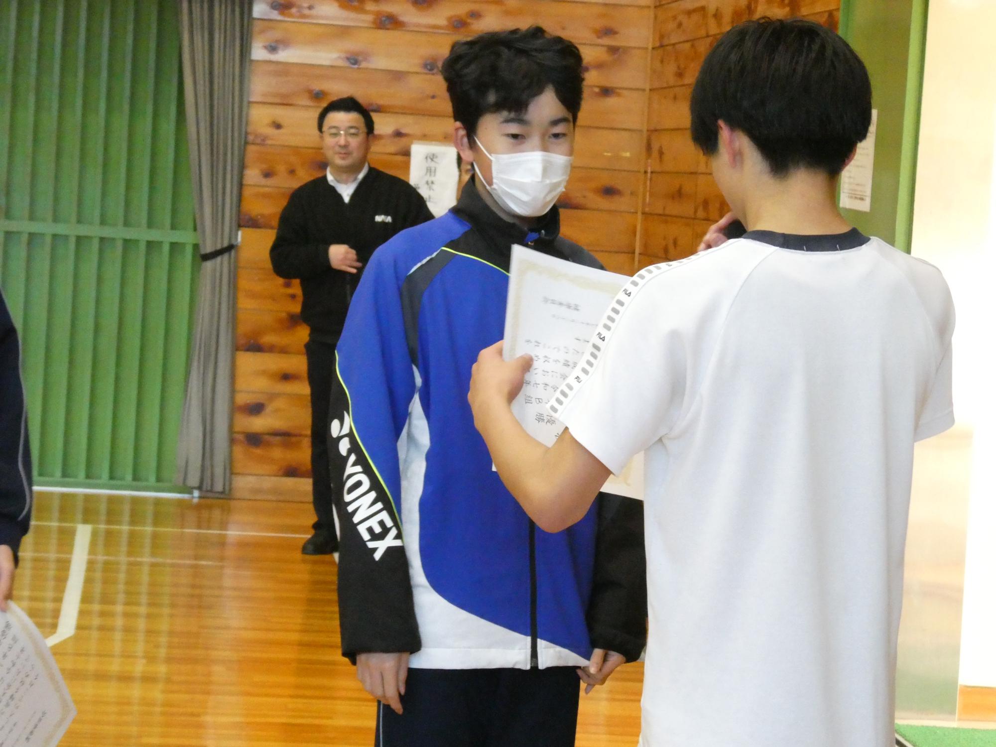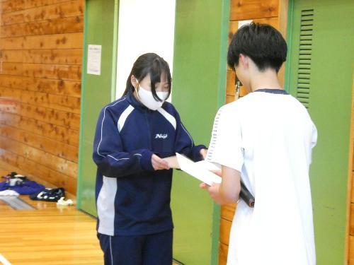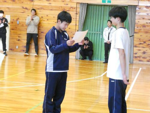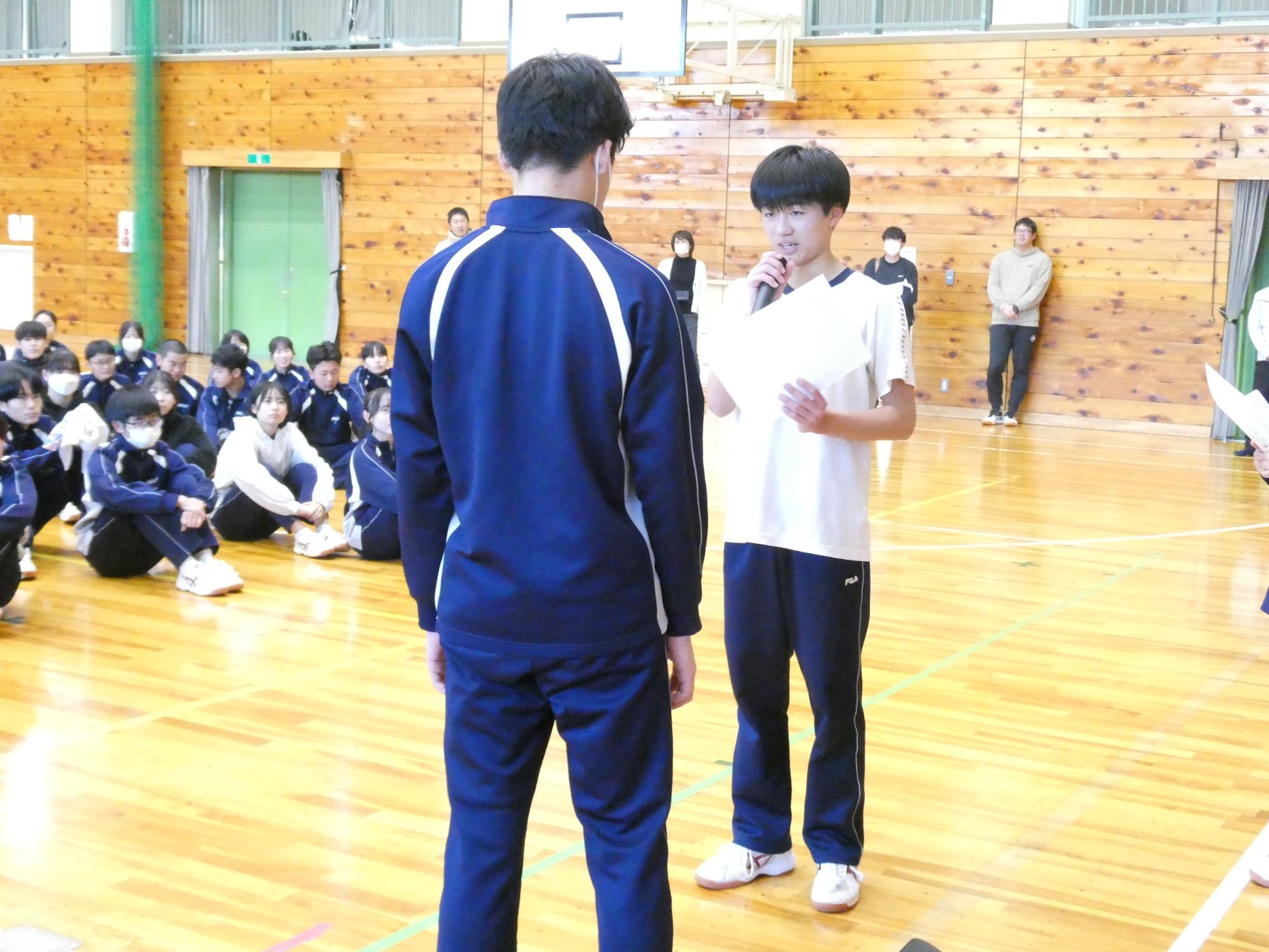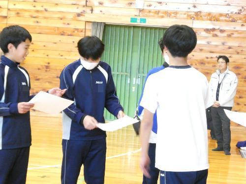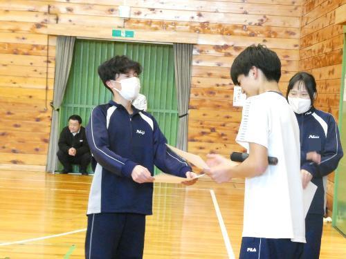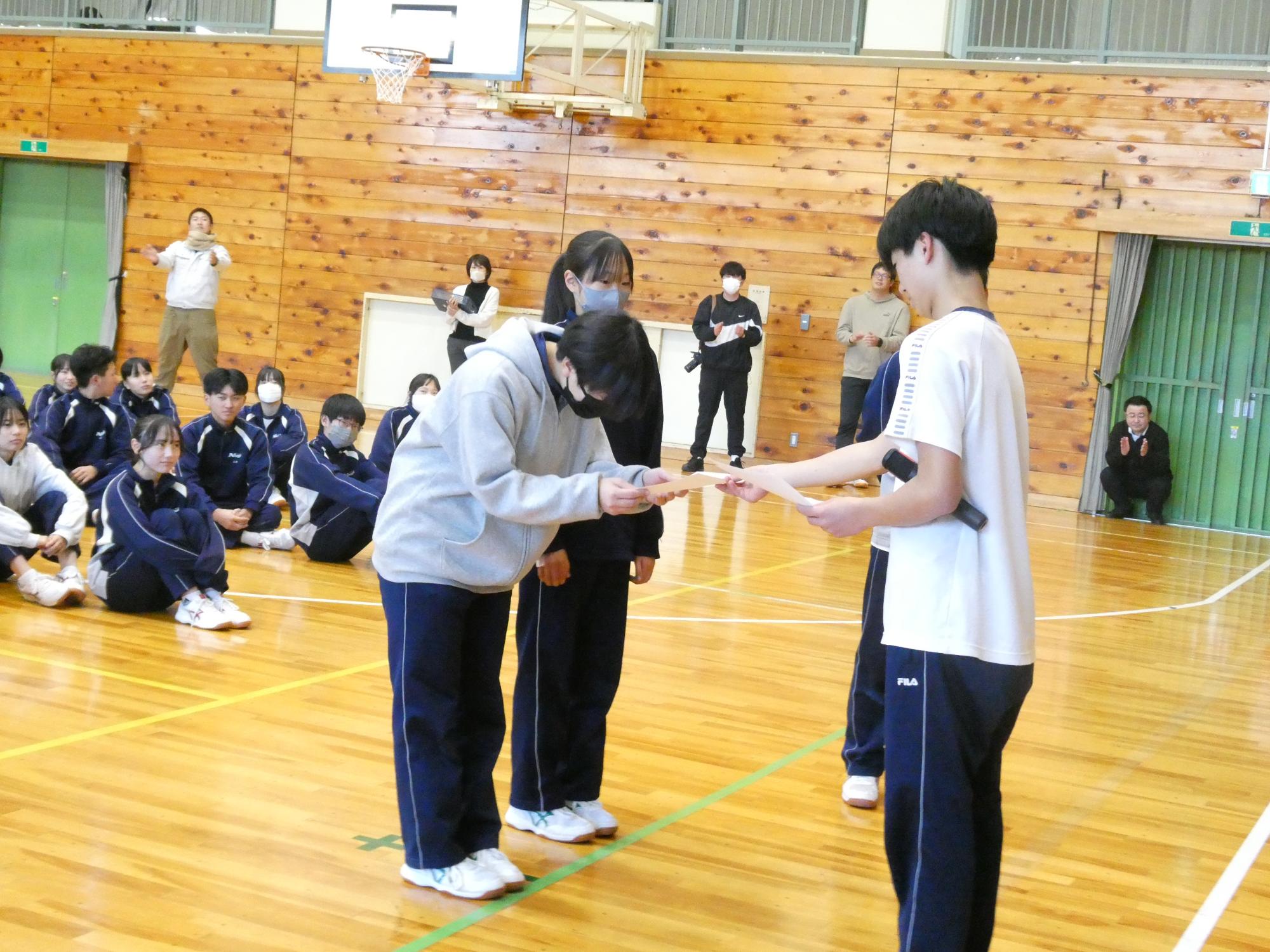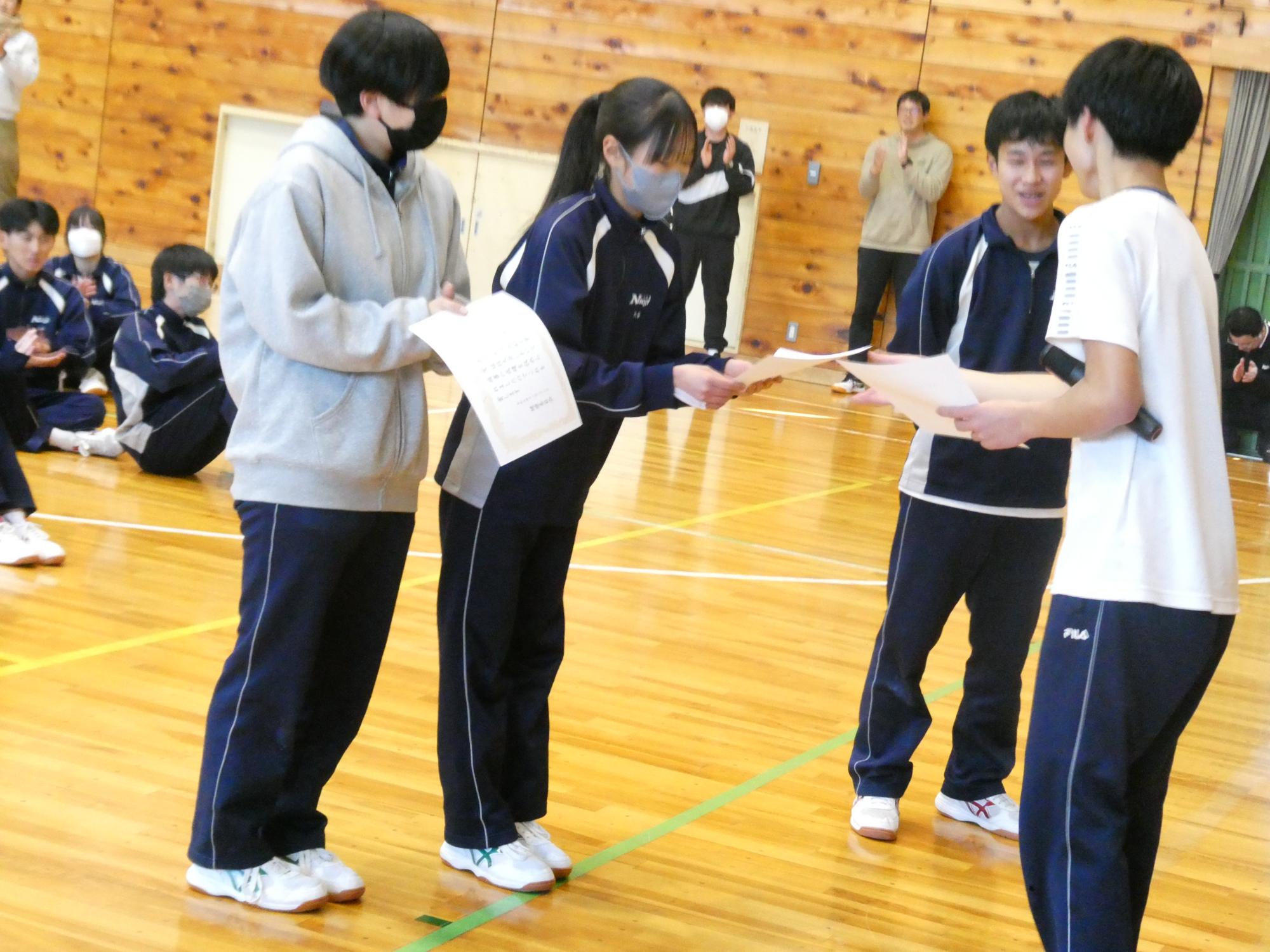 主催者、健康委員長より、バレーボール、バスケットボール、サッカー、ボッチャの4種目の1位から3位までの学級に、表彰状が渡され、6日間に渡る球技大会が終了しました。