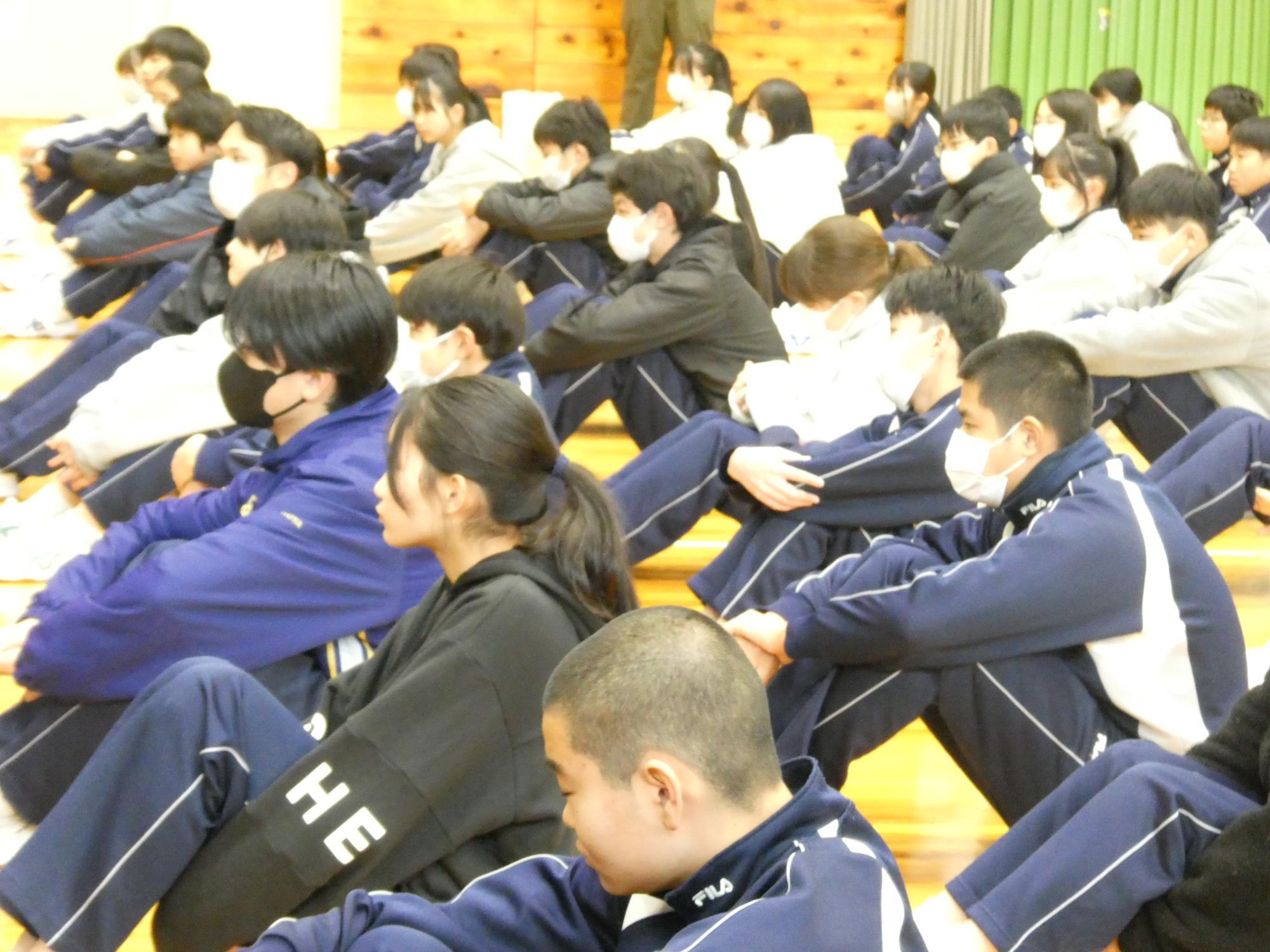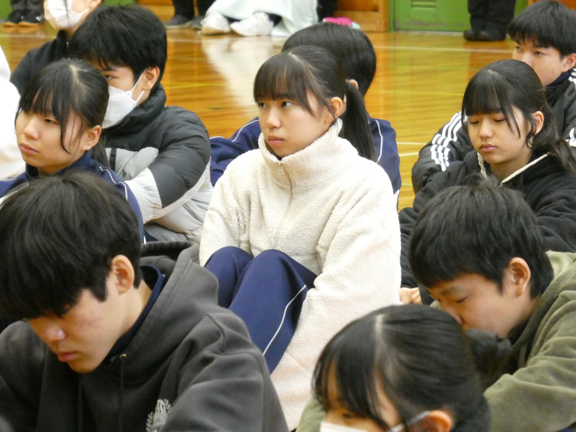 他校の集会の様子をHPなどで見ると、ちゃんと上着を脱いで整列しています。すご~い。苗木中は寒いからやりません(笑)
