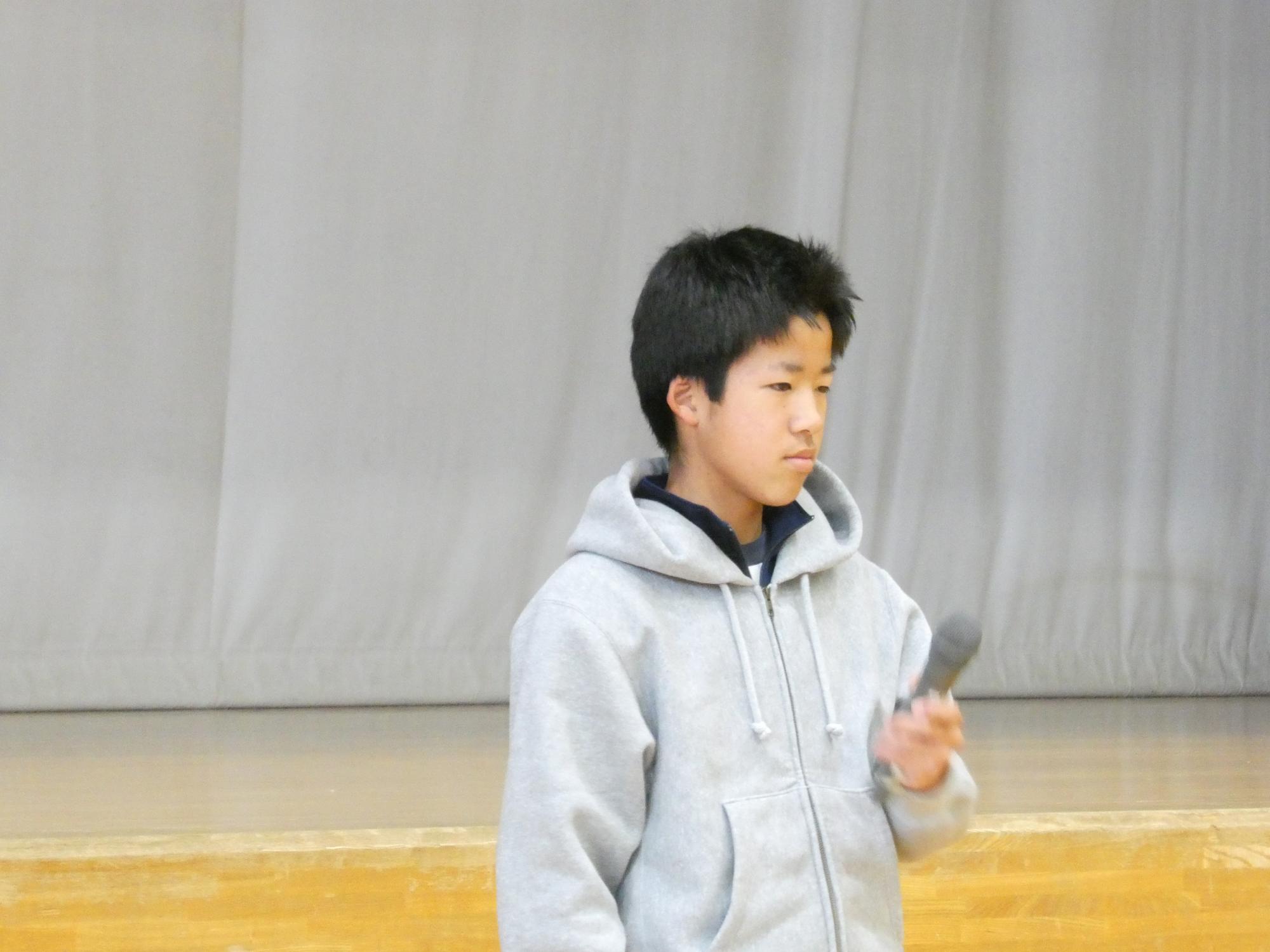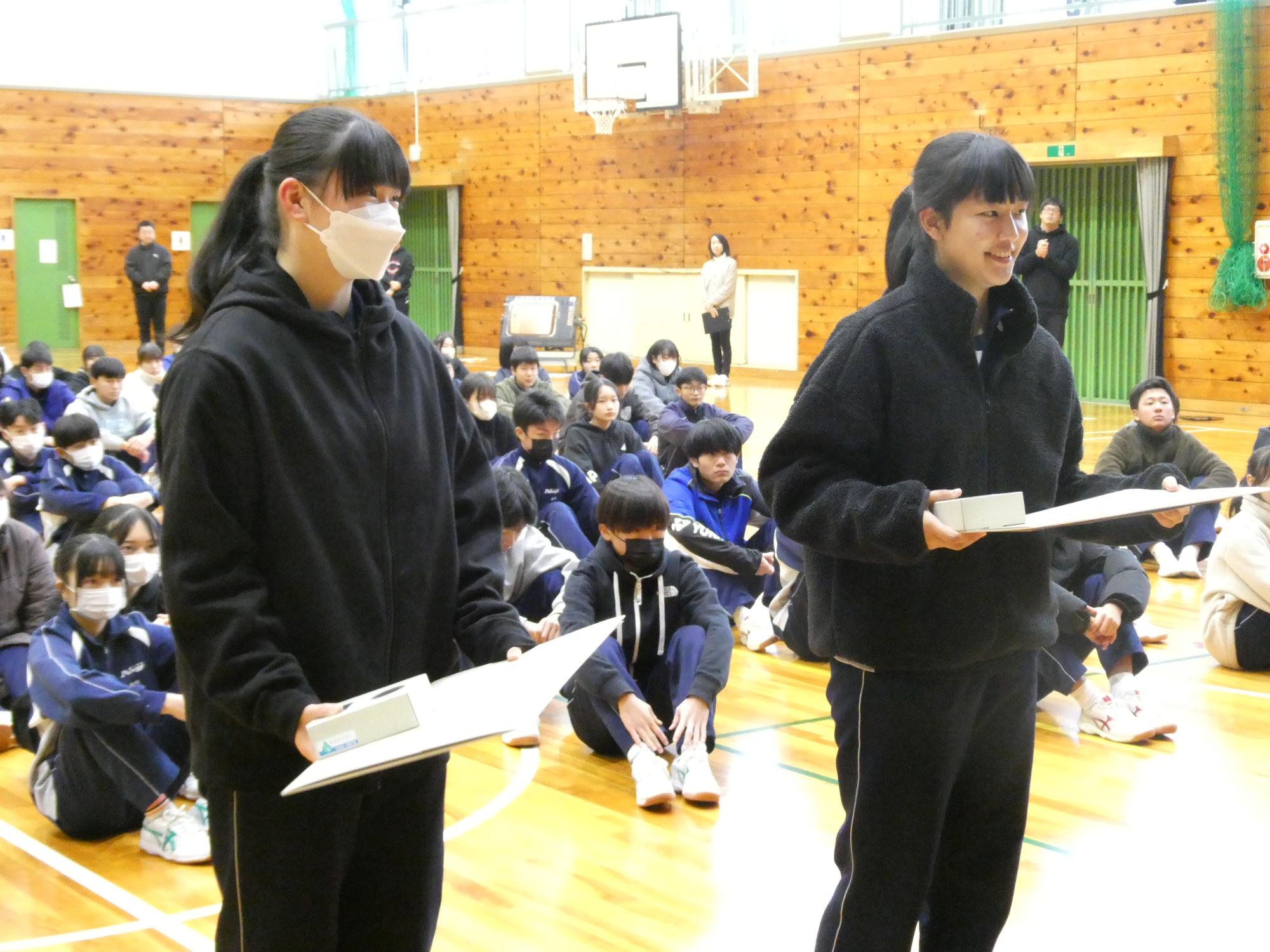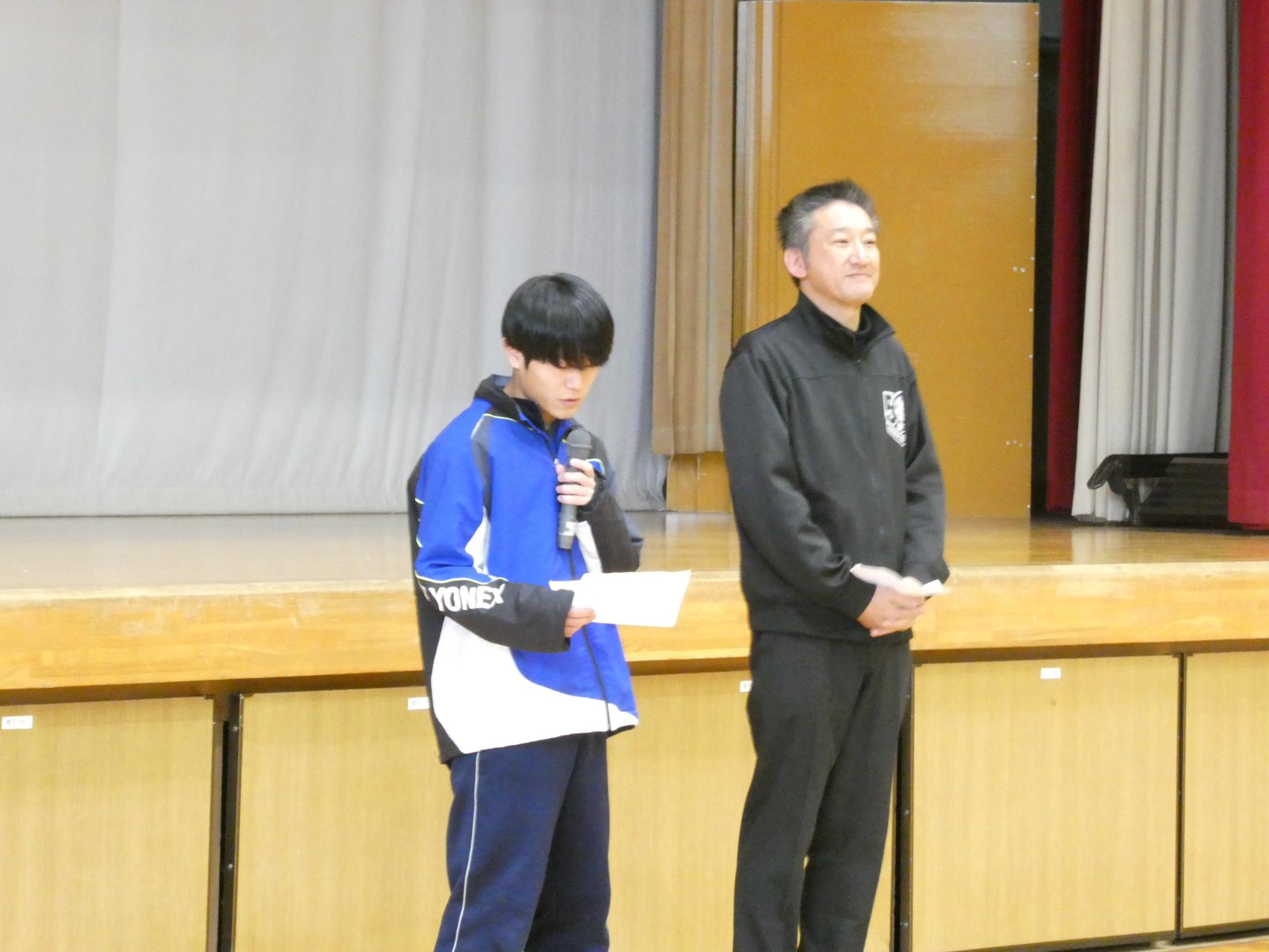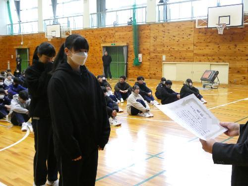 生徒会長、生徒指導担当からの話、そして、表彰伝達。二人の3年生に表彰状とメダルを伝達しました。